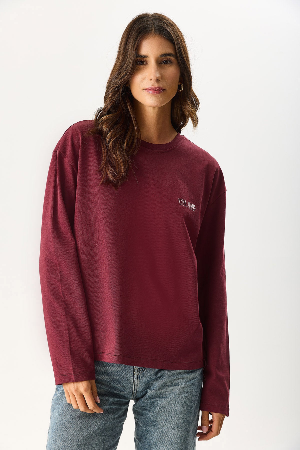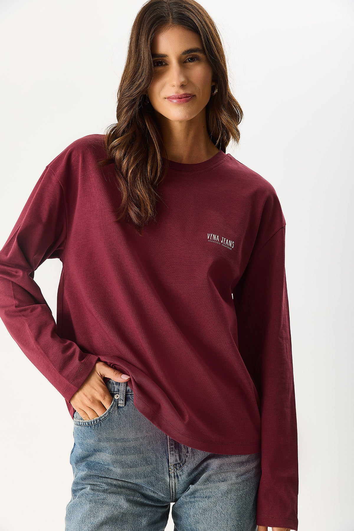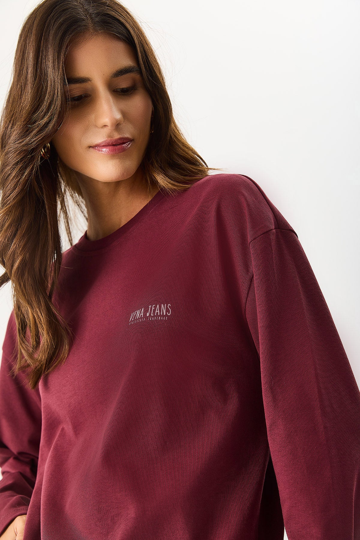 Kadın Bisiklet Yaka Logo Baskılı Uzun Kollu Tişört %100 Pamuk - Bordo