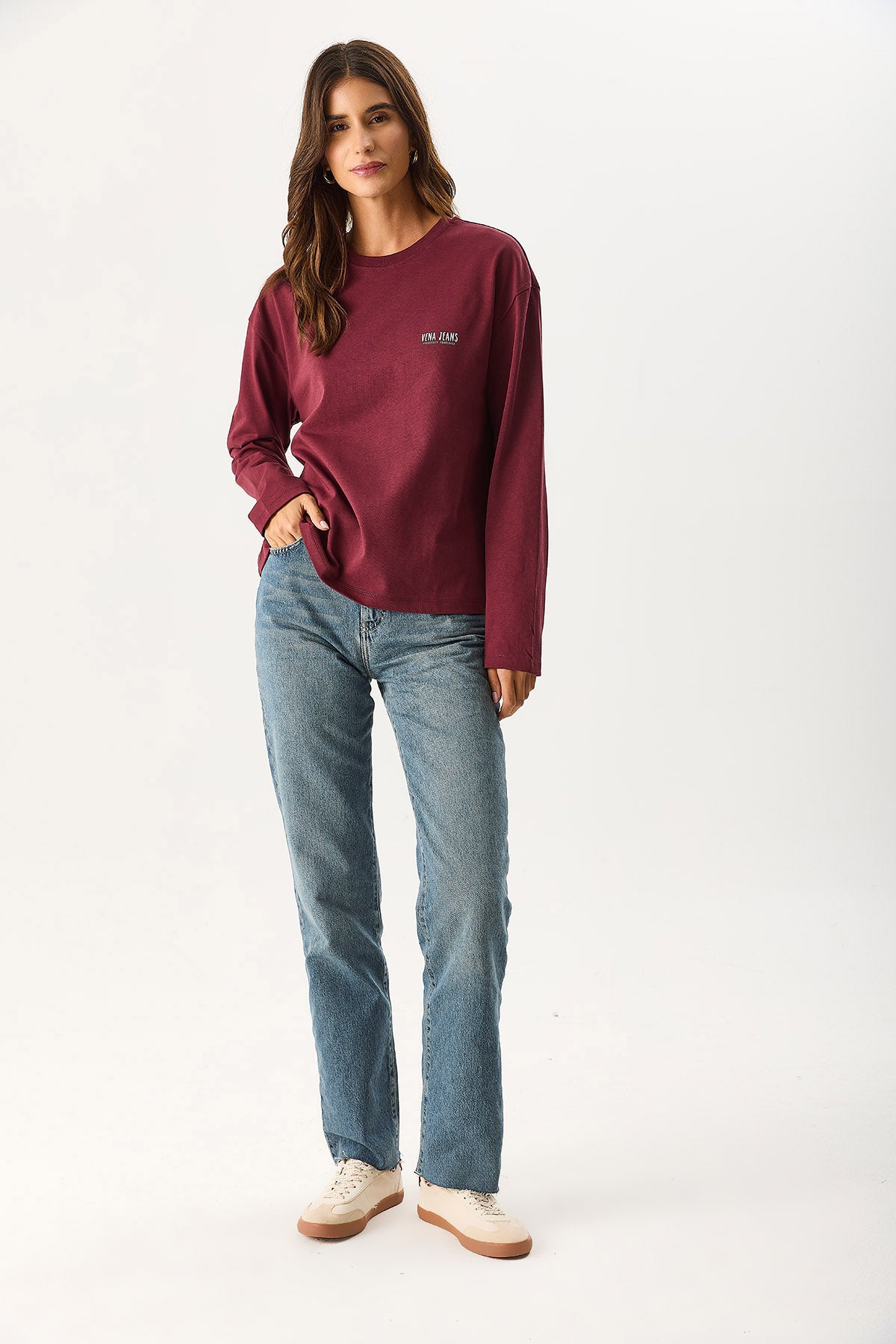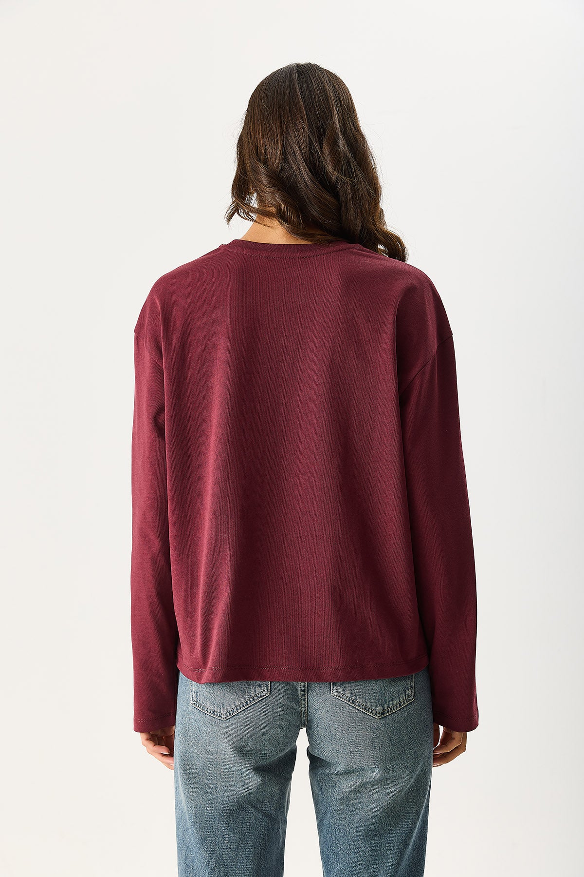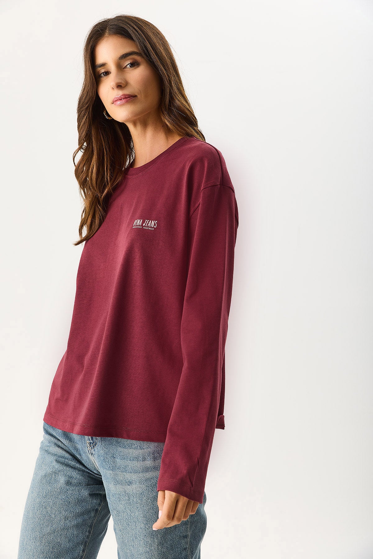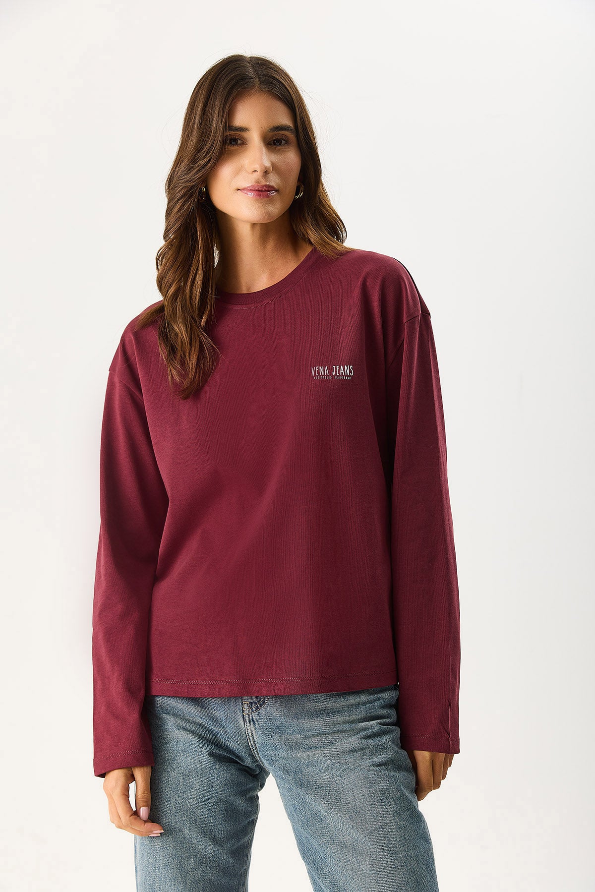 Kadın Bisiklet Yaka Logo Baskılı Uzun Kollu Tişört %100 Pamuk - Bordo