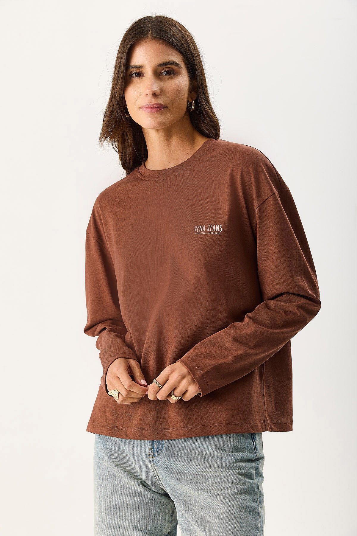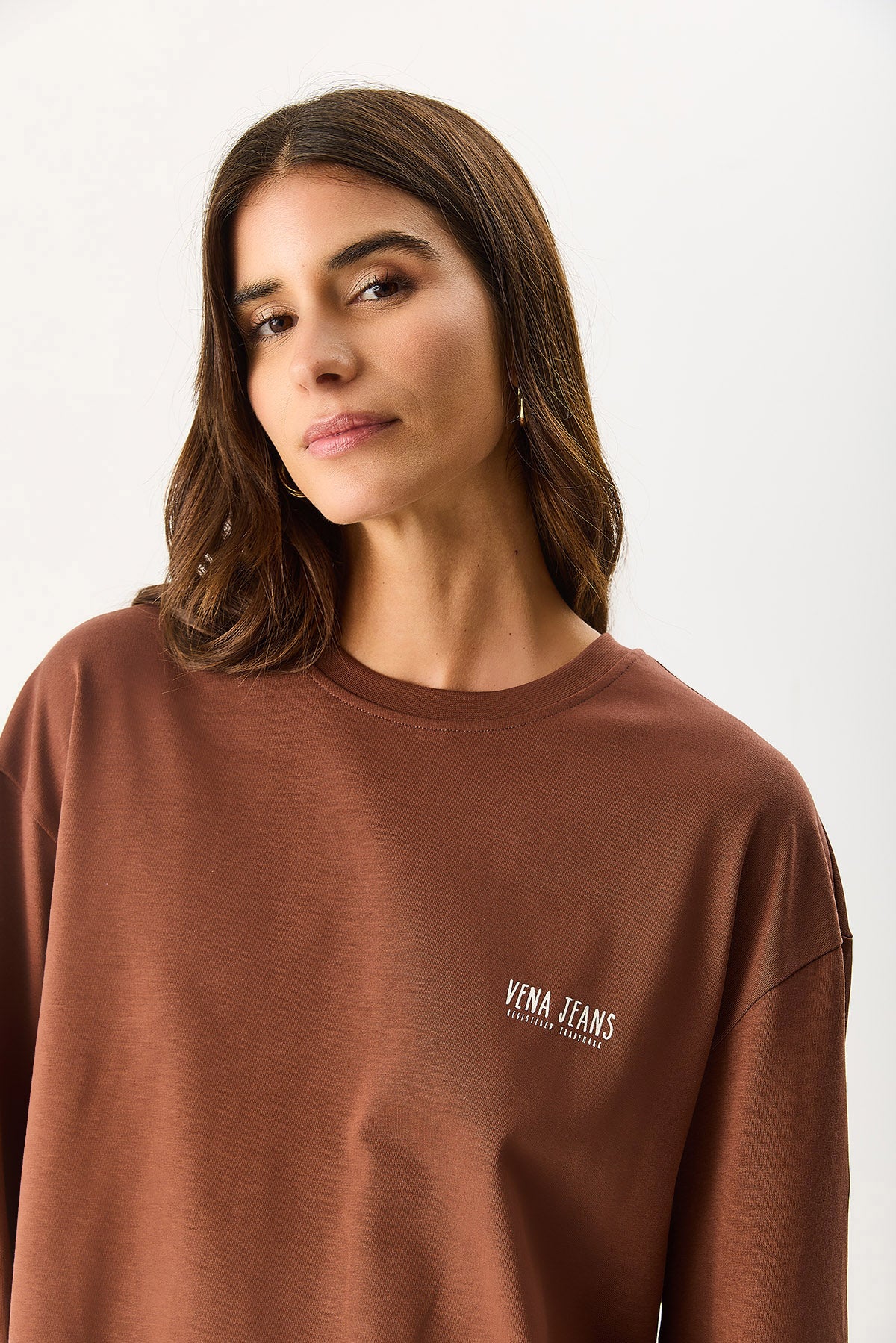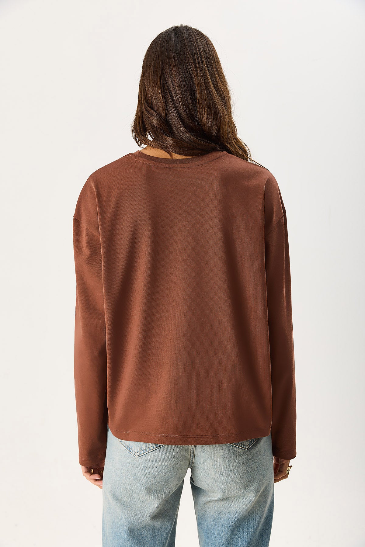Kadın Bisiklet Yaka Logo Baskılı Uzun Kollu Tişört %100 Pamuk - Kahverengi