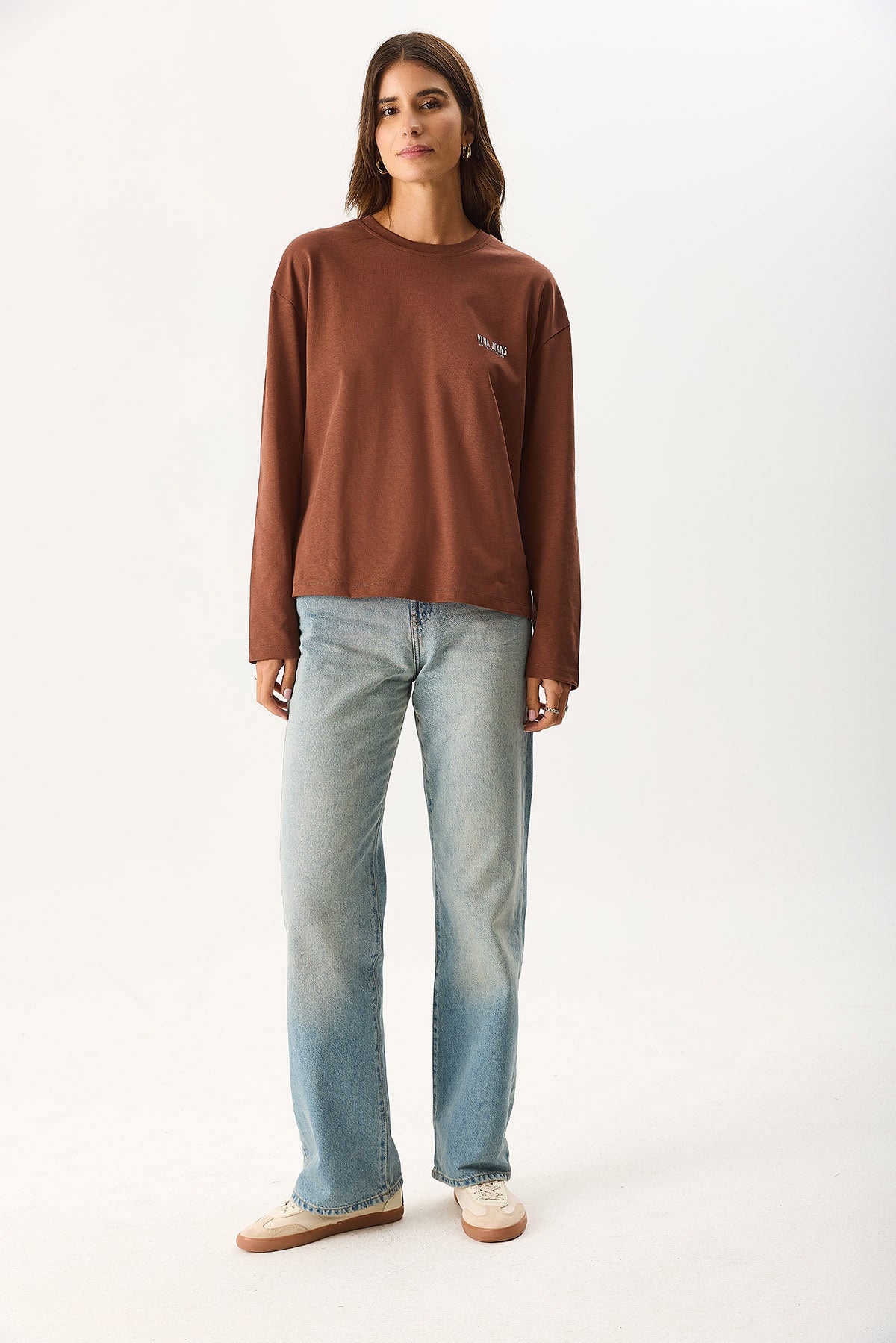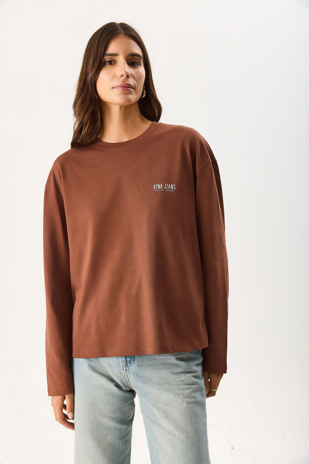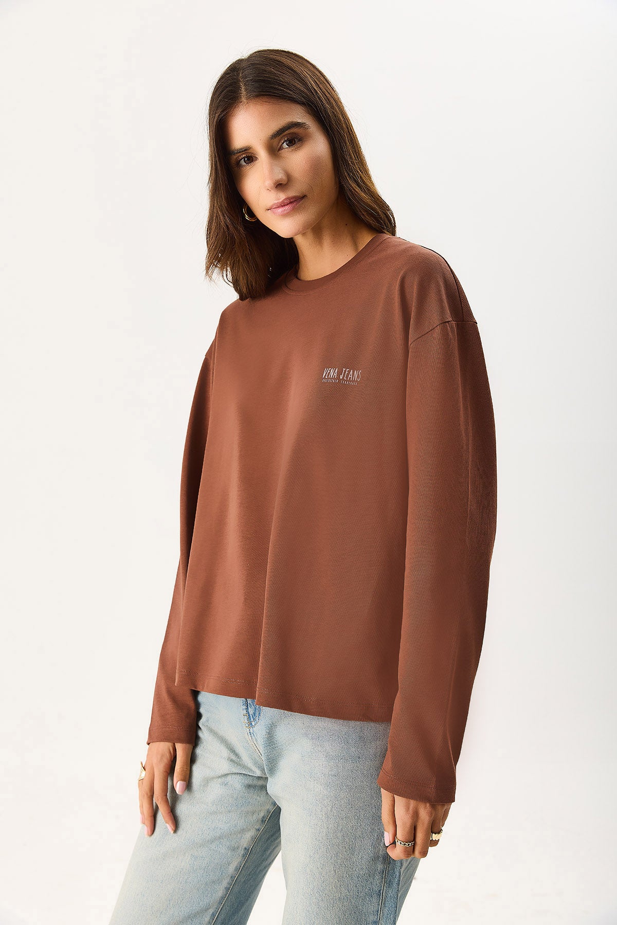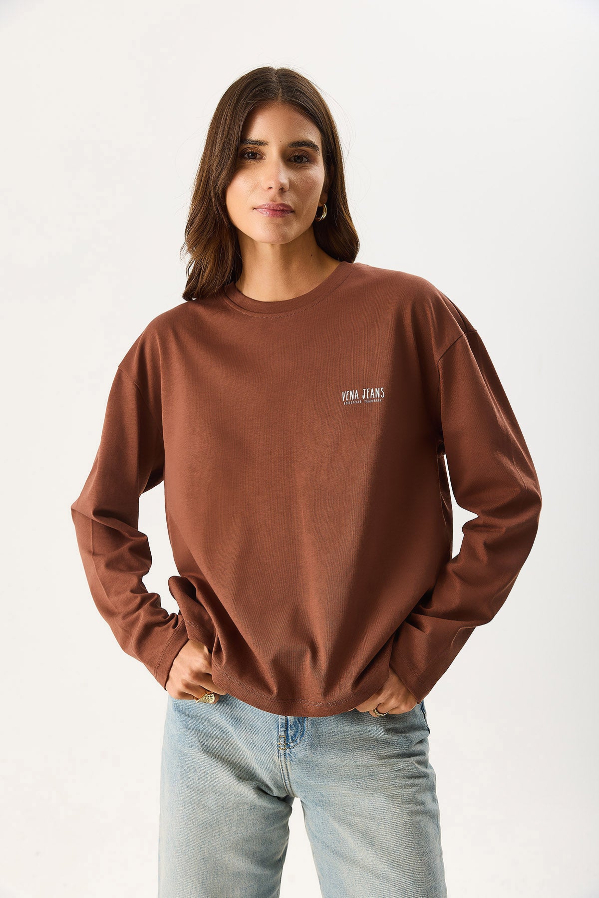 Kadın Bisiklet Yaka Logo Baskılı Uzun Kollu Tişört %100 Pamuk - Kahverengi