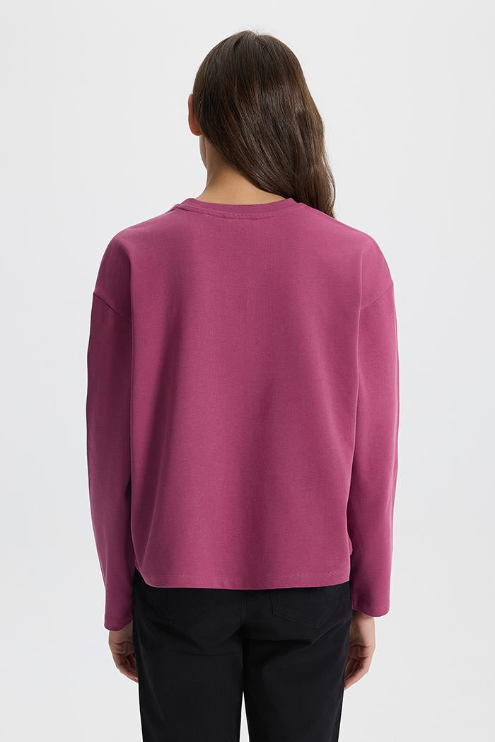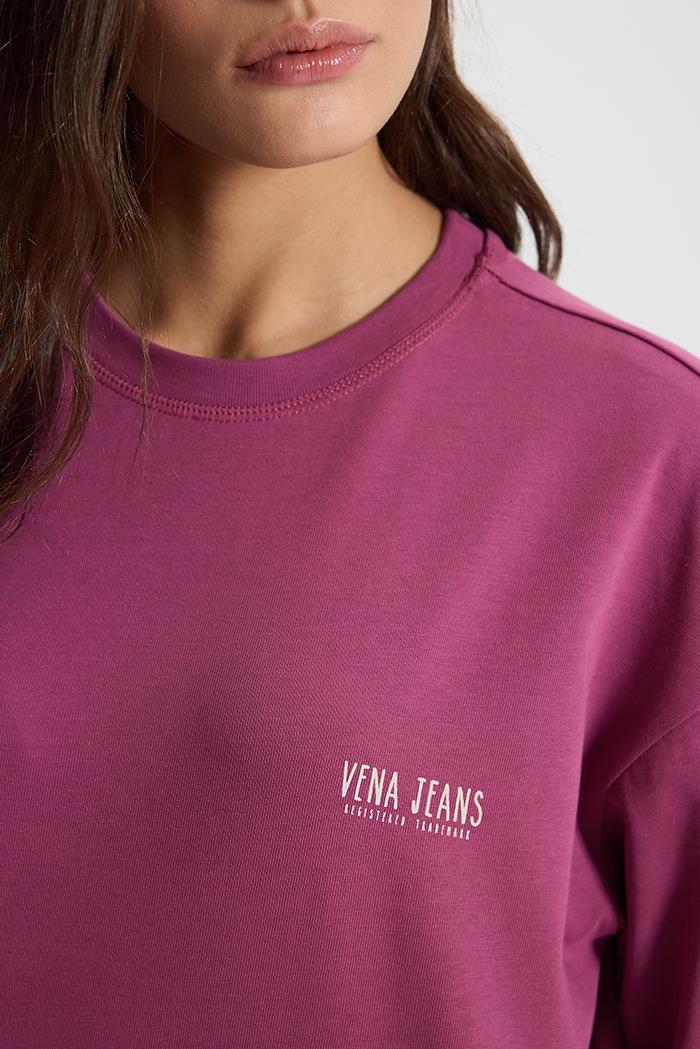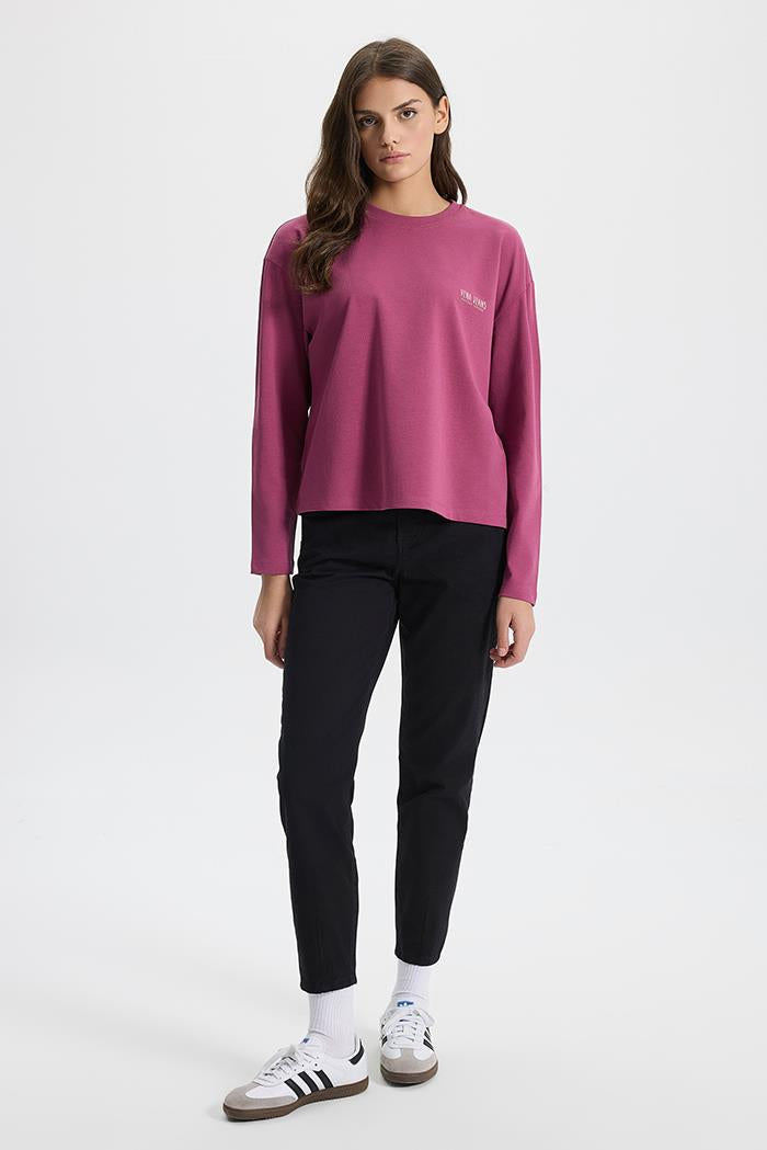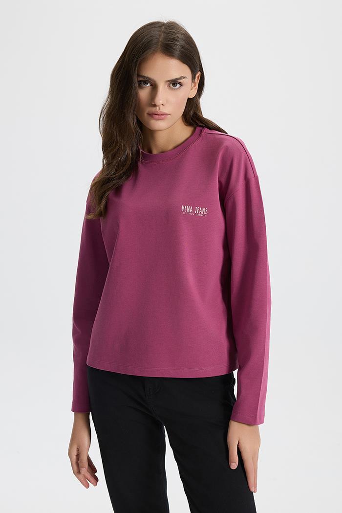 Kadın Bisiklet Yaka Logo Baskılı Uzun Kollu Tişört %100 Pamuk - Mürdüm