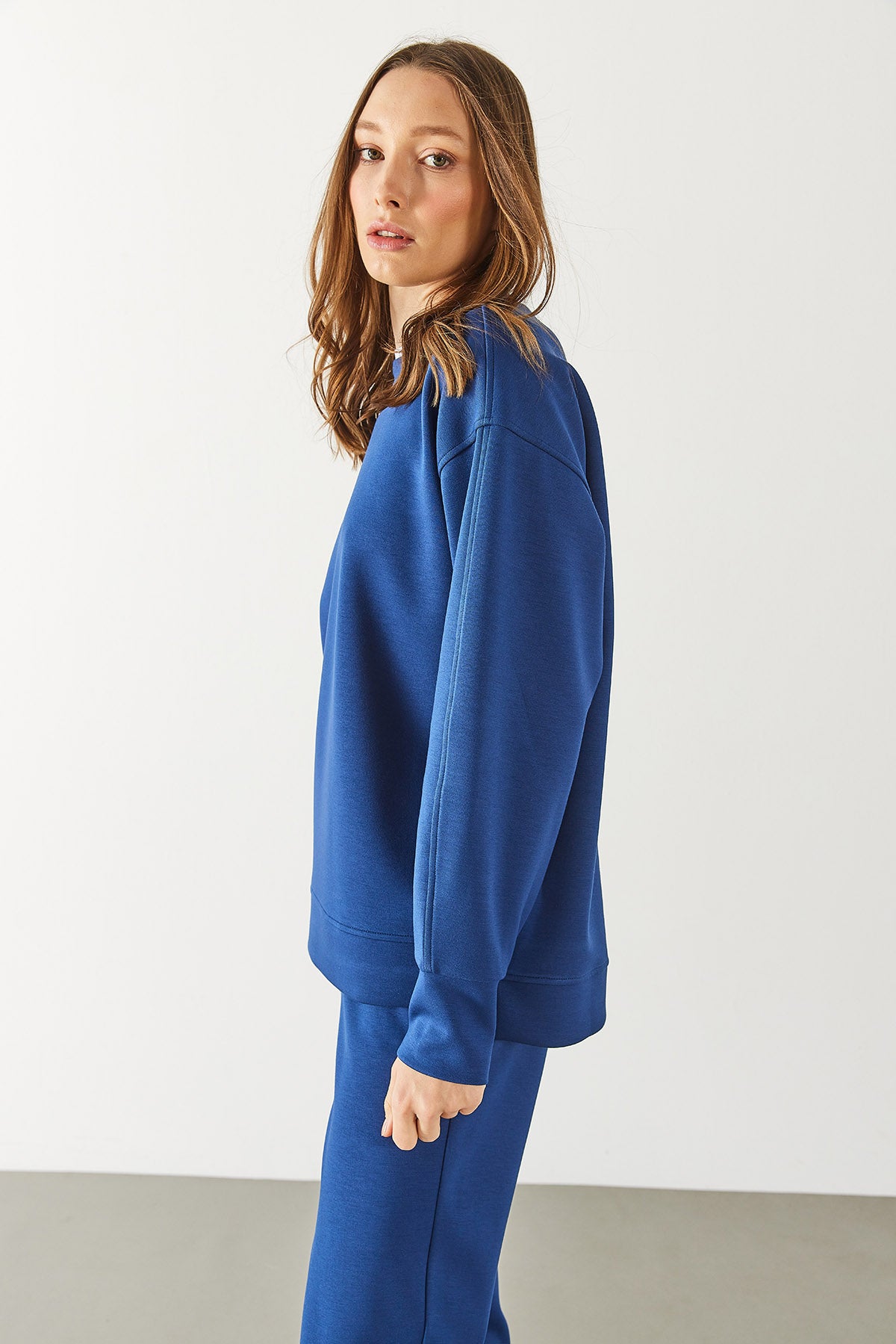 Kadın Bisiklet Yaka Yanı Yırtmaçlı Yumuşak Dokulu Sweatshirt (CUPRO) - Navy
