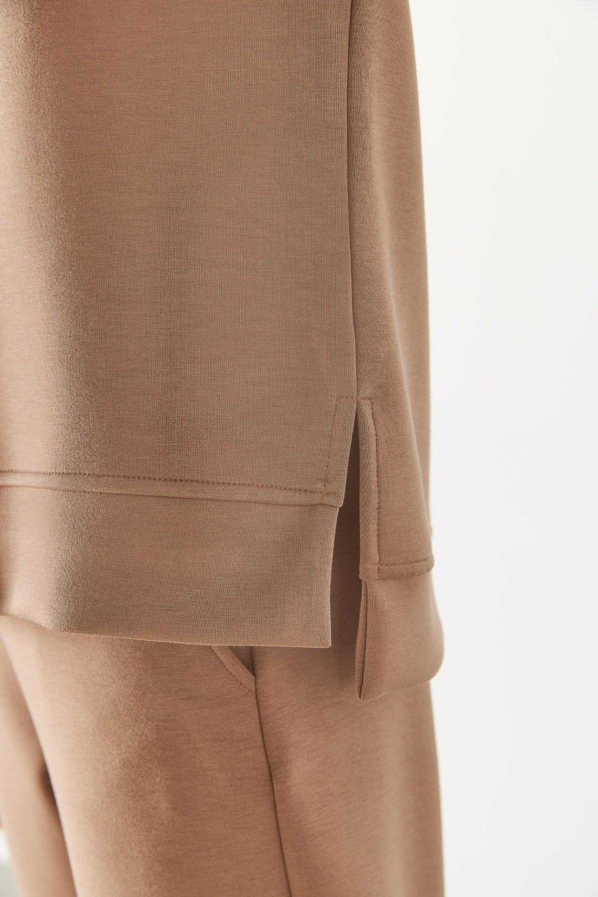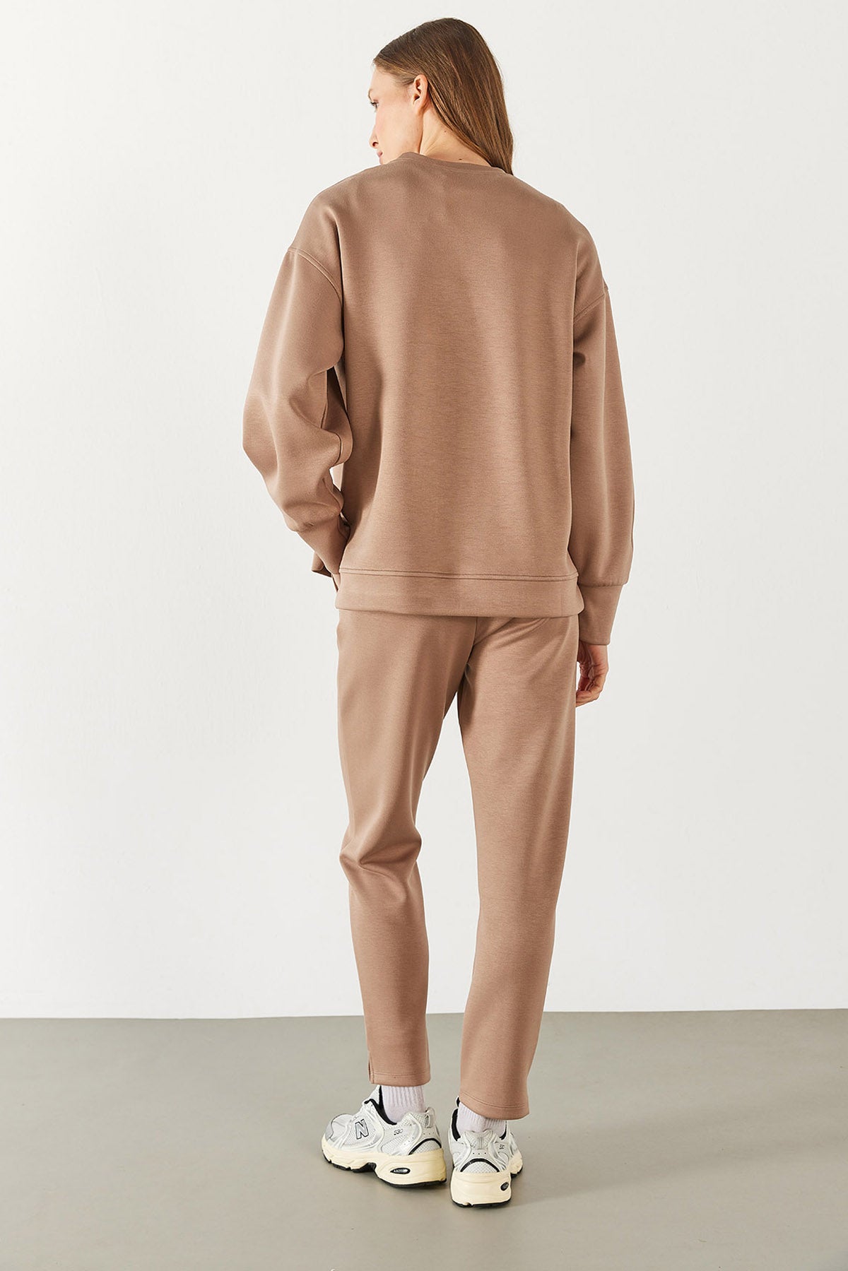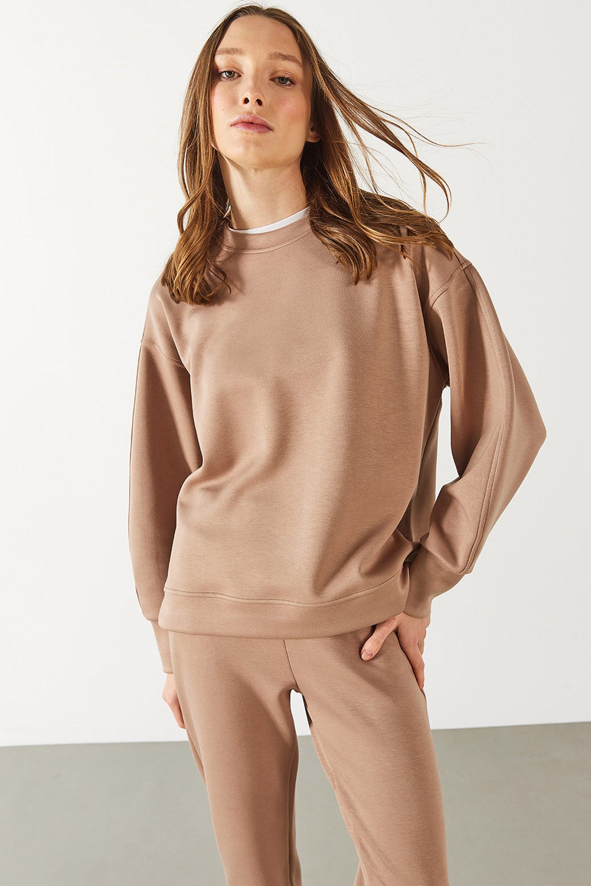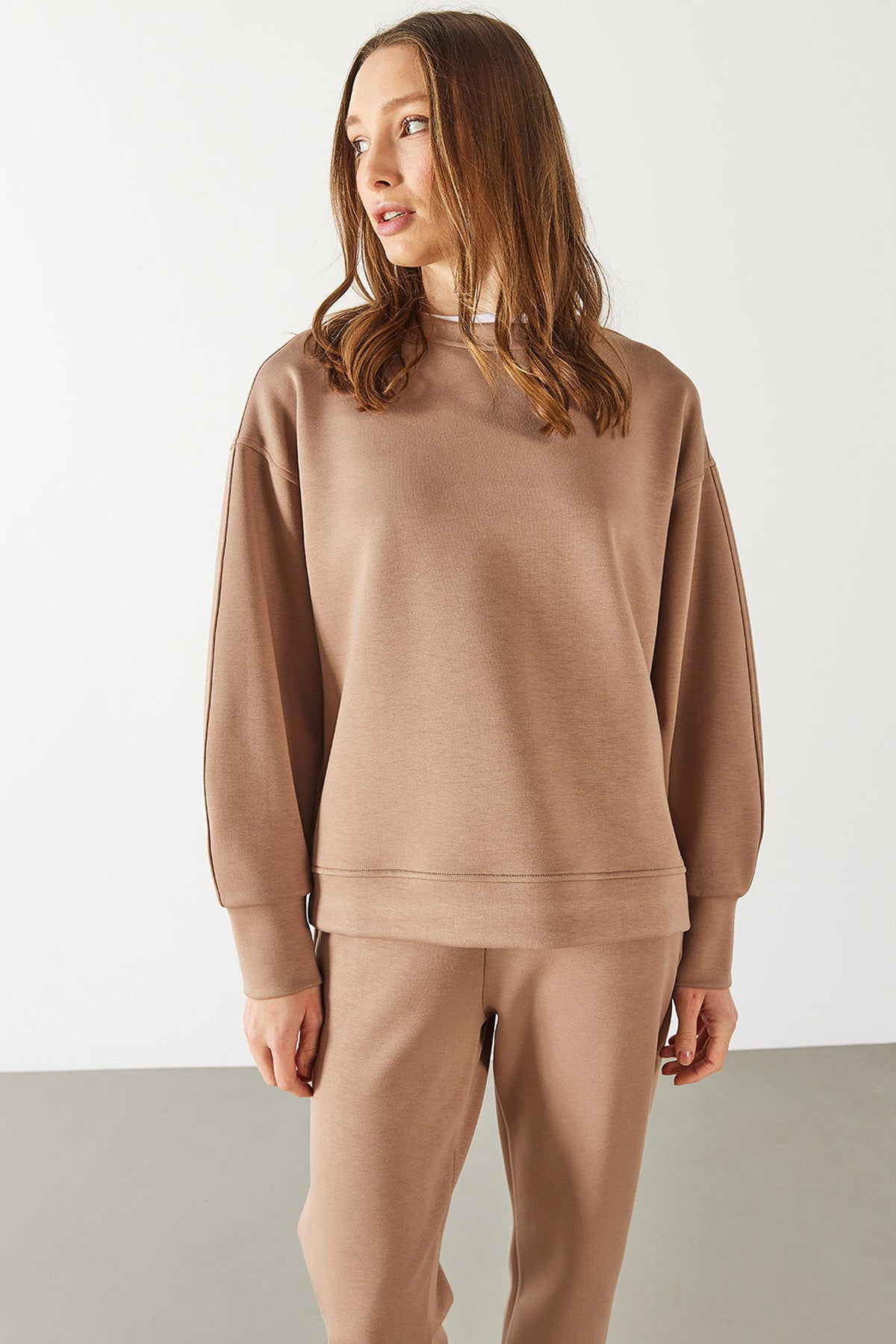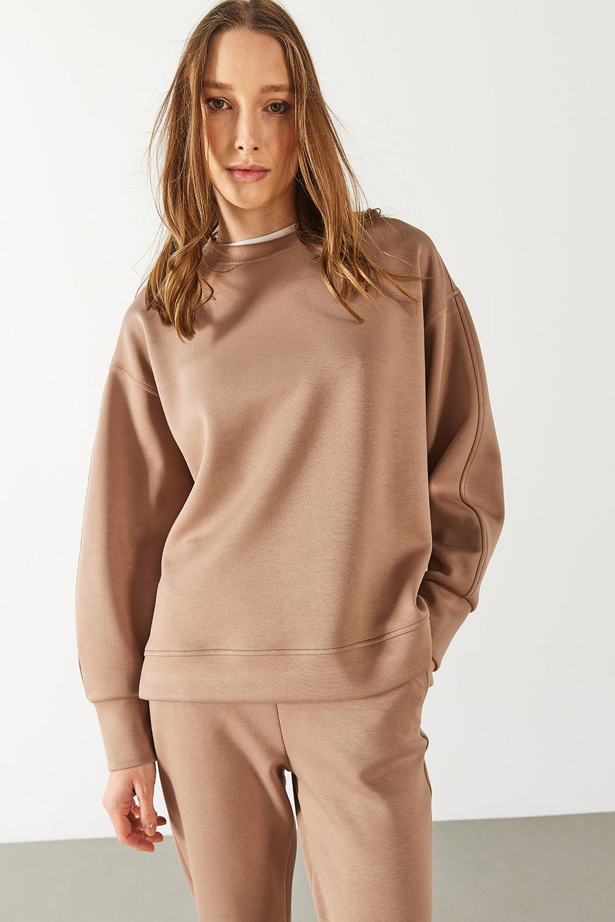 Kadın Bisiklet Yaka Yanı Yırtmaçlı Yumuşak Dokulu Sweatshirt (CUPRO) - Vizon