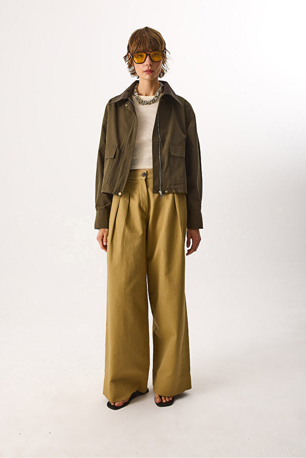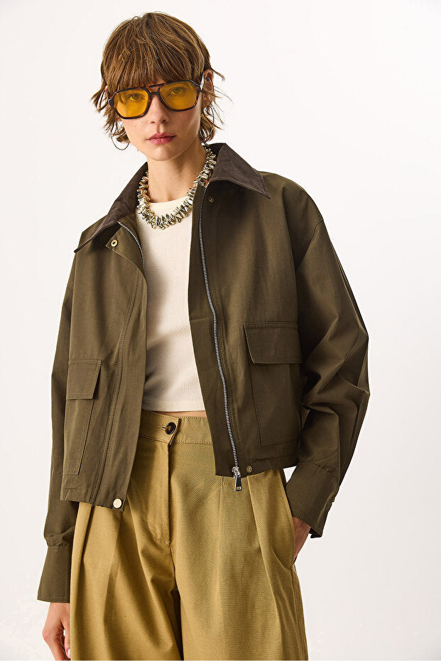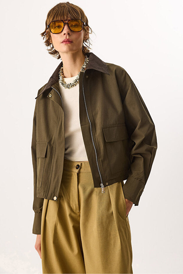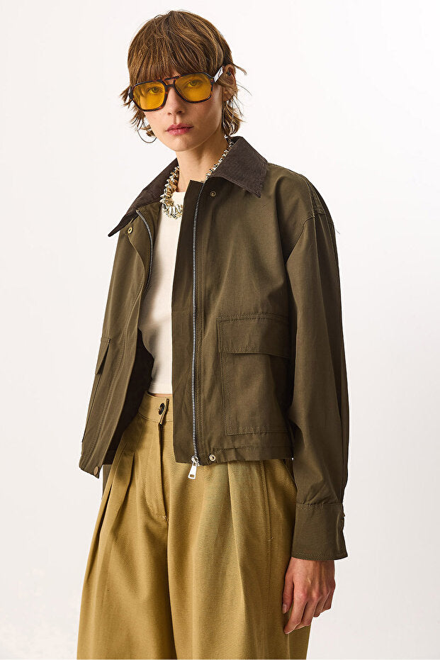 Kadın Kadife Yakalı Regular Fit Gabardin Ceket - Haki