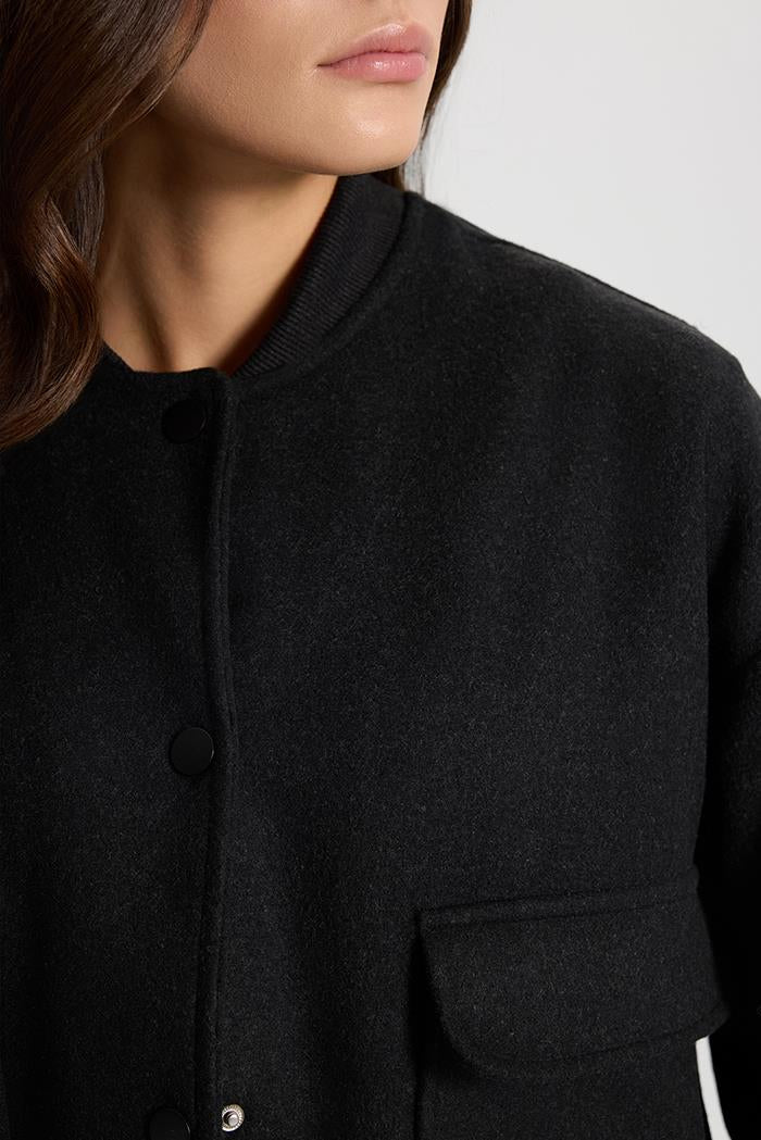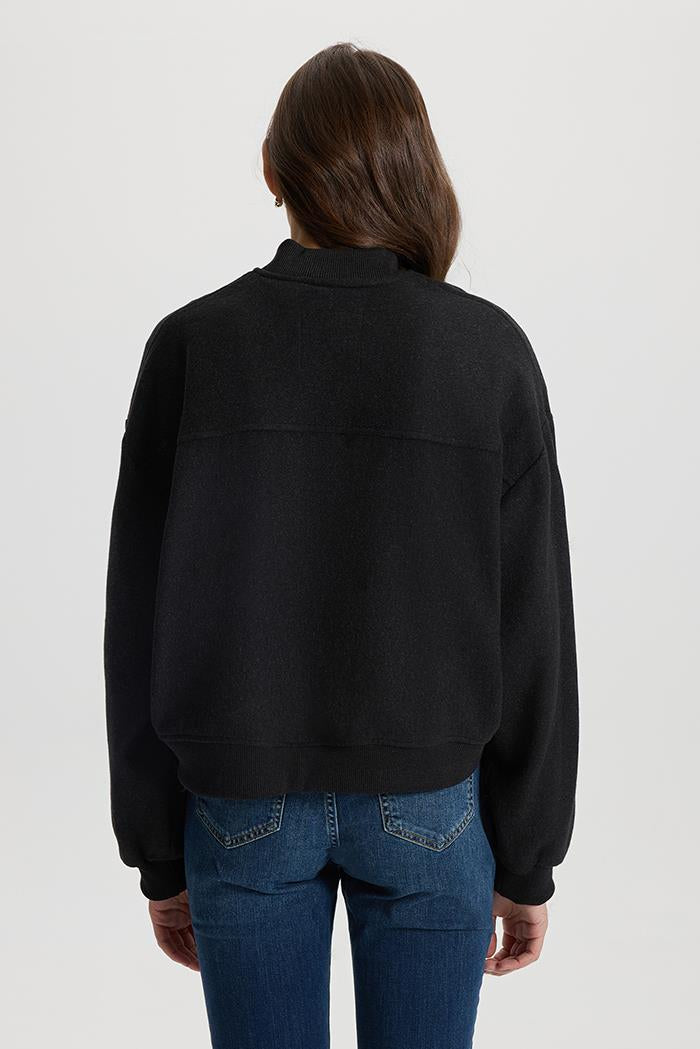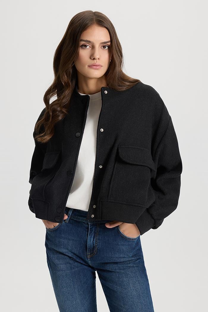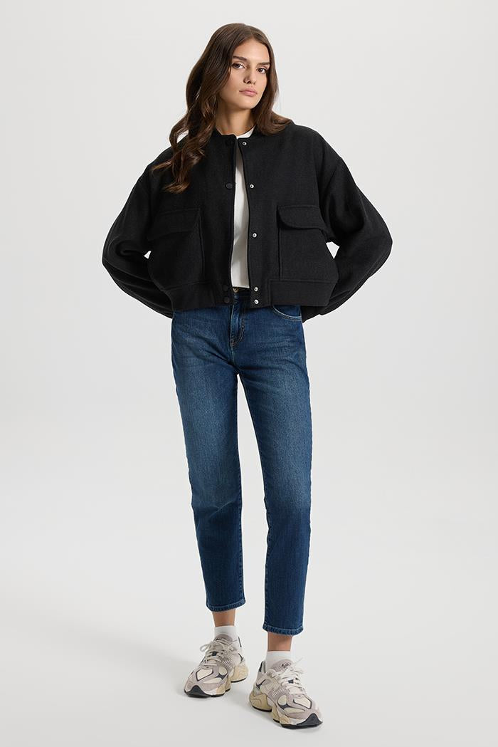 Bomber tarzı kesimiyle kısa ve sportif bir görünüm sunar.