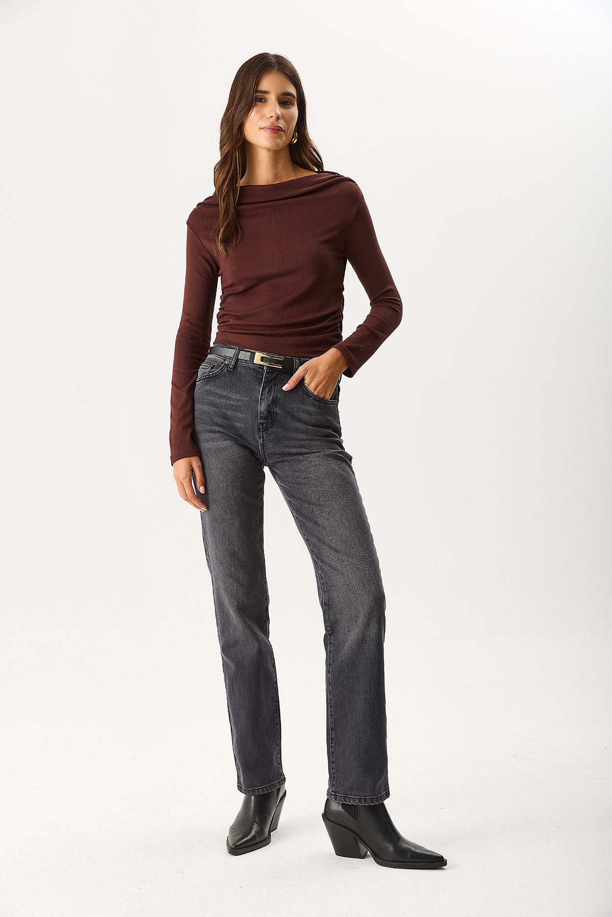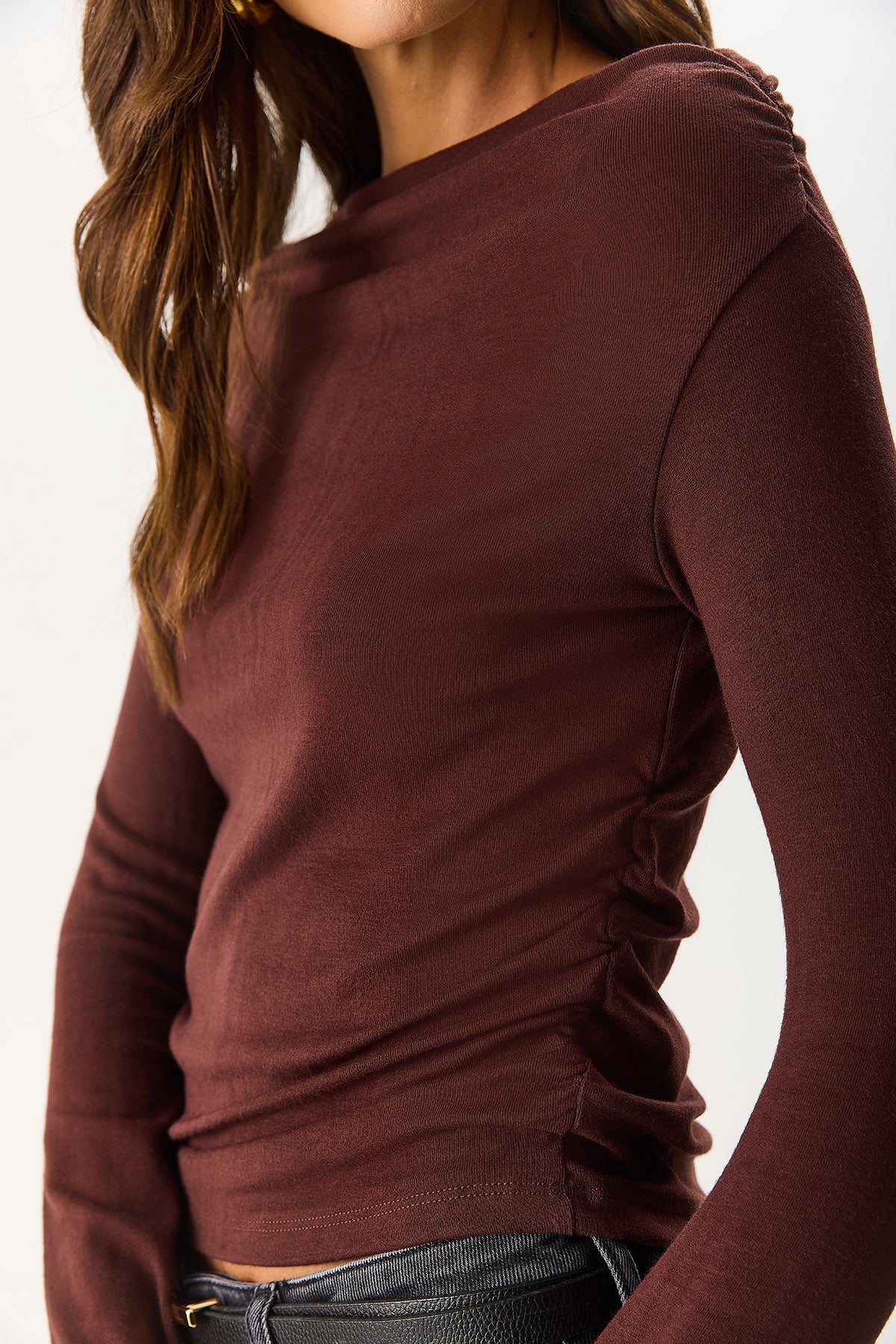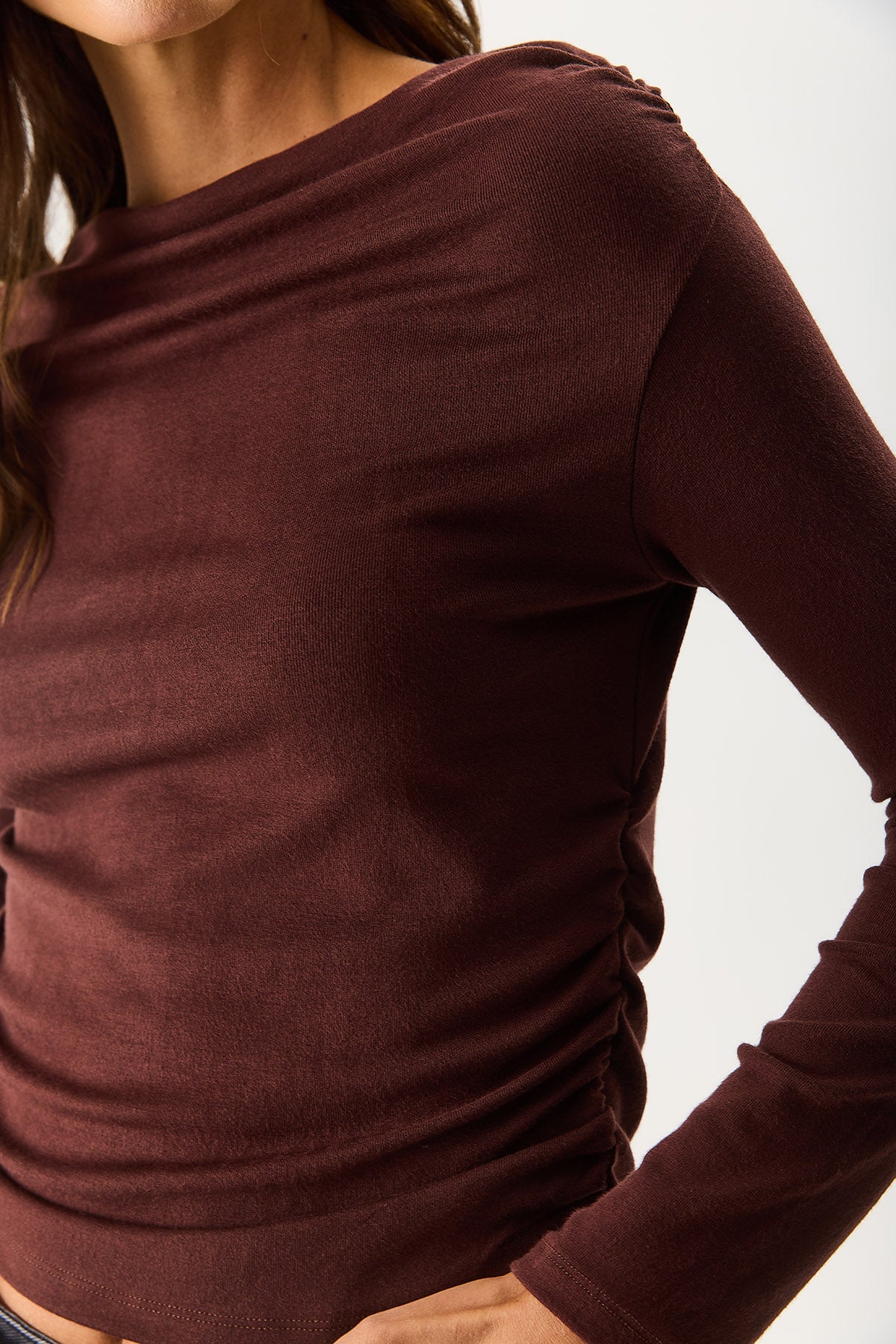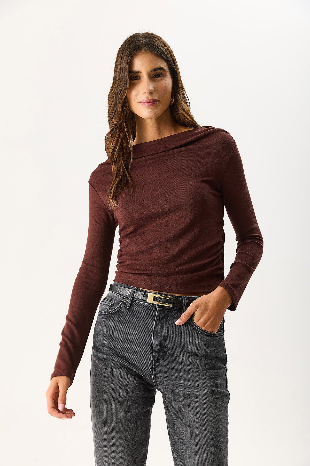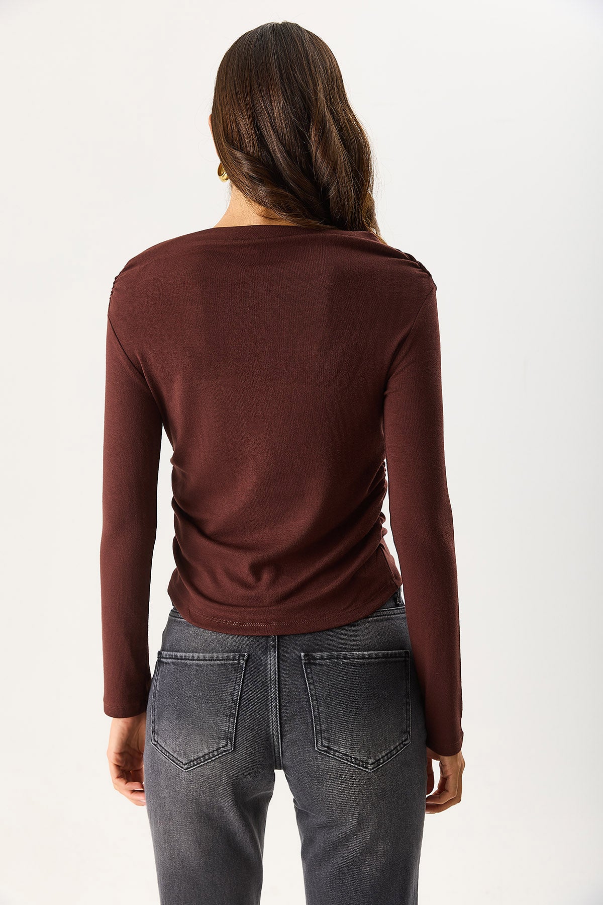Kadın Kayık Yaka Uzun Kollu Tişört %100 Pamuk - Kahverengi