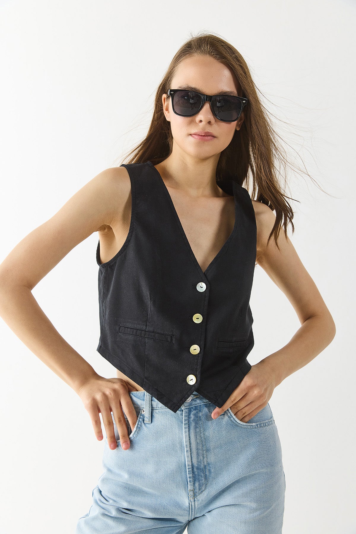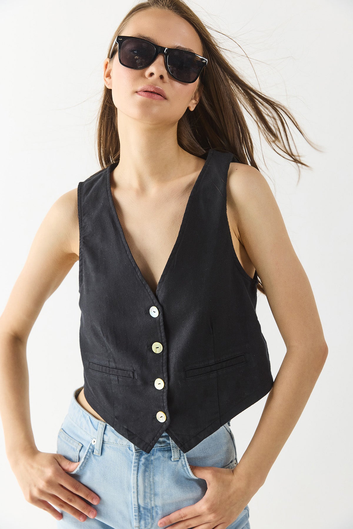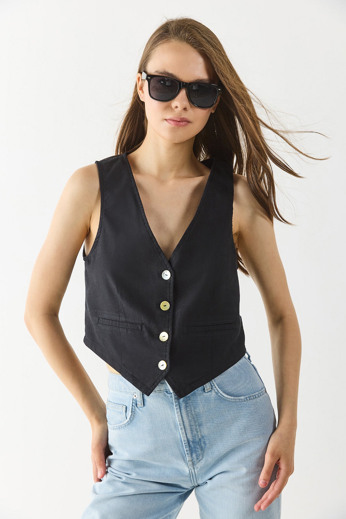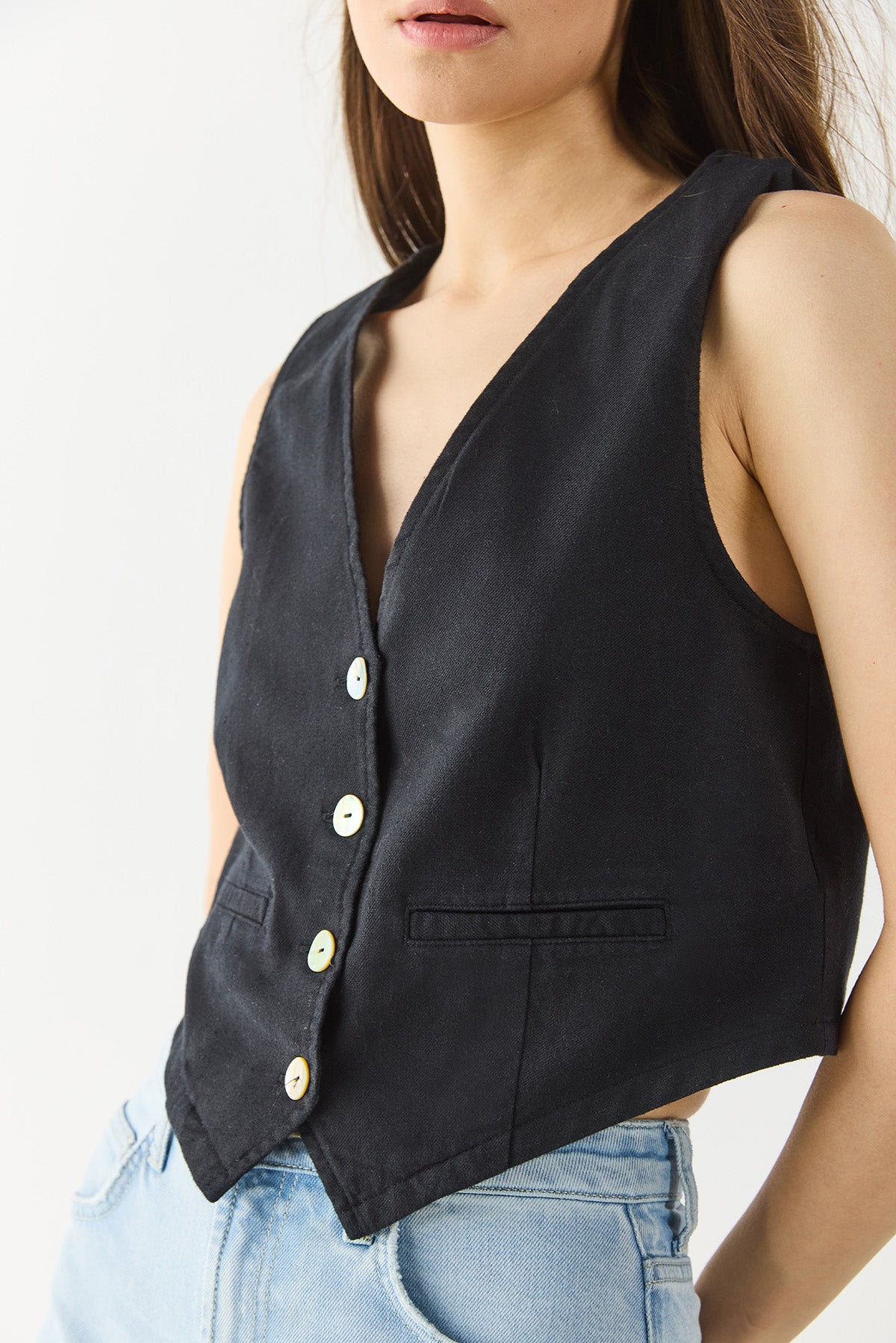 Kadın Keten Yelek Form Bluz - Siyah