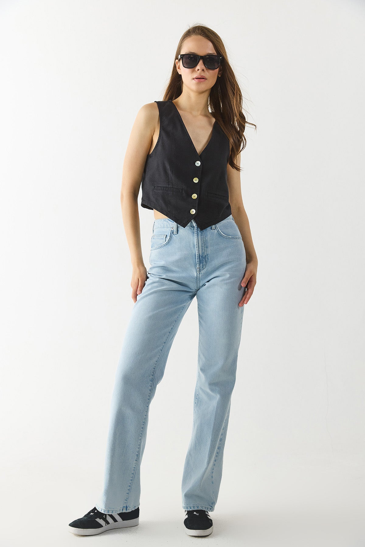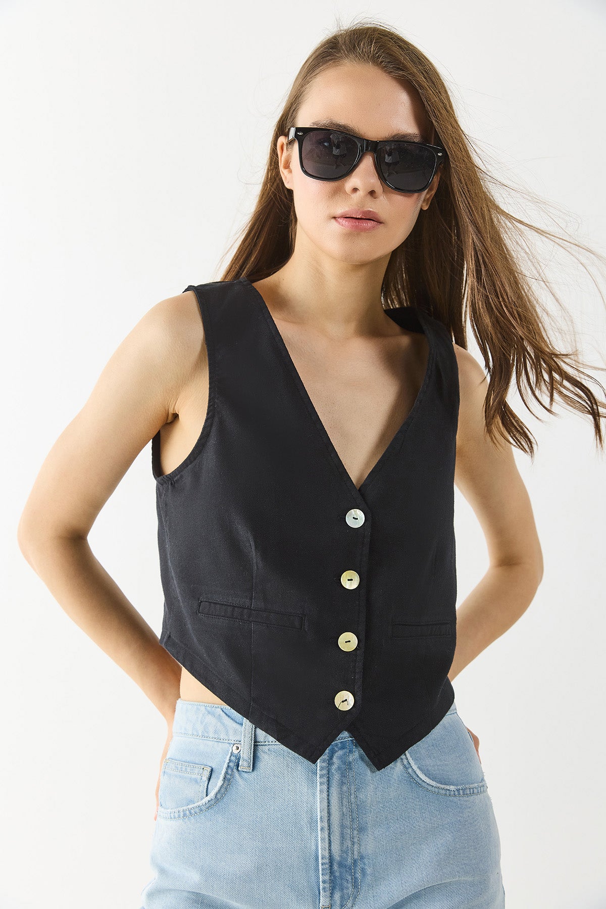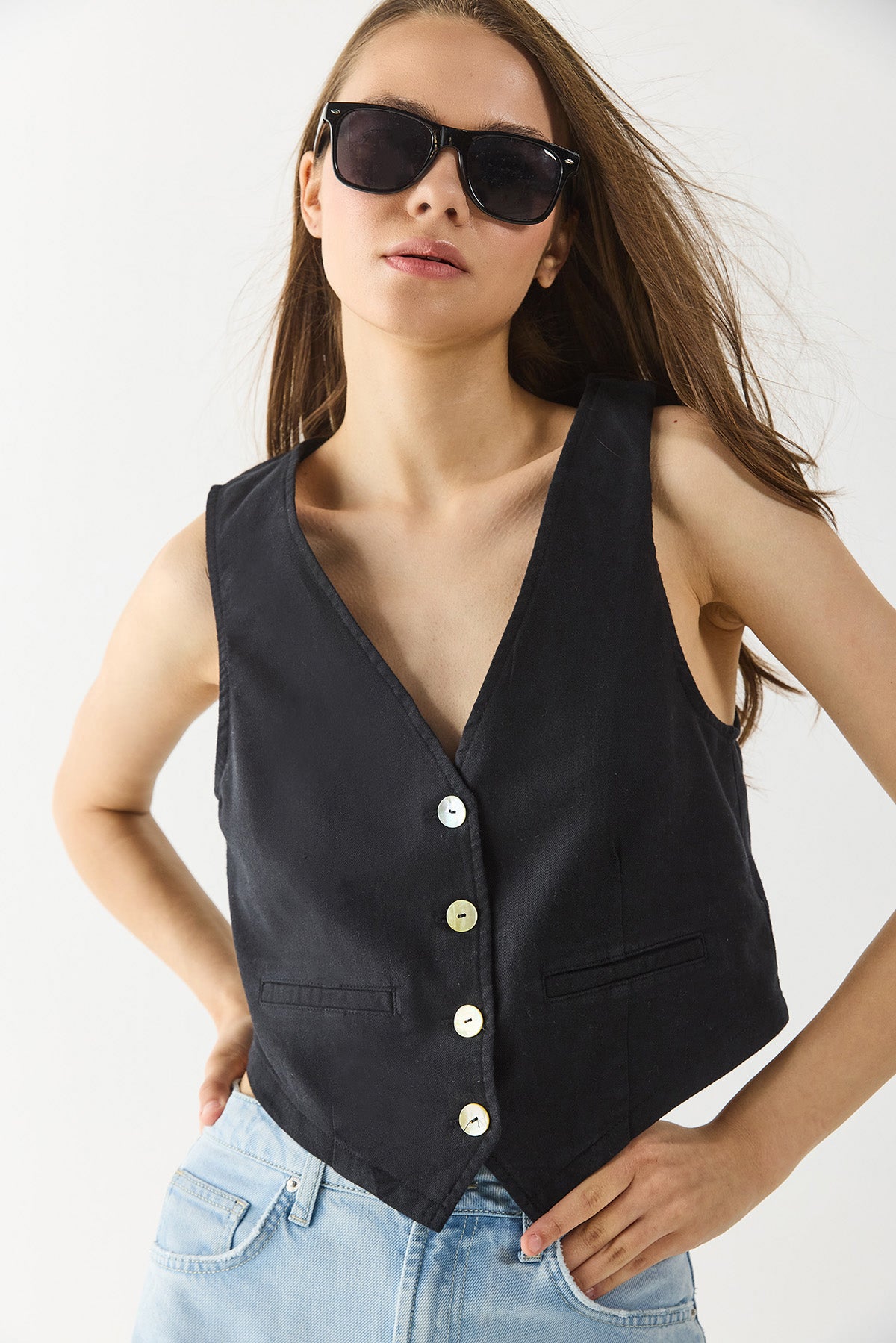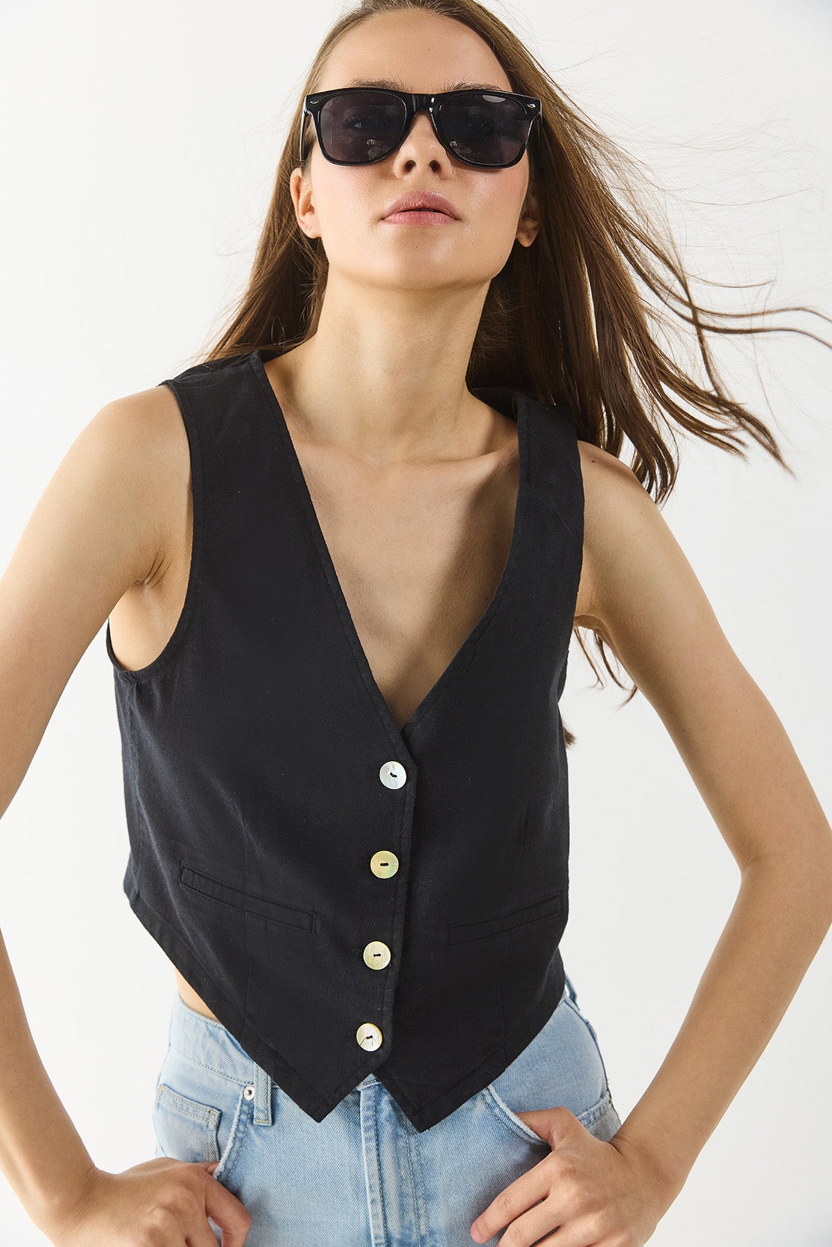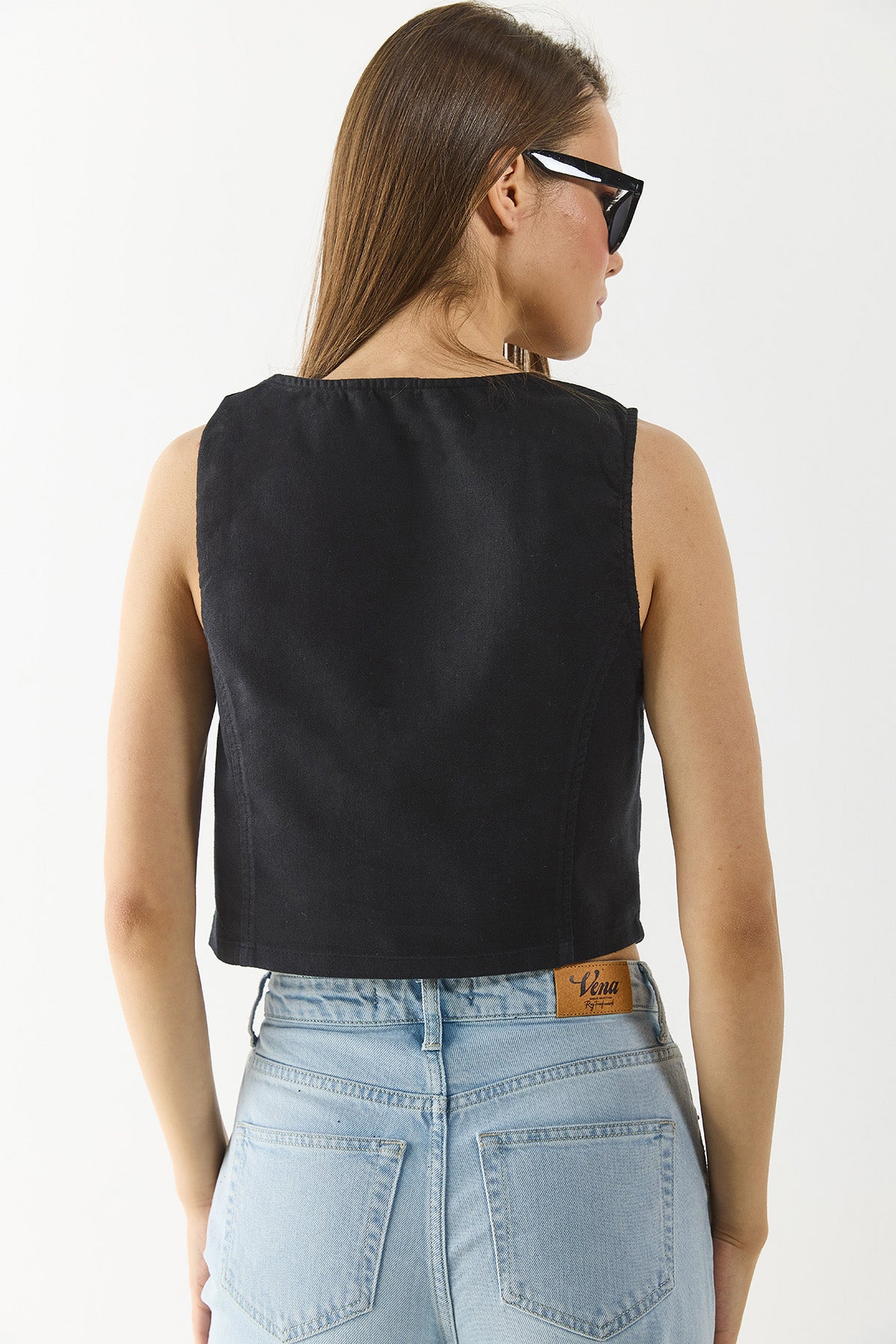 Kadın Keten Yelek Form Bluz - Siyah
