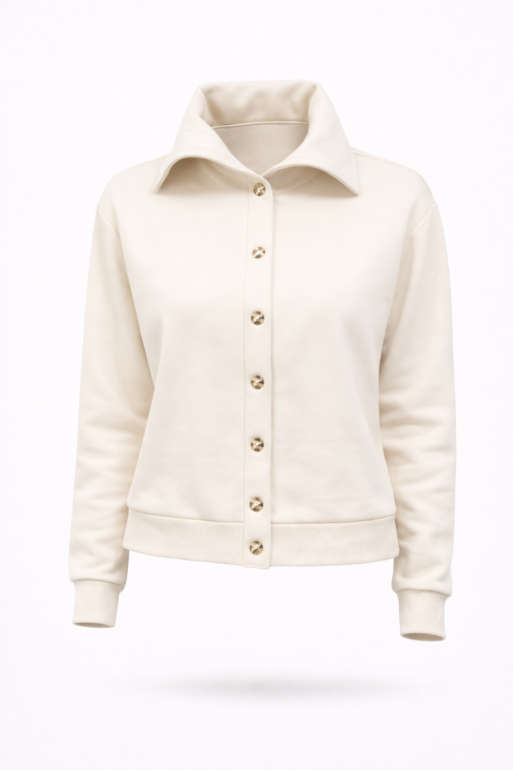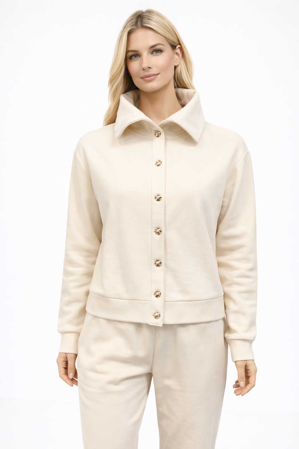 Kadın Önden Düğmeli Sweatshirt %100 Pamuk - Kemik