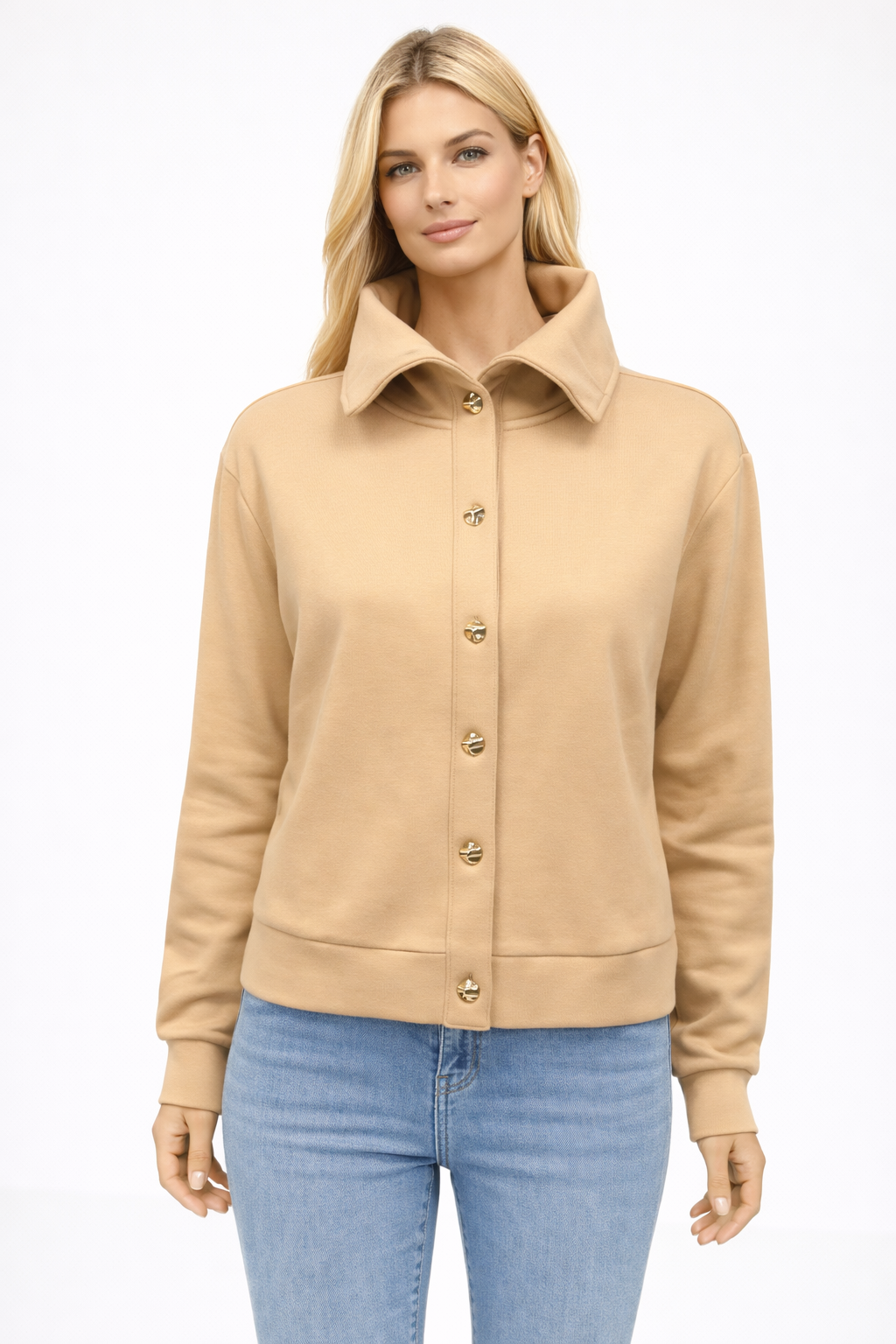 Kadın Önden Düğmeli Sweatshirt %100 Pamuk - Sarı