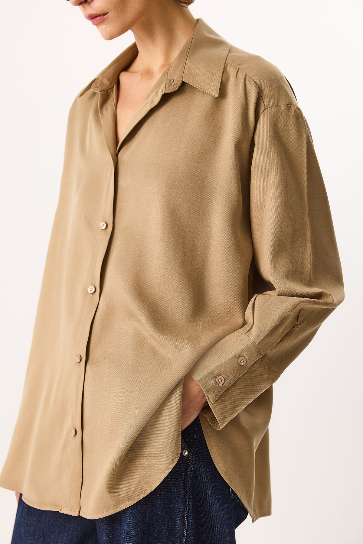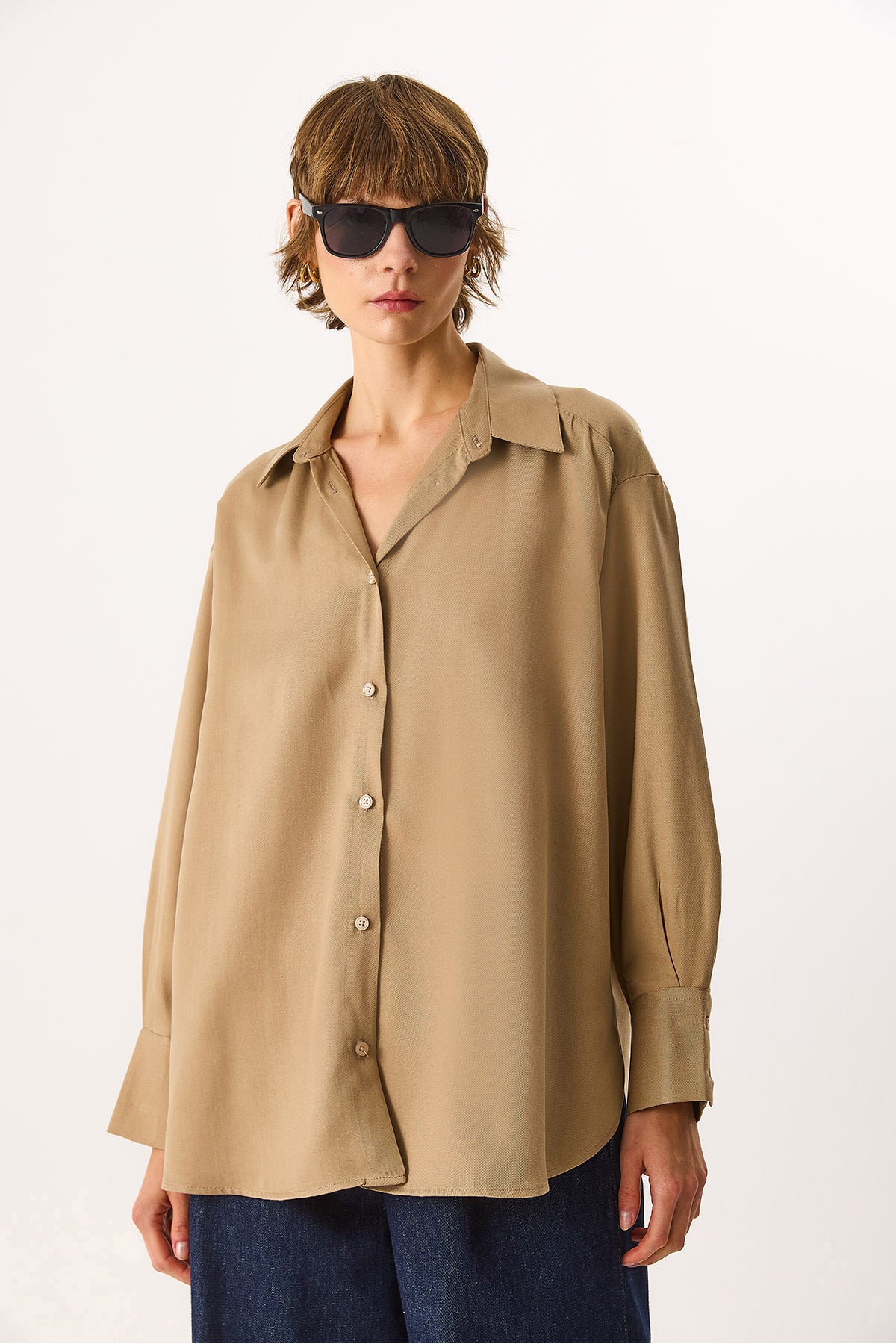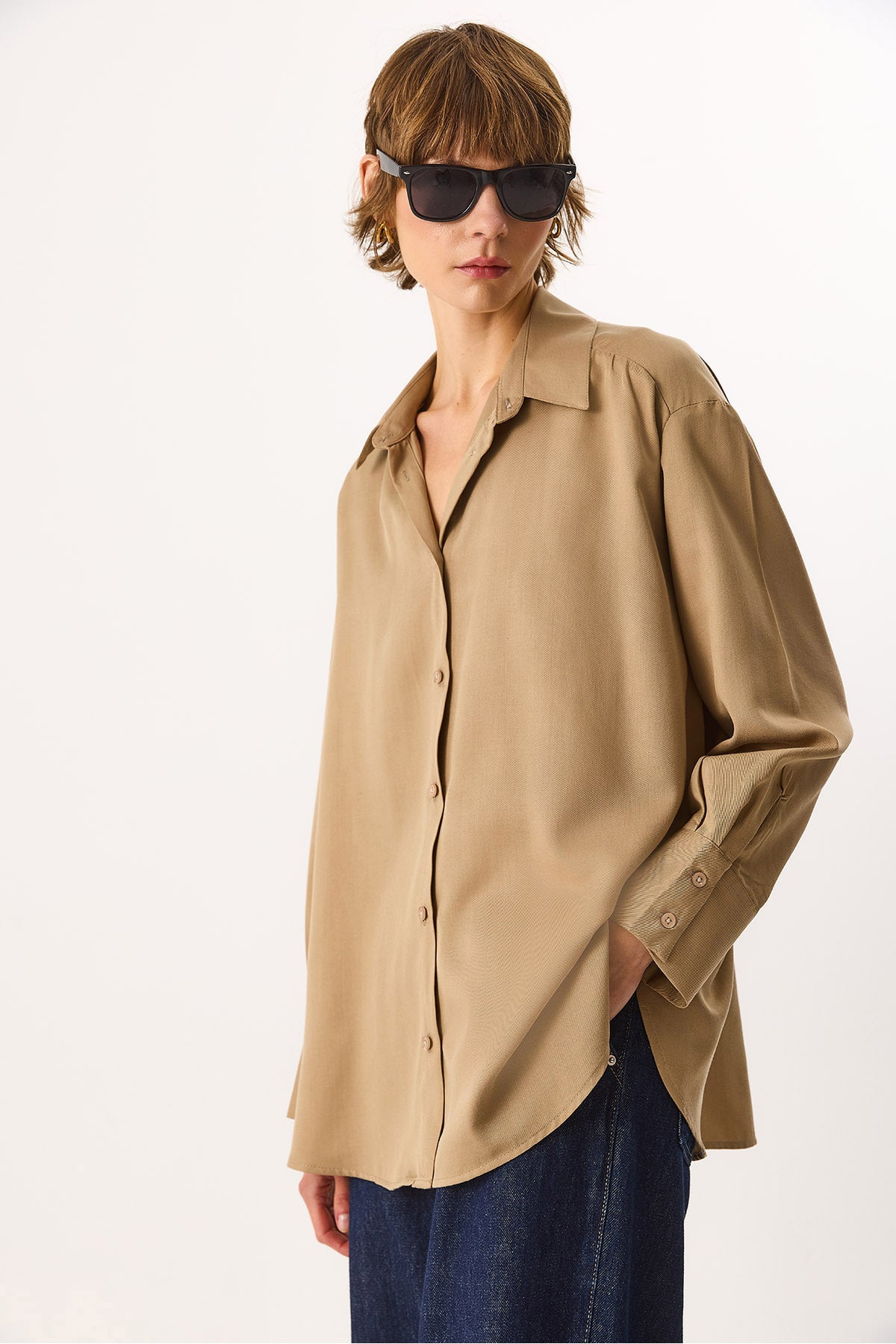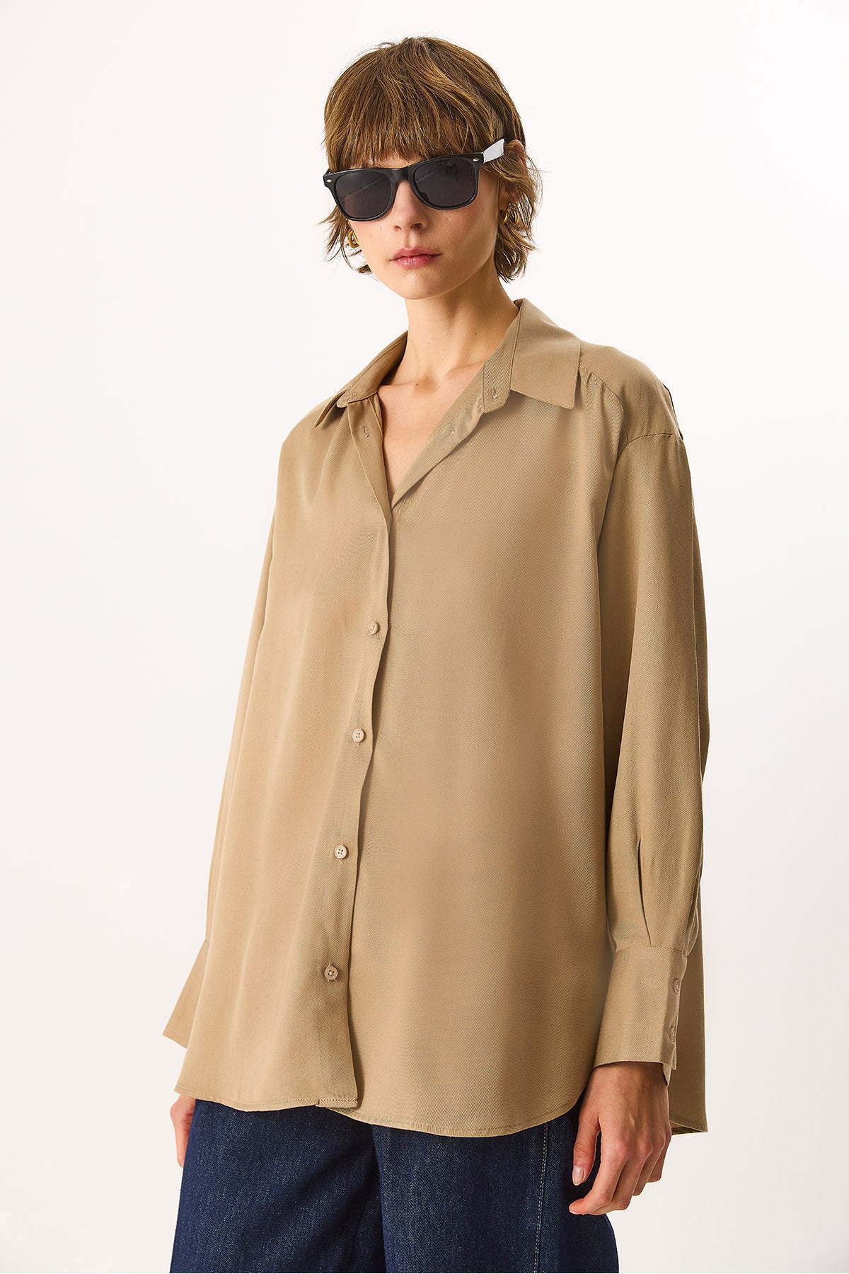 Kadın Oversize Lyocell Gömlek %100 Lyocell - Taş