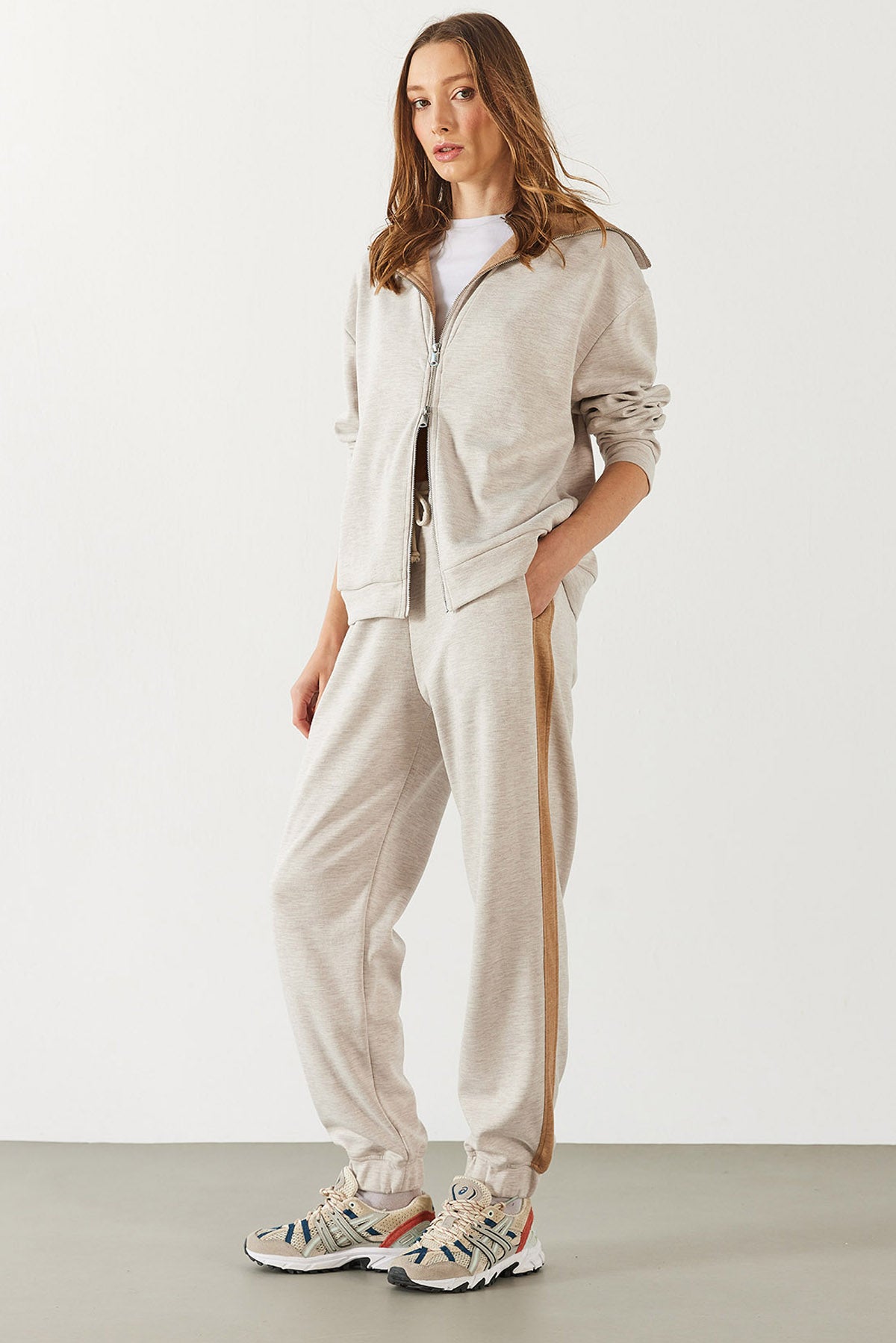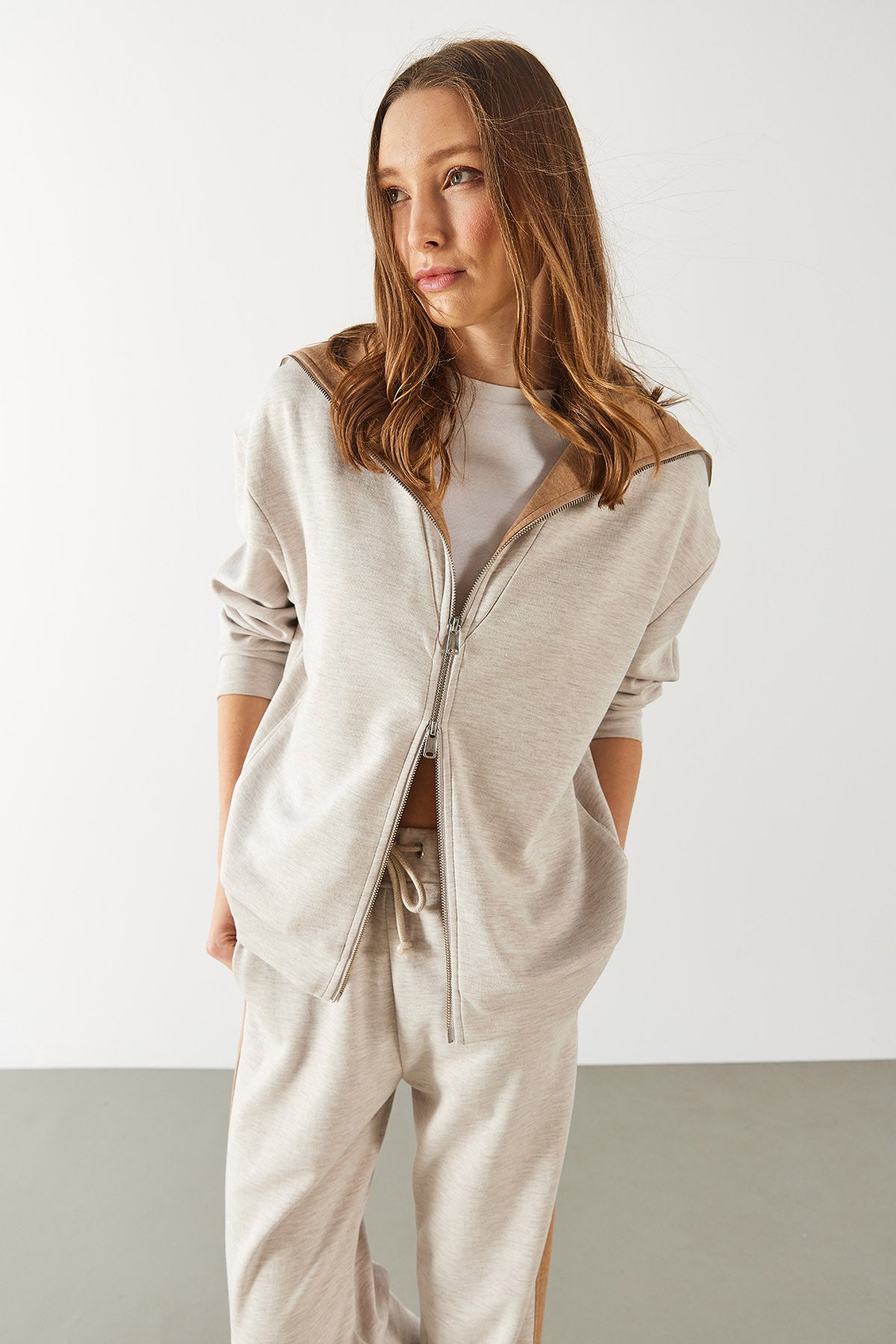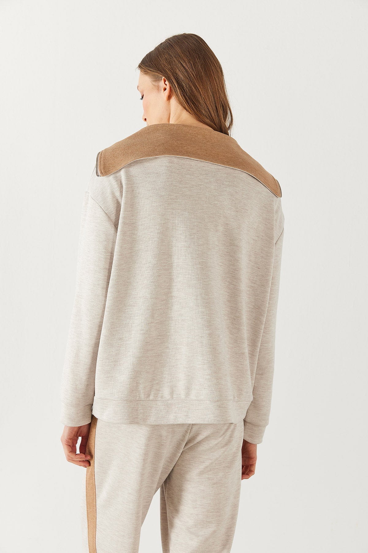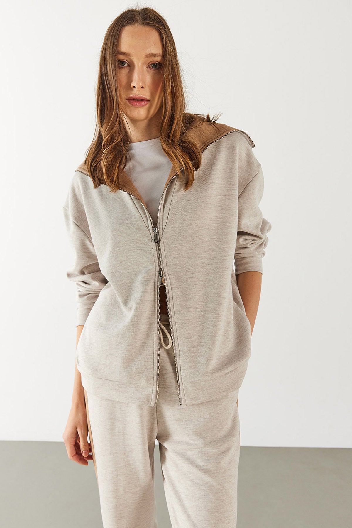 Kadın Polo Yaka Önü Fermuarlı Kontrast Parçalı Uzun Ceket - Ekru Melanj