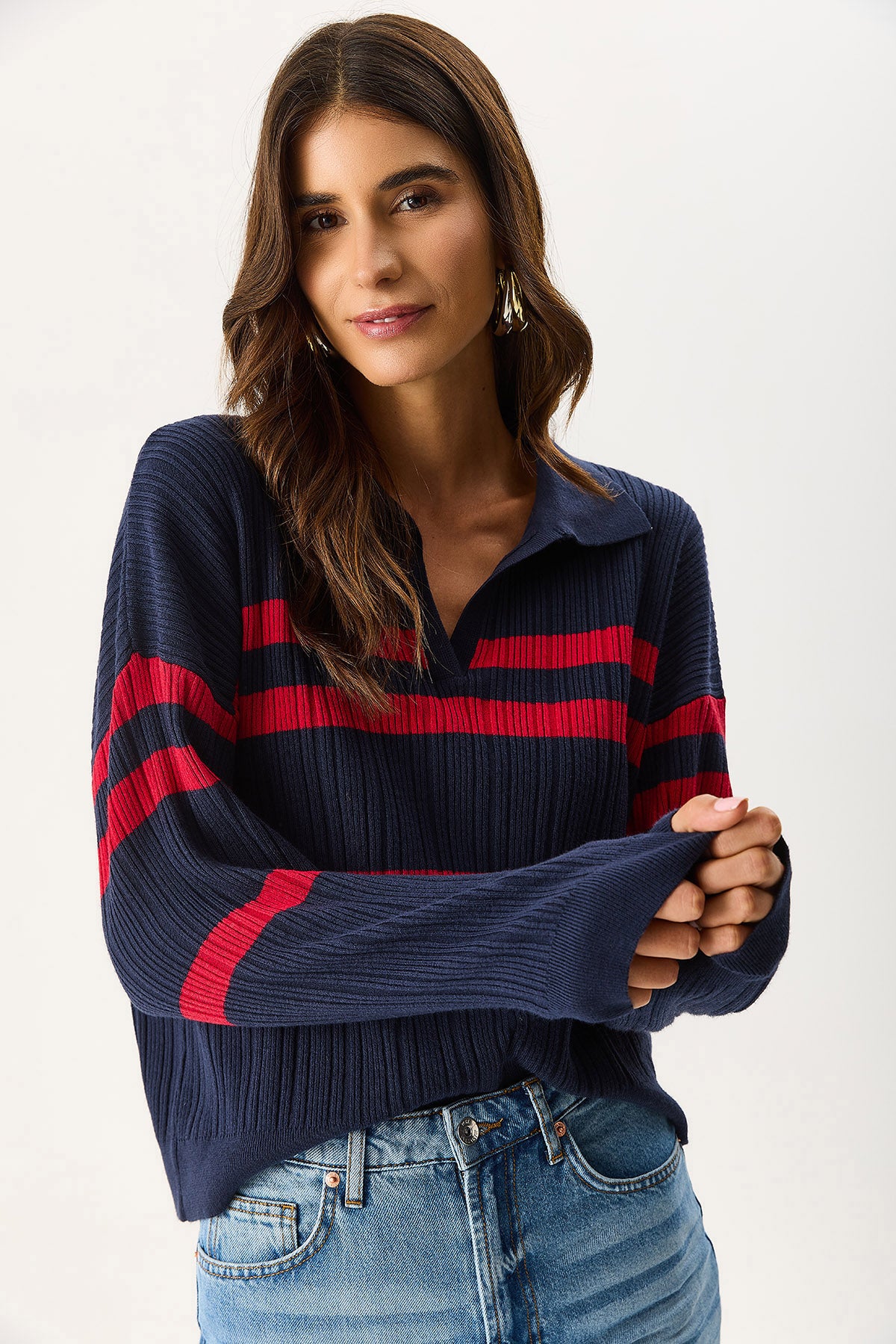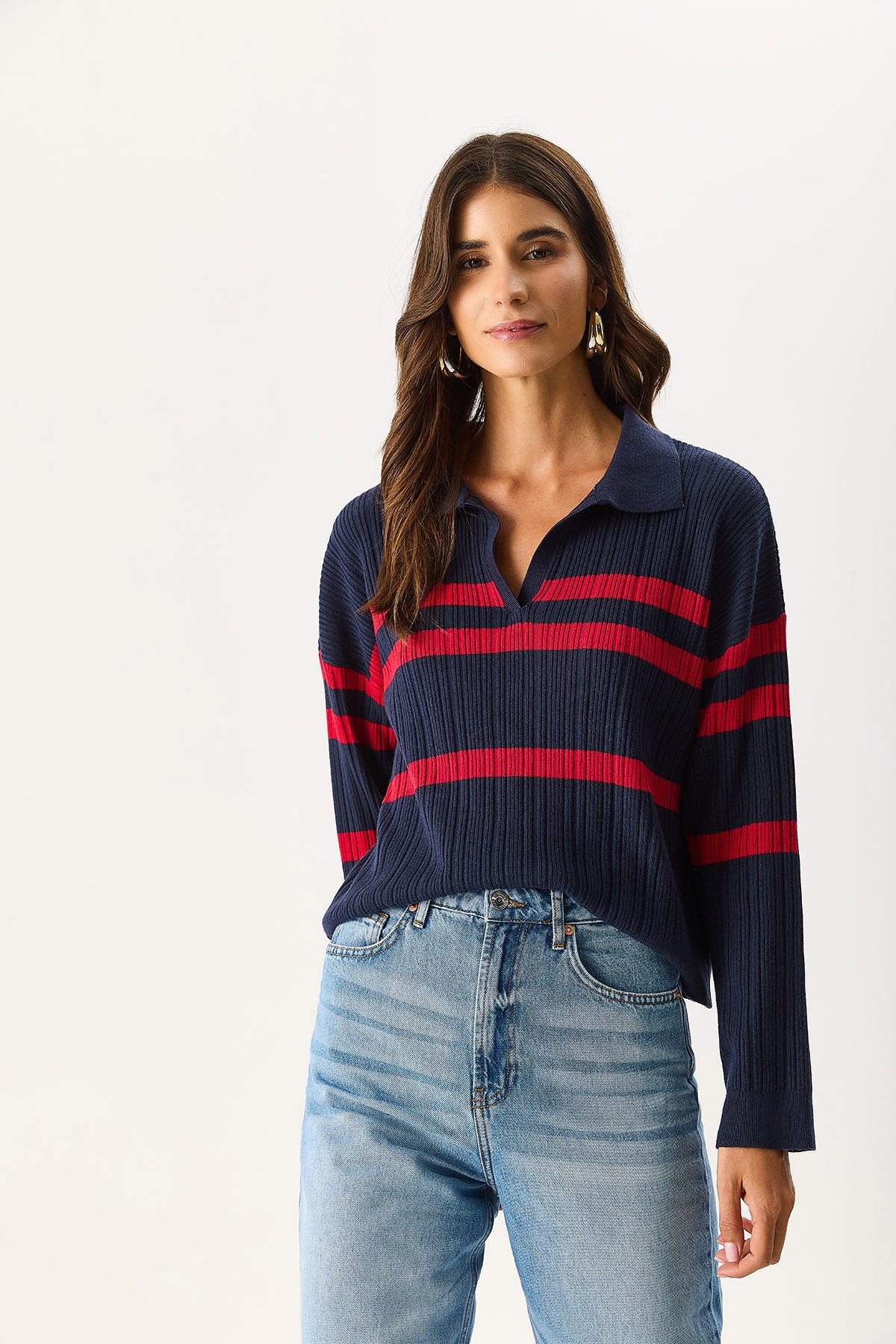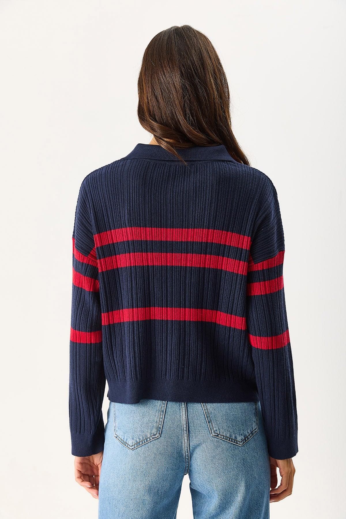 Kadın Polo Yakalı Çizgili Triko - Lacivert Kırmızı Çizgili