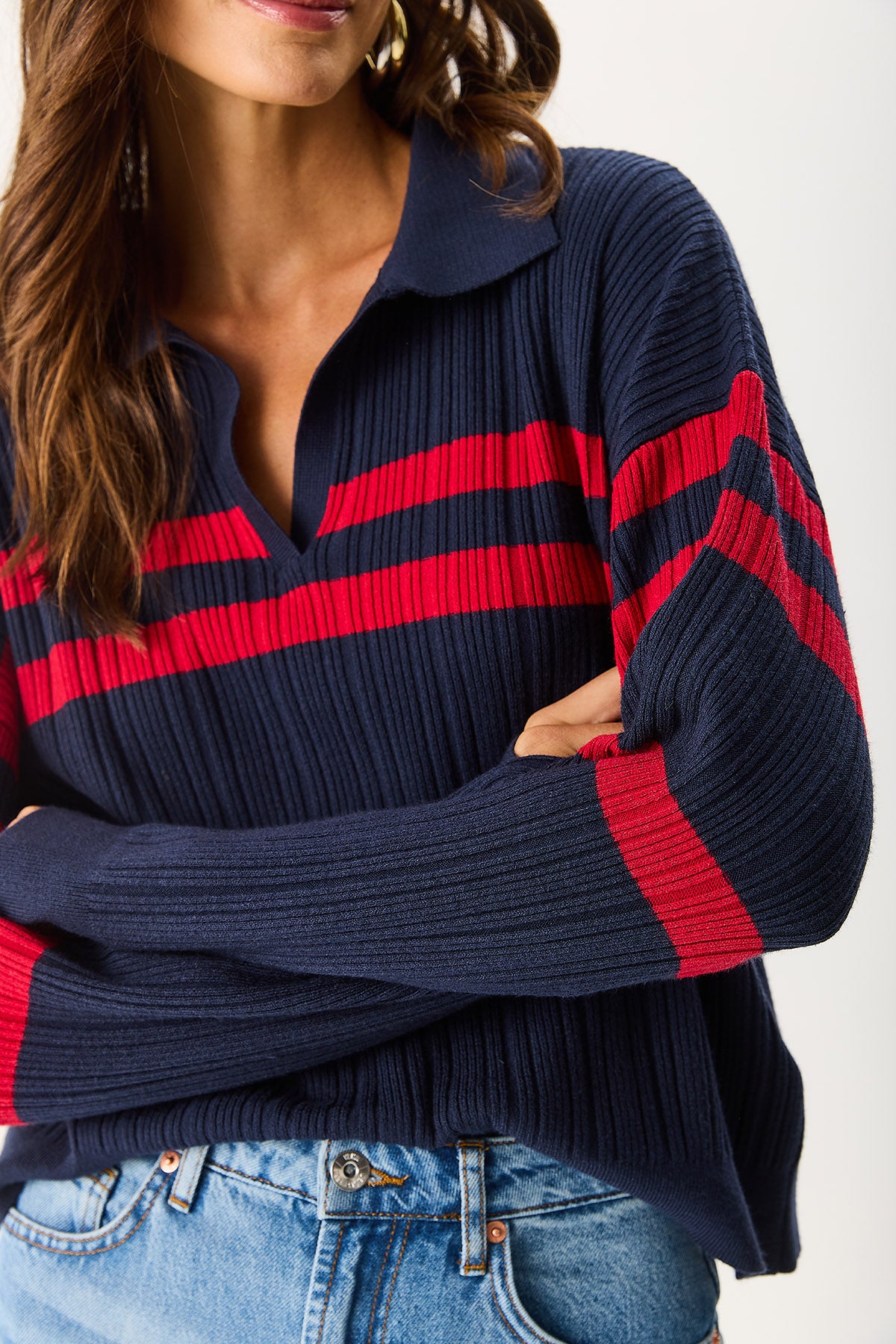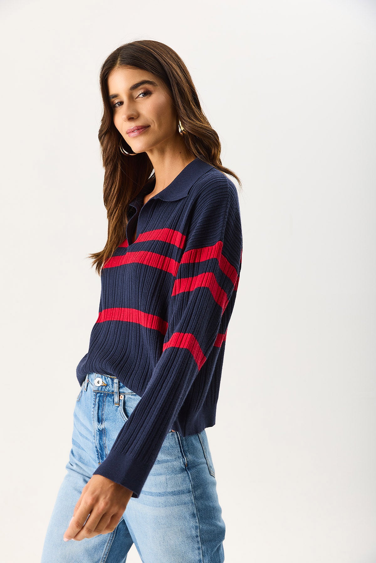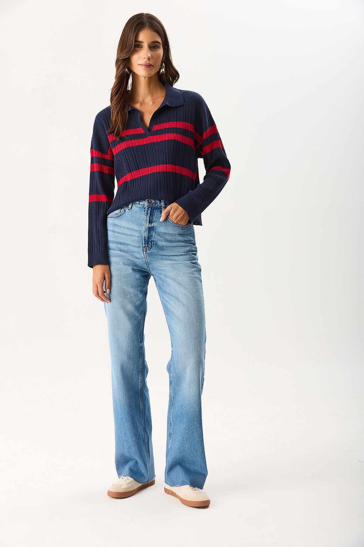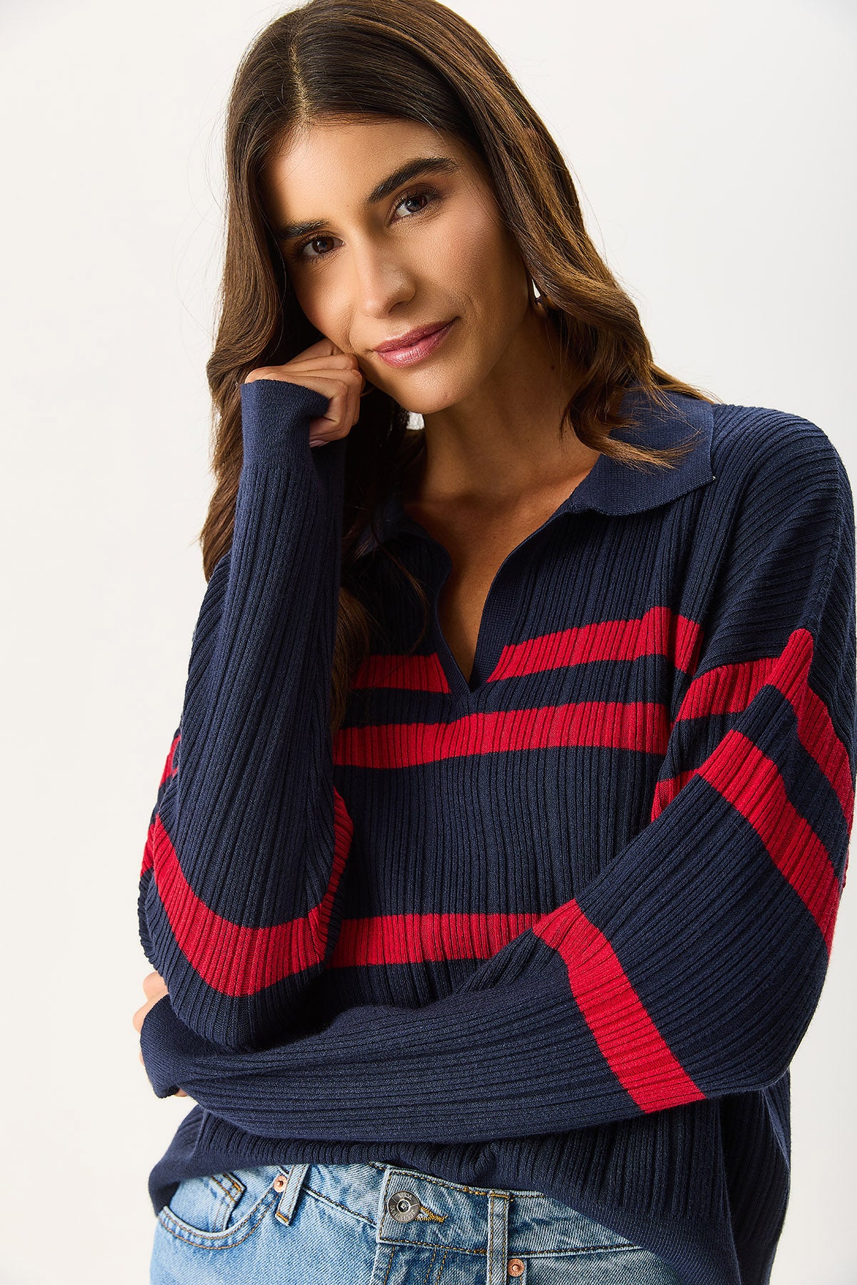 Kadın Polo Yakalı Çizgili Triko - Lacivert Kırmızı Çizgili