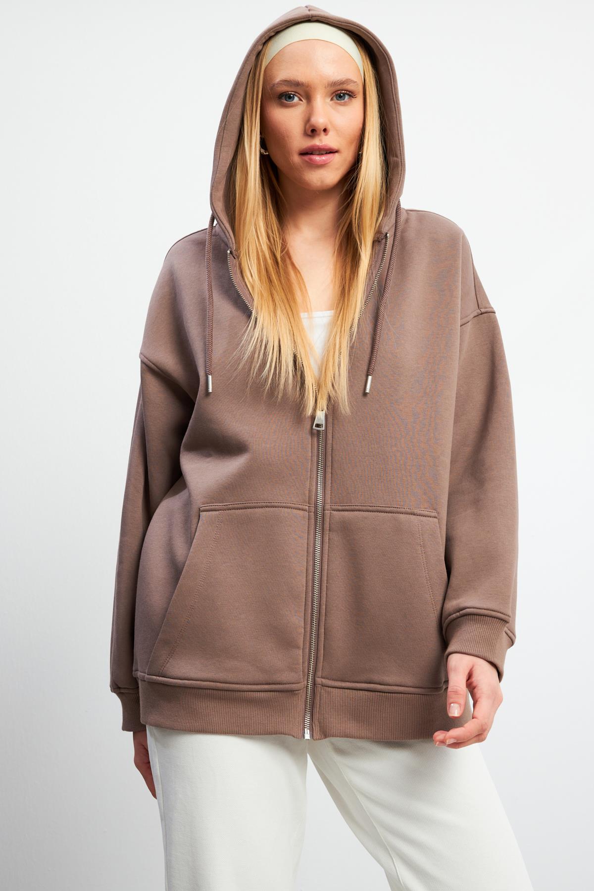 Kadın Sallina Kapüşonlu Fermuarlı Oversize Sweatshirt - Vizon