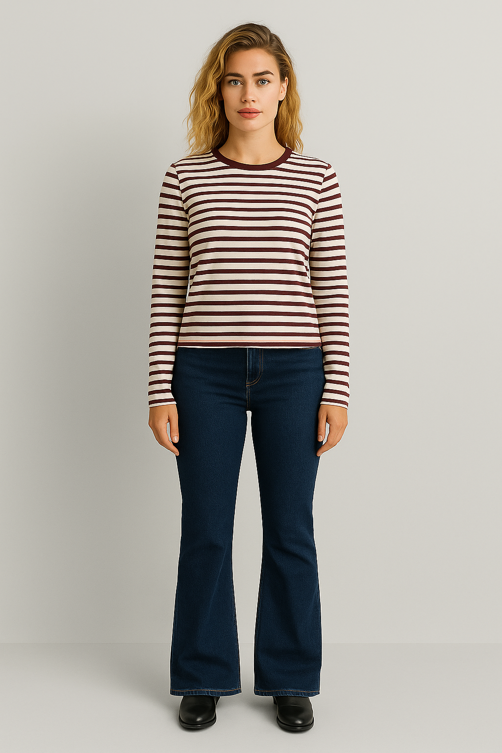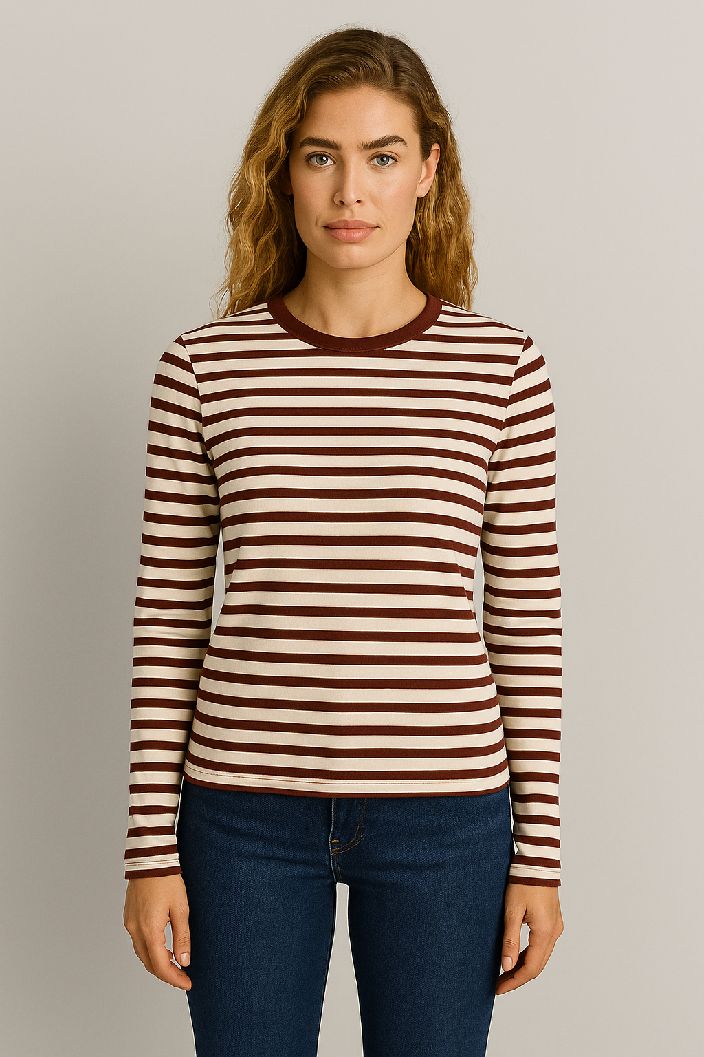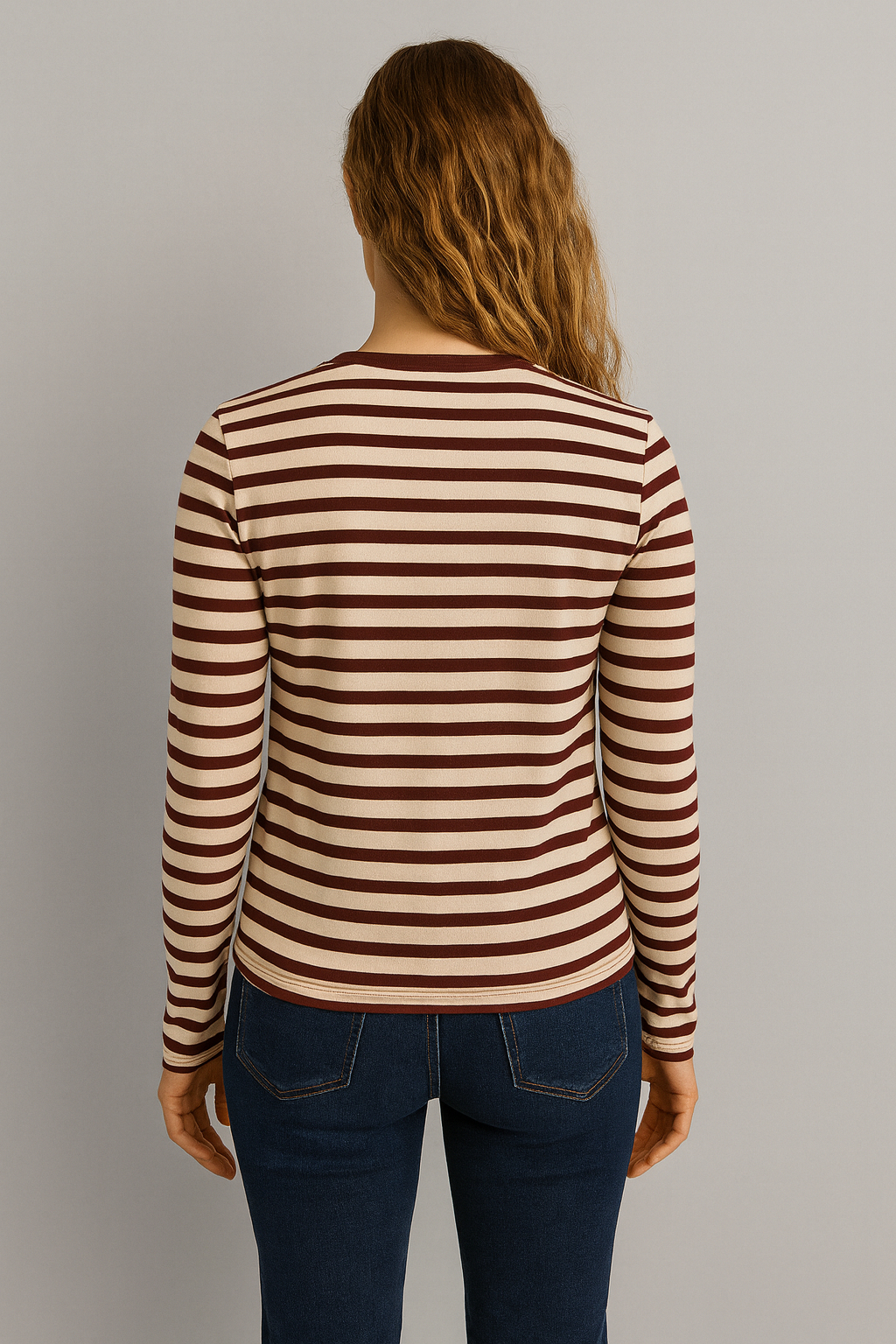 Kadın Serina Çizgili Uzun Kollu Tişört %100 Pamuk - Bordo - Ekru Çizgili