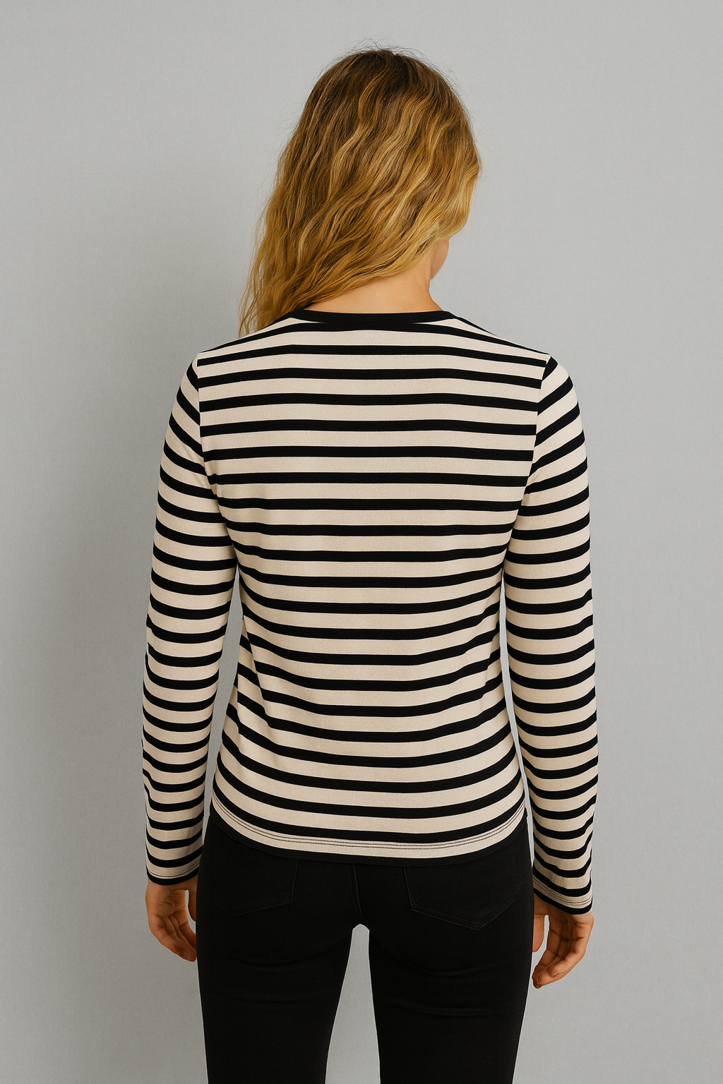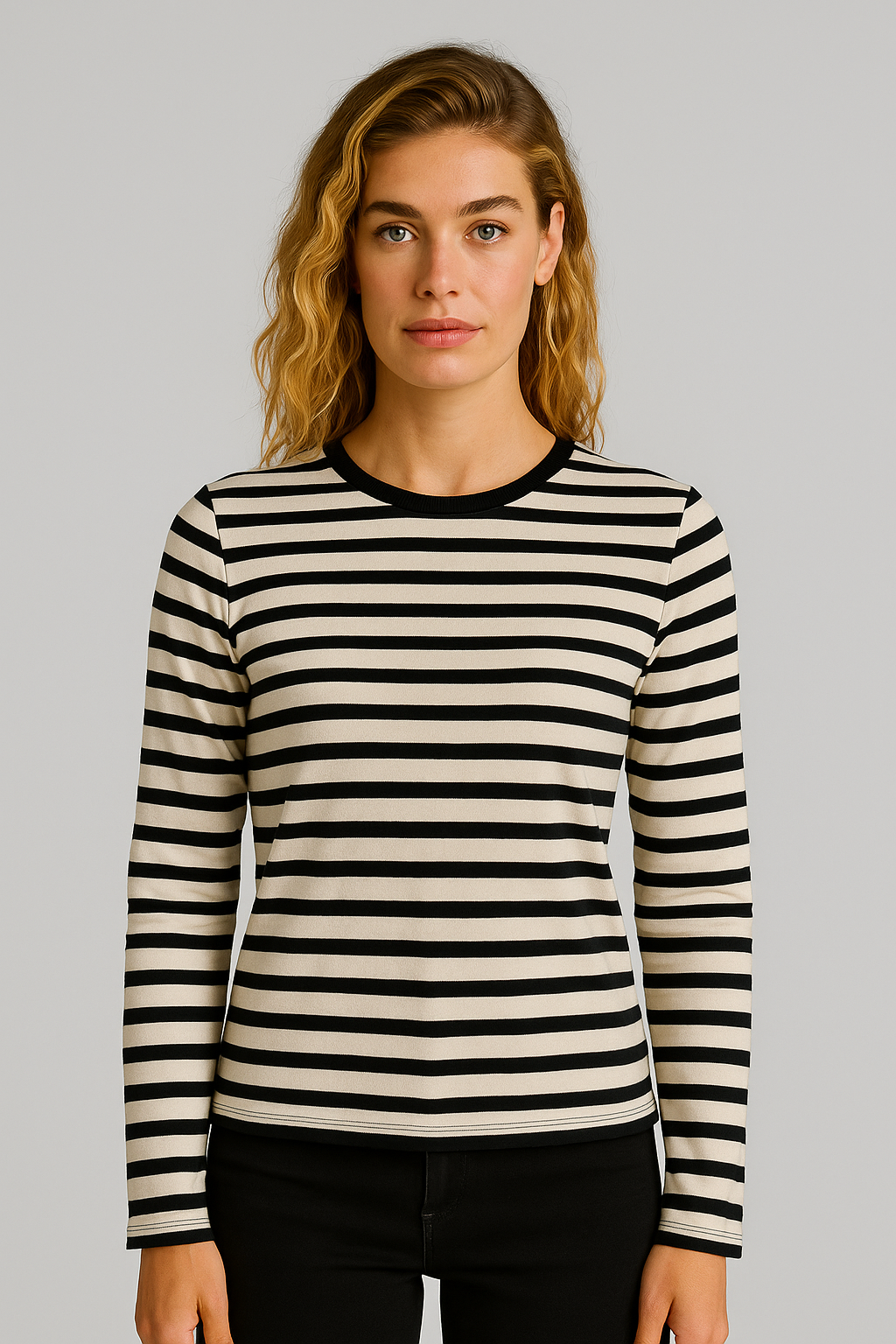 Kadın Serina Çizgili Uzun Kollu Tişört %100 Pamuk - Siyah - Ekru Çizgili