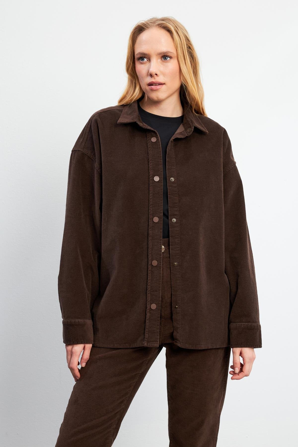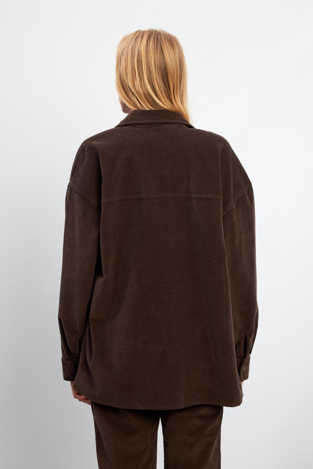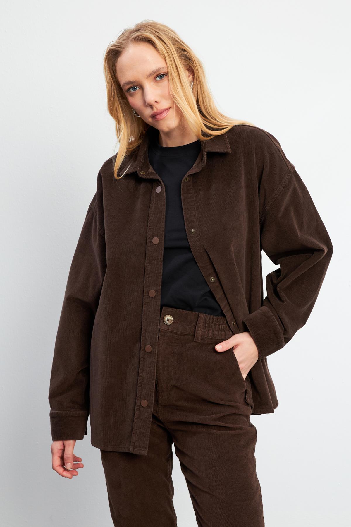 Kadın Tina İnce Fitilli Kadife Gömlek - Kahverengi