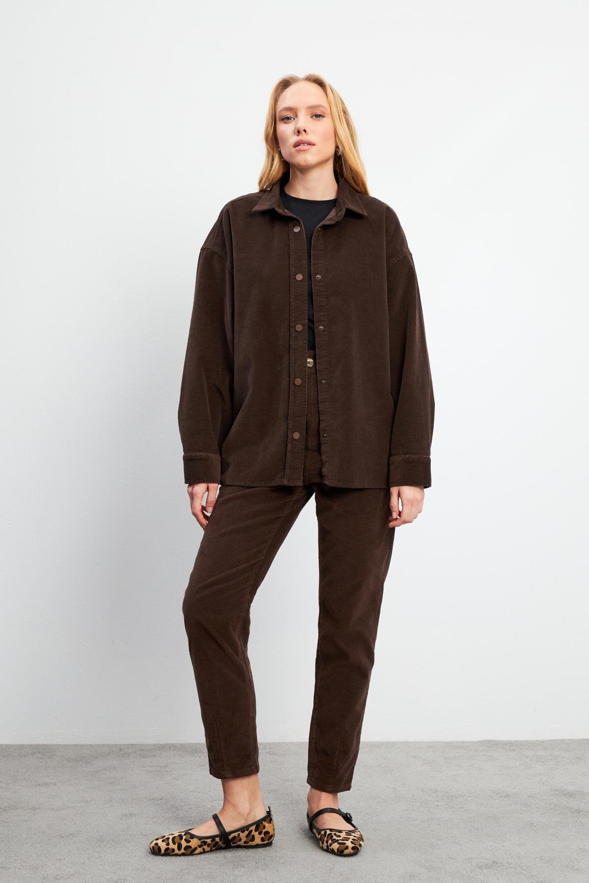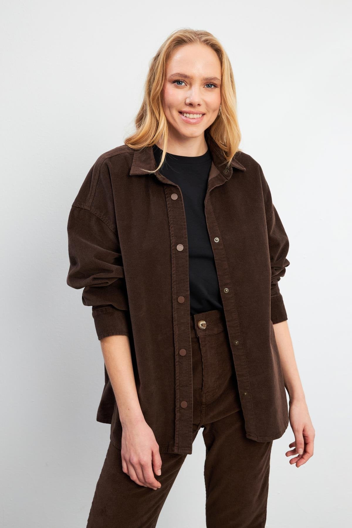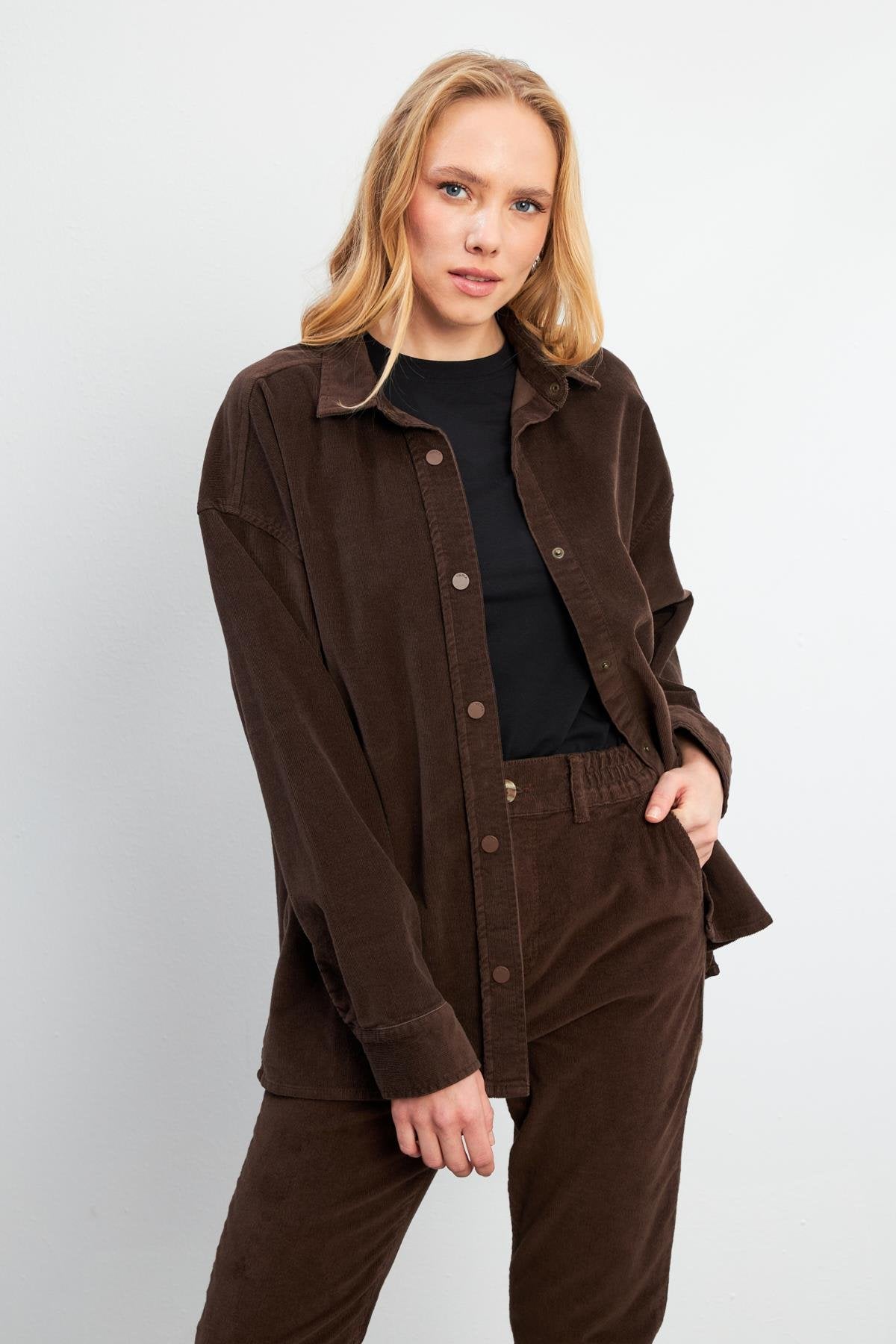 Kadın Tina İnce Fitilli Kadife Gömlek - Kahverengi