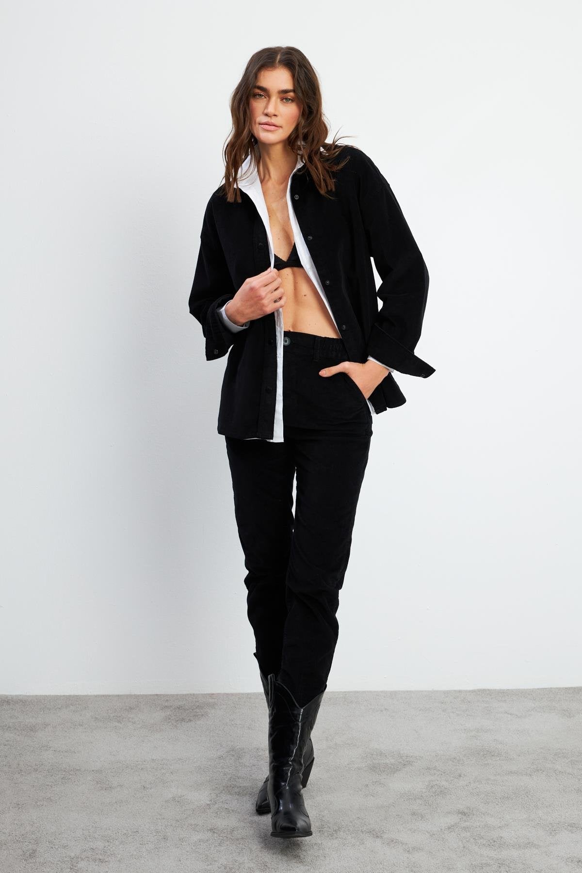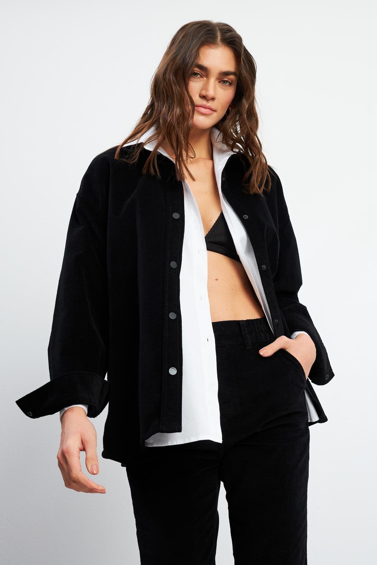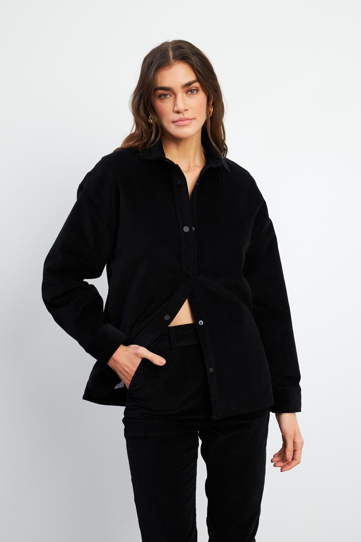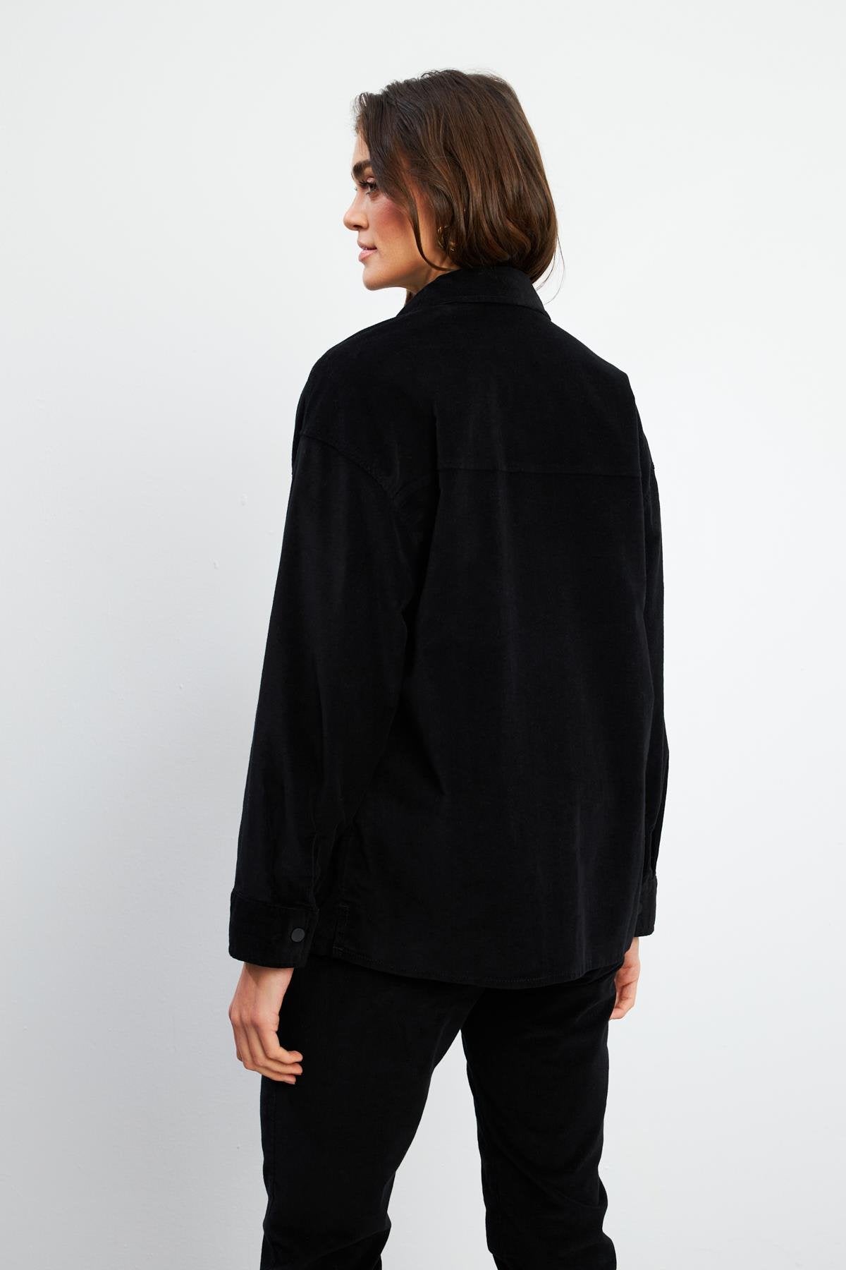 Kadın Tina İnce Fitilli Kadife Gömlek - Siyah