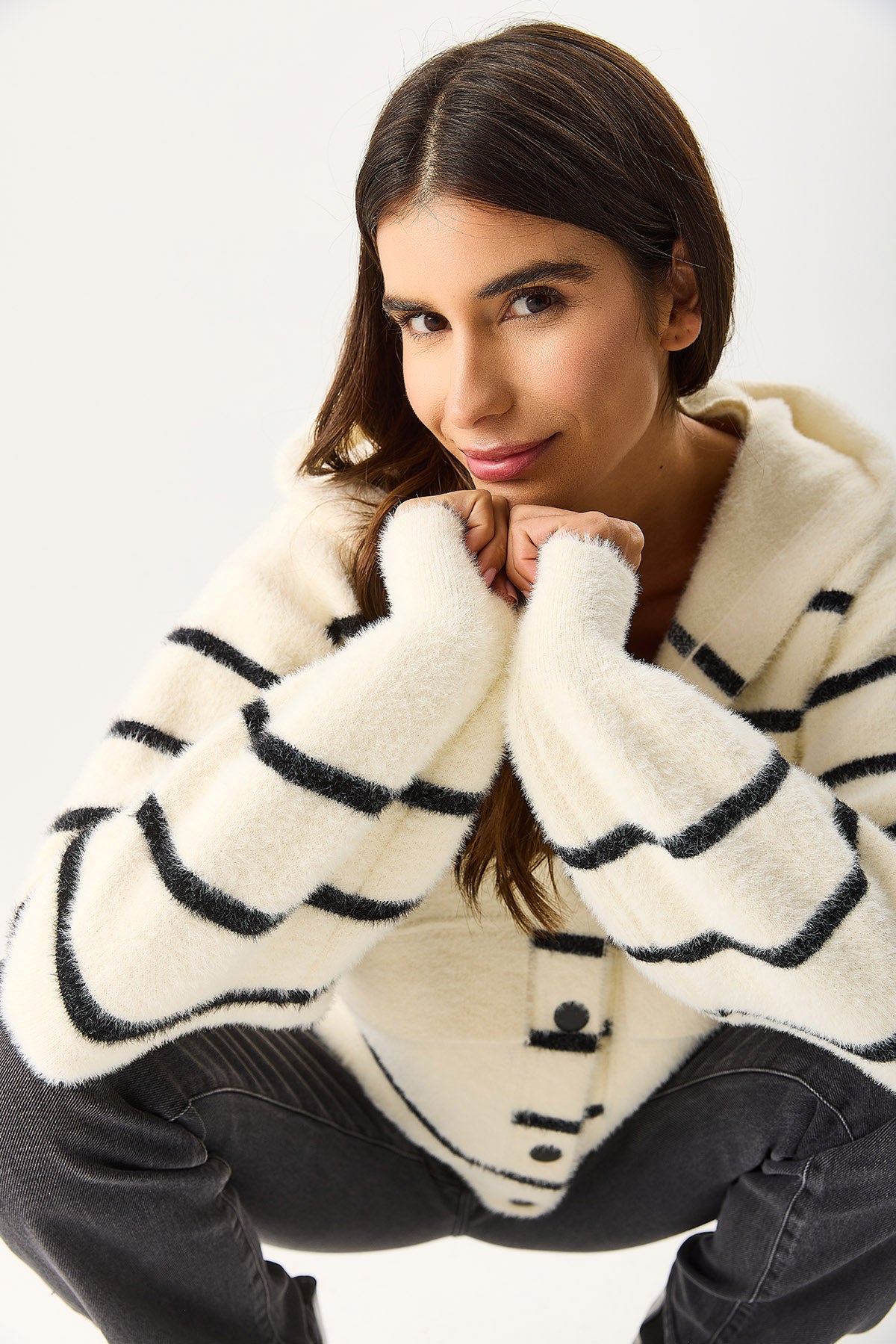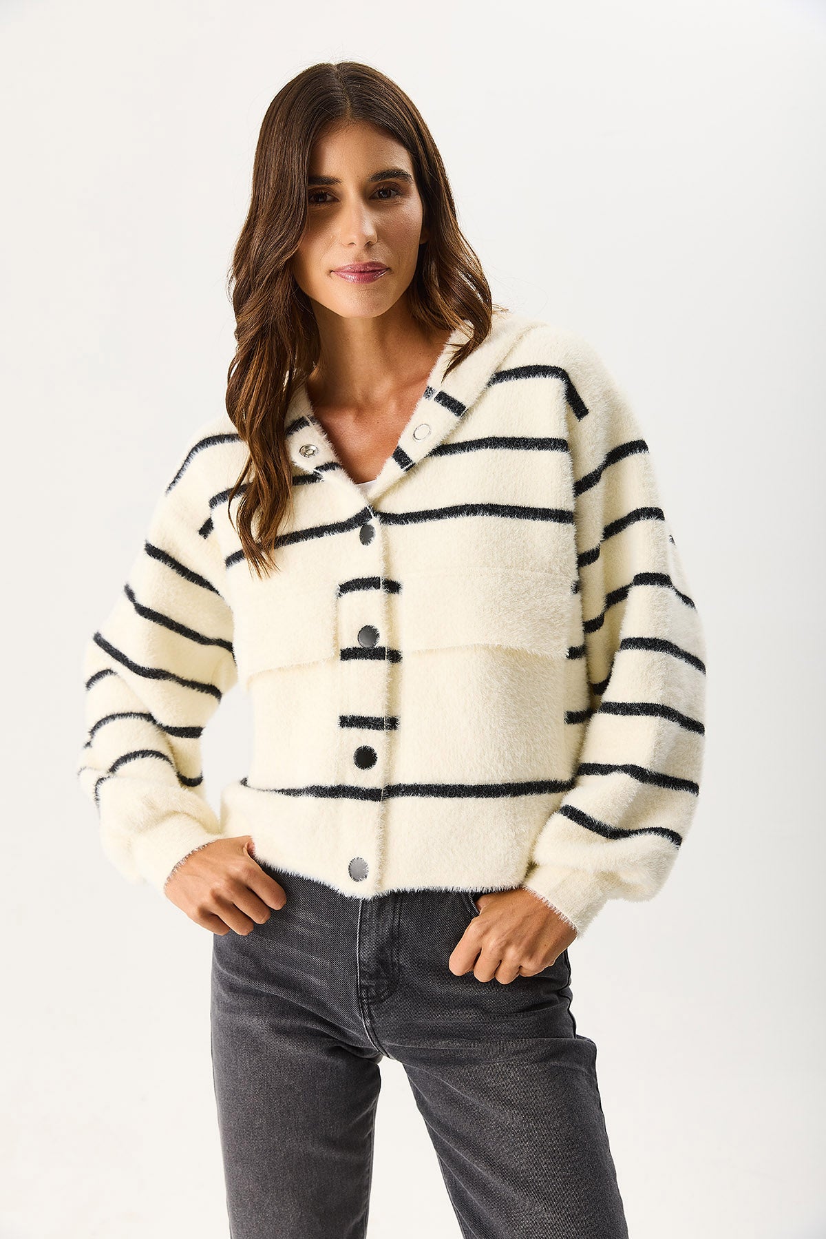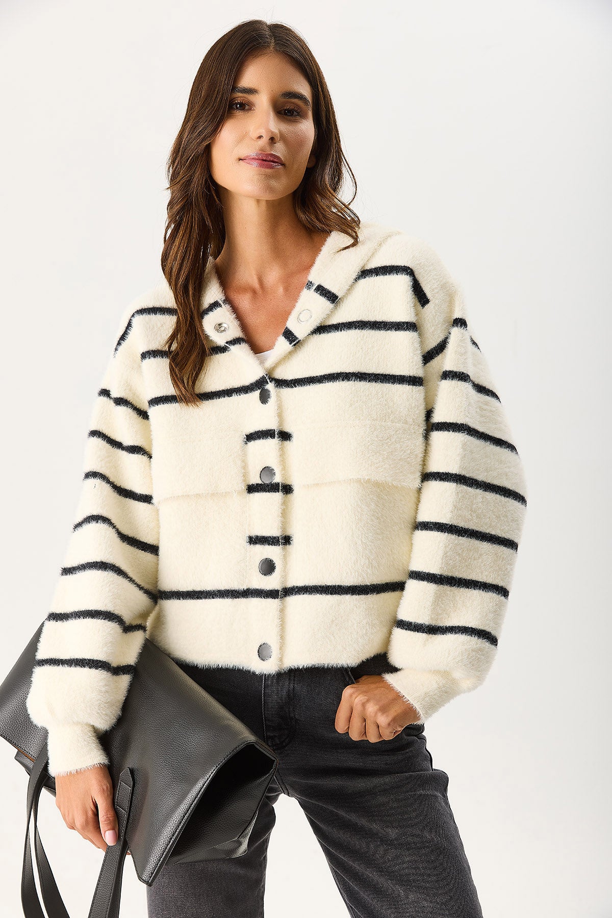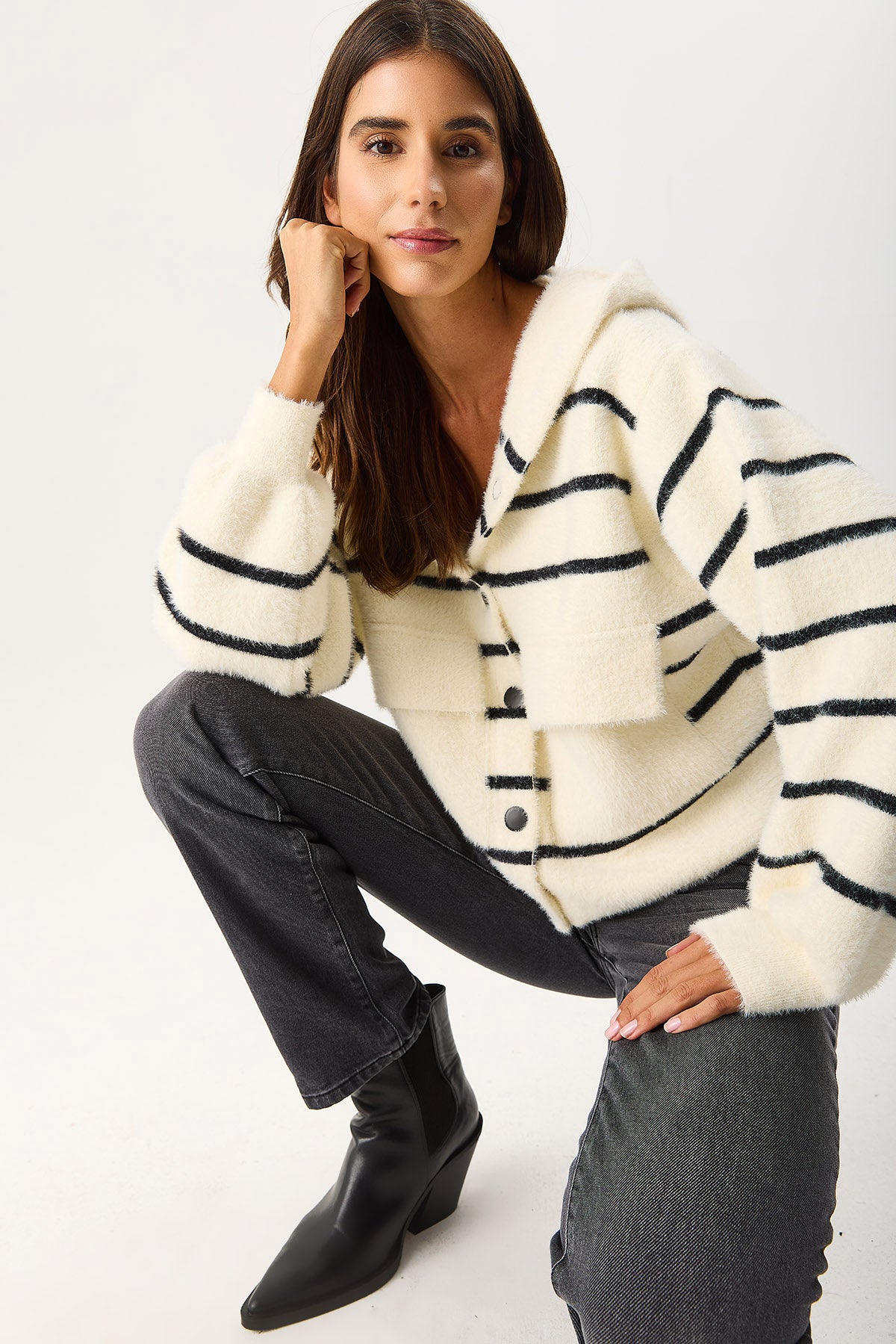 Kadın Kapüşonlu Önü Çıt Çıtlı Triko Ceket - Fildişi - Siyah Çizgili