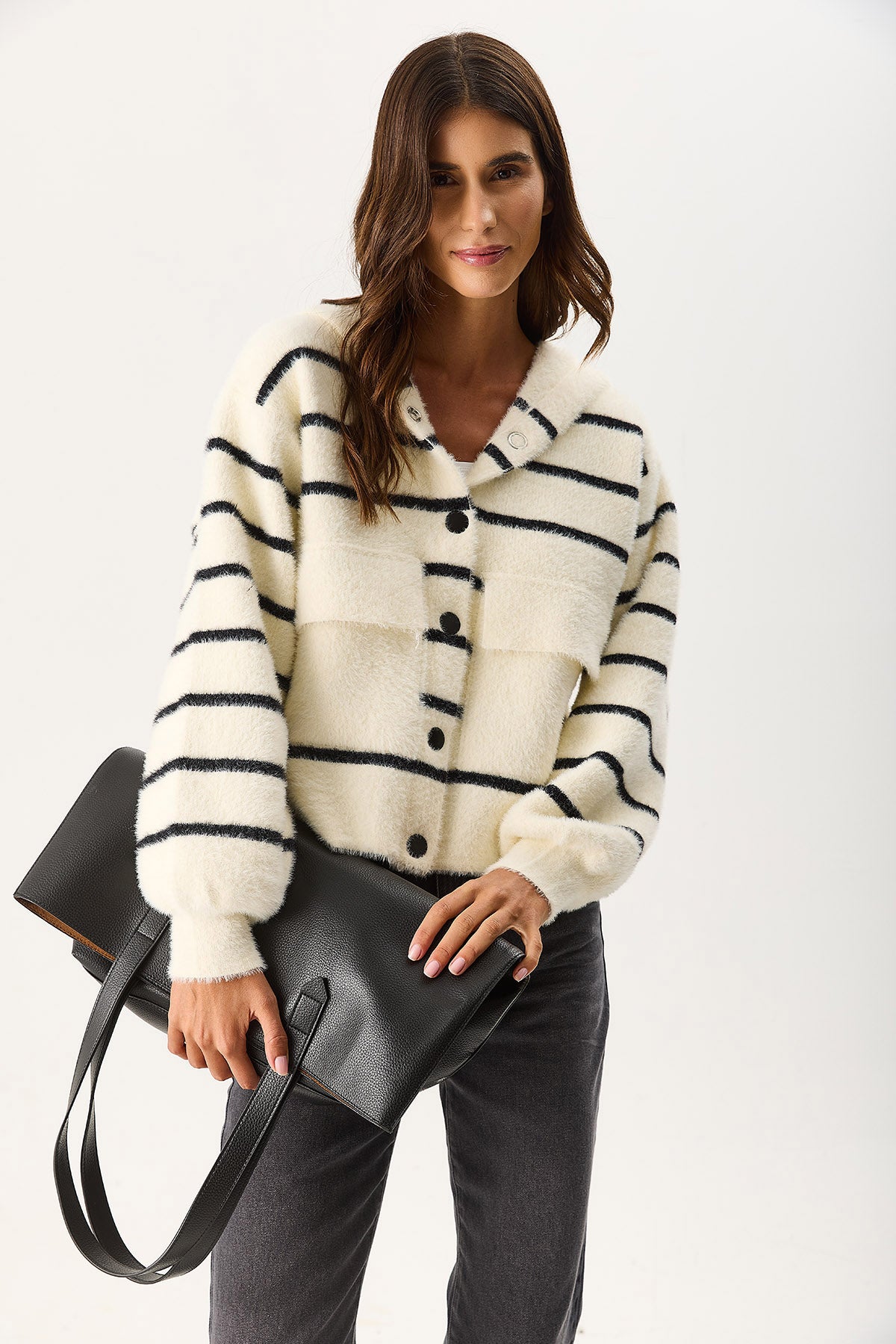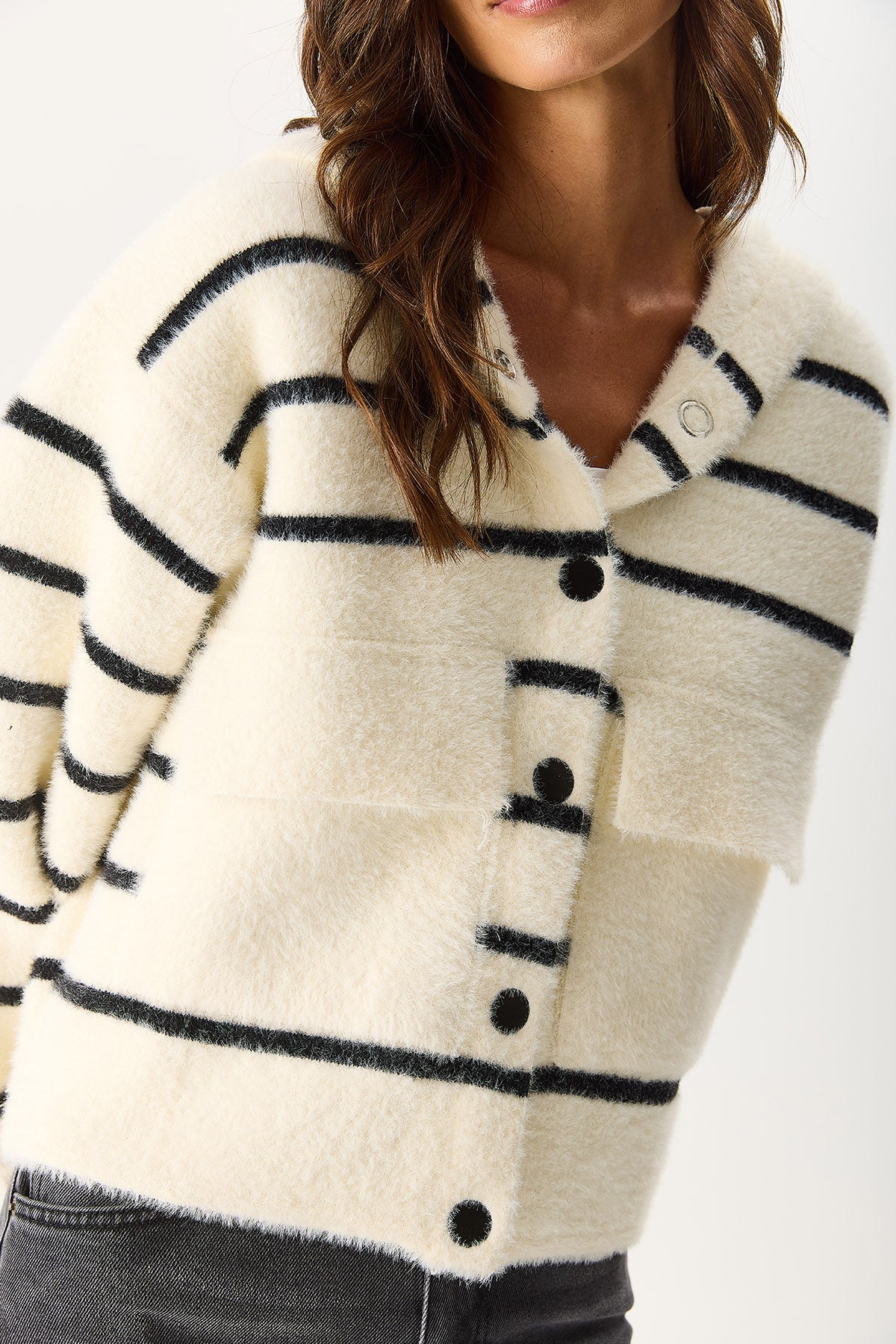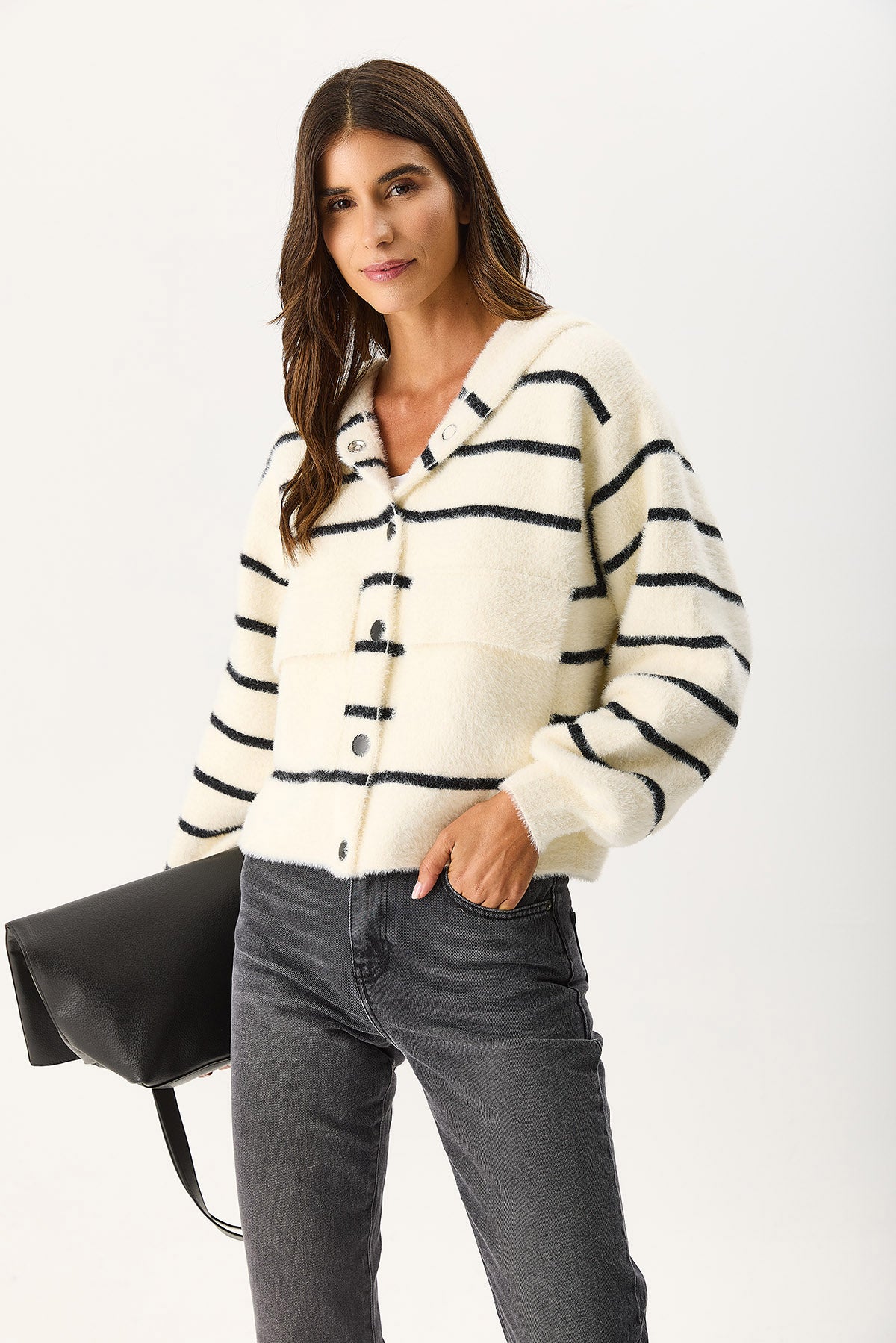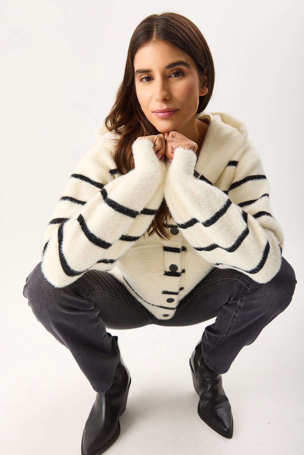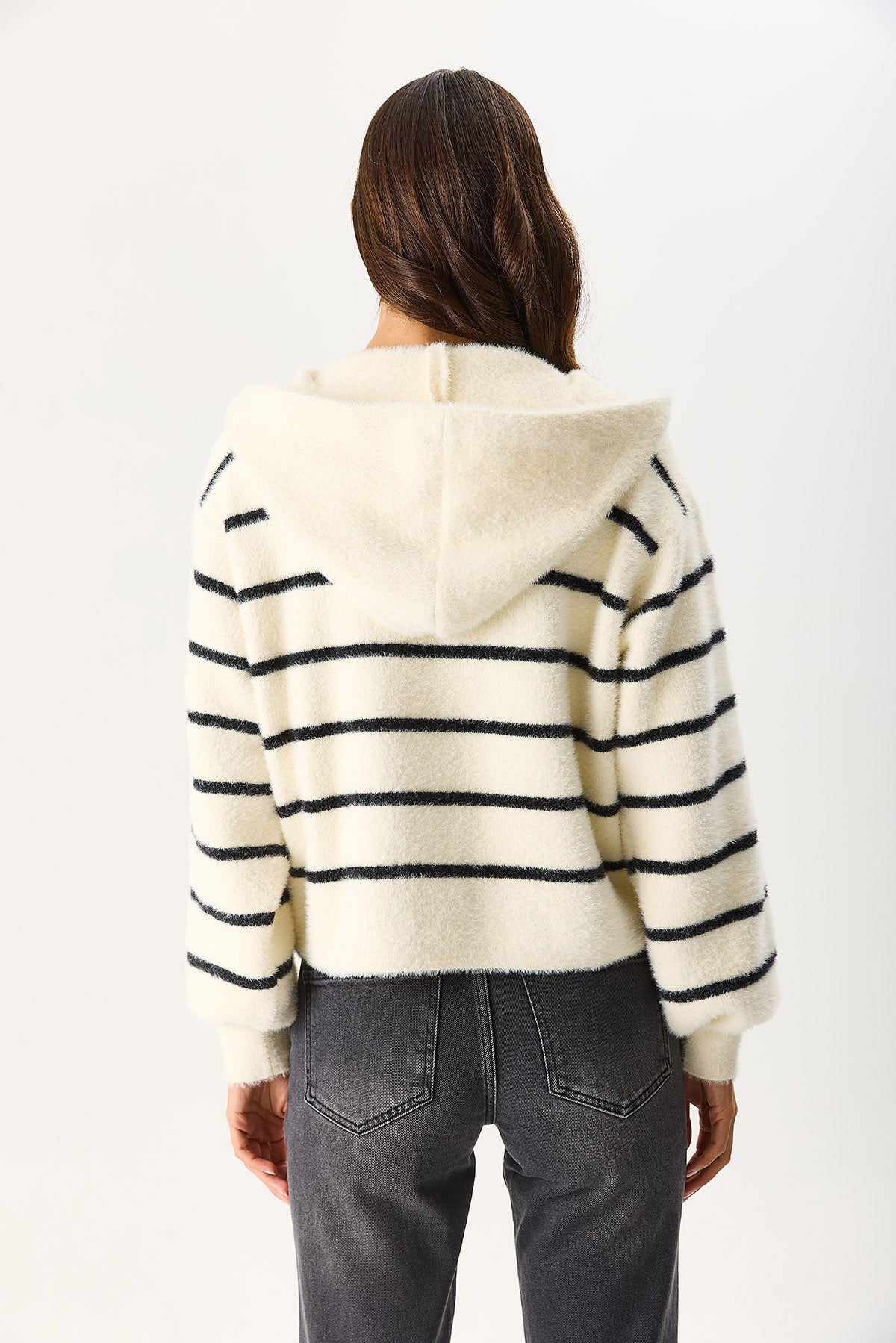 Kadın Kapüşonlu Önü Çıt Çıtlı Triko Ceket - Fildişi - Siyah Çizgili