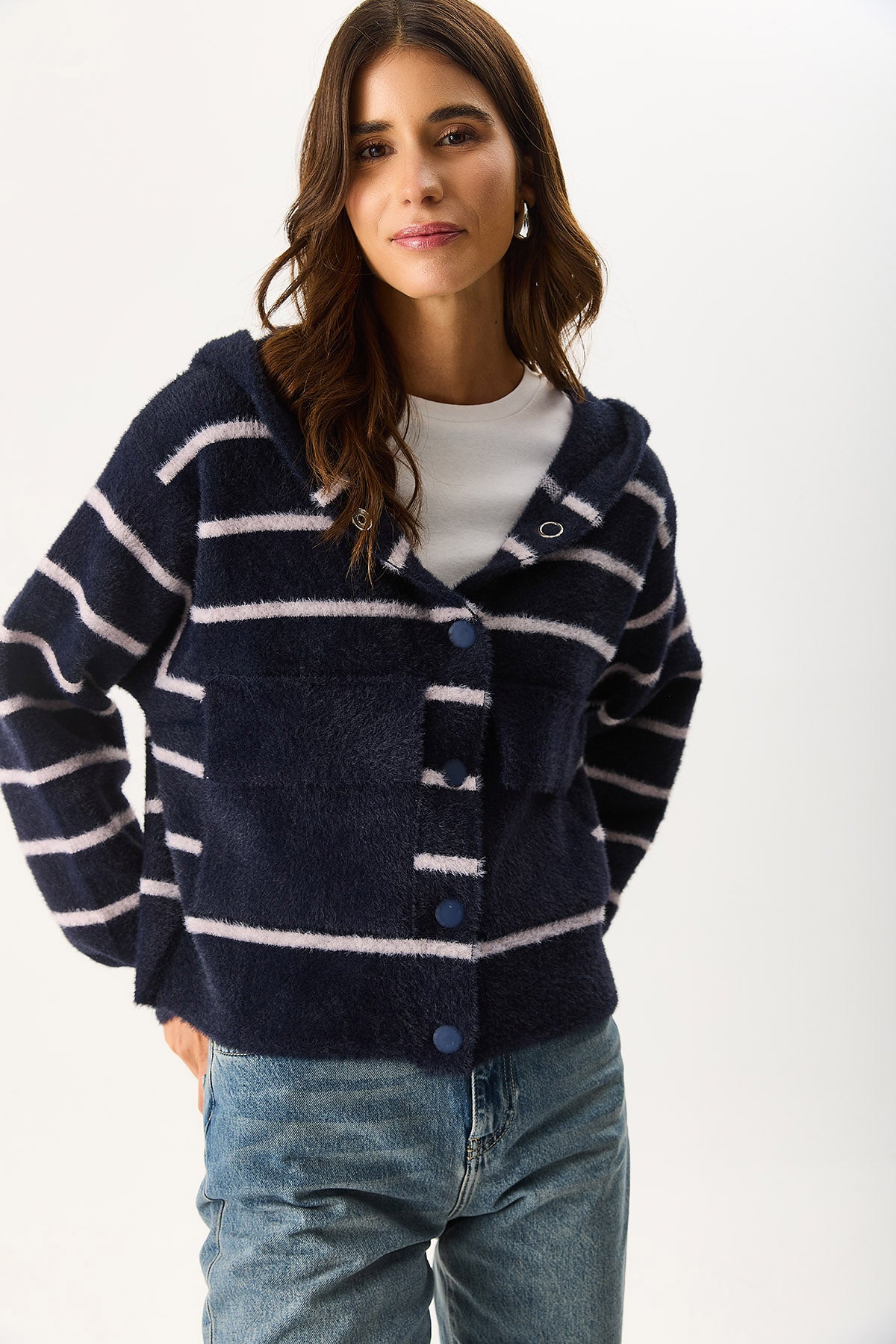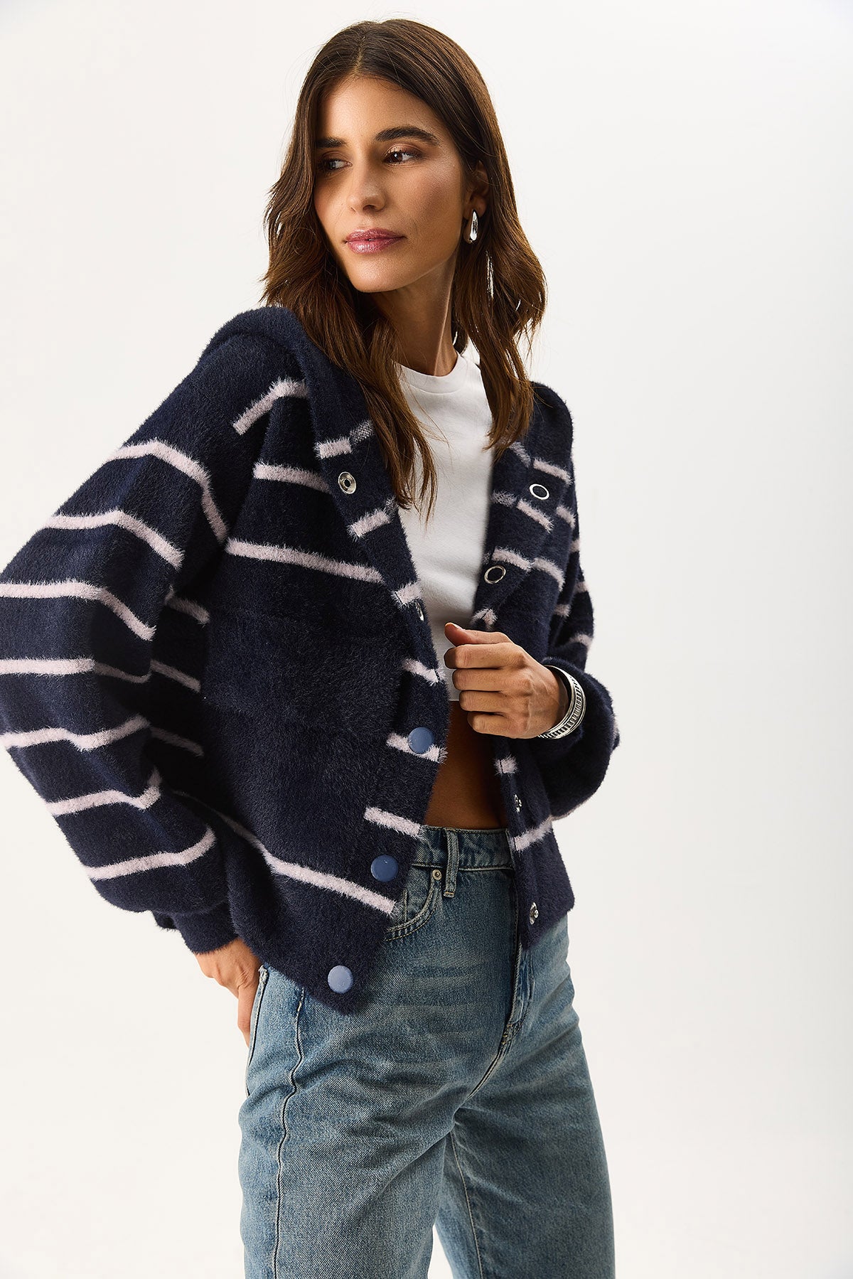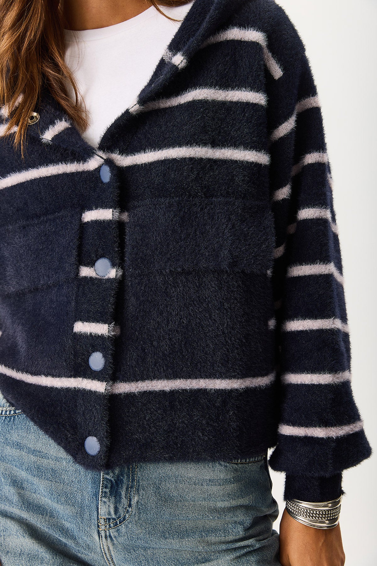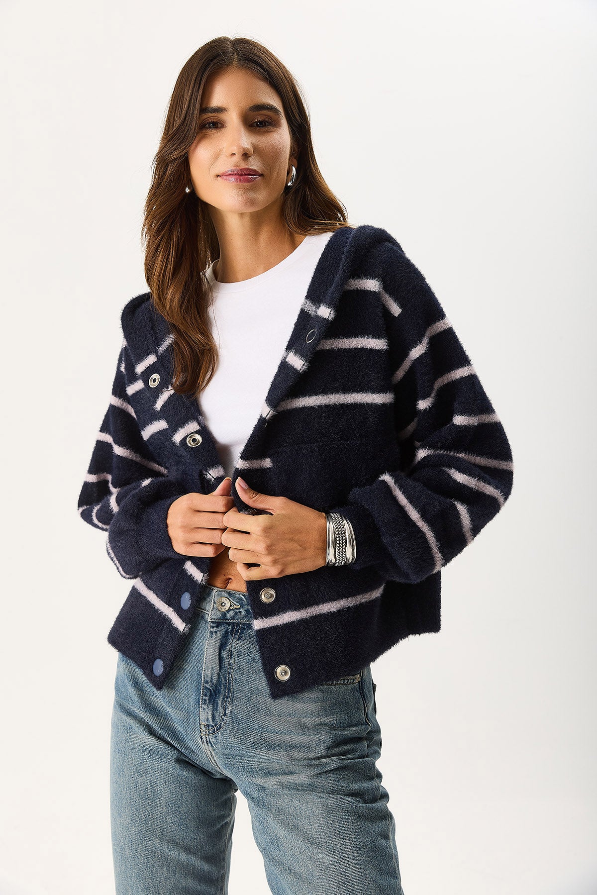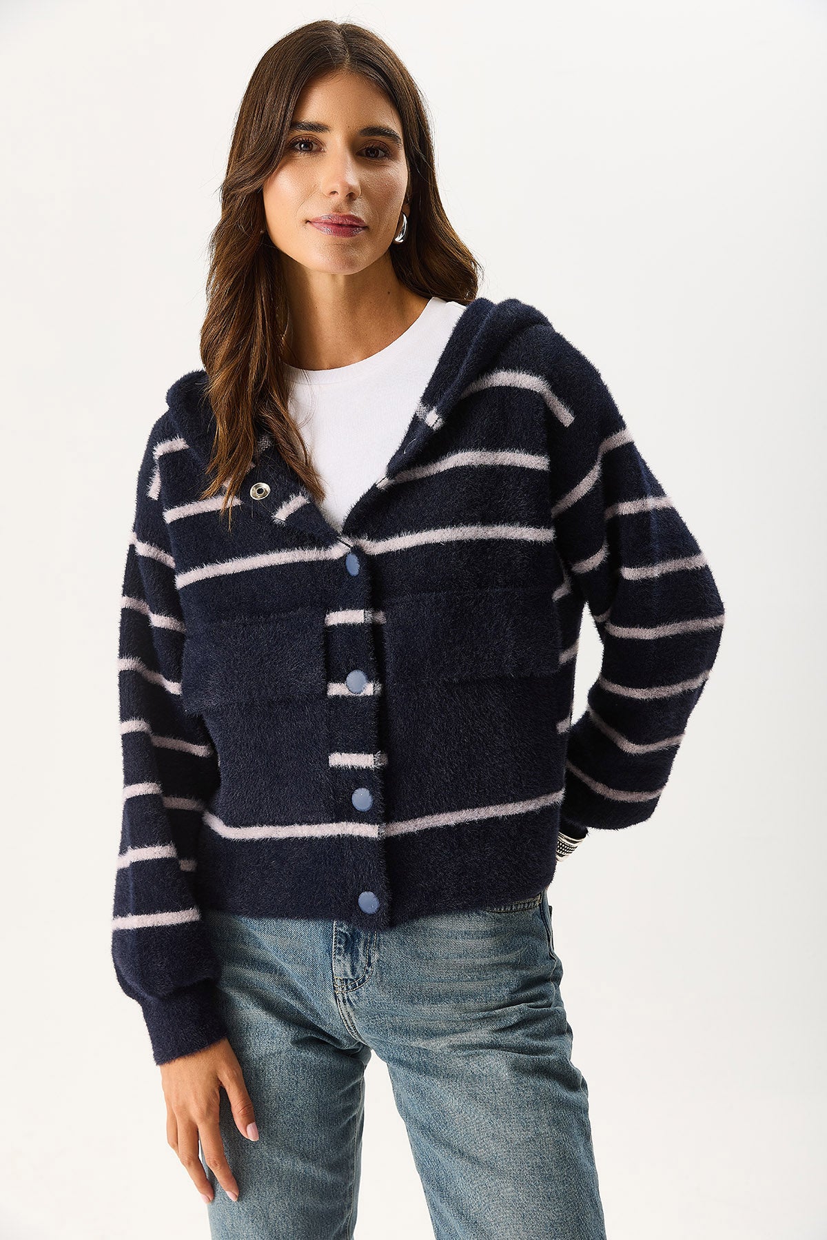 Kadın Kapüşonlu Önü Çıt Çıtlı Triko Ceket - Lacivert - Fildişi Çizgili