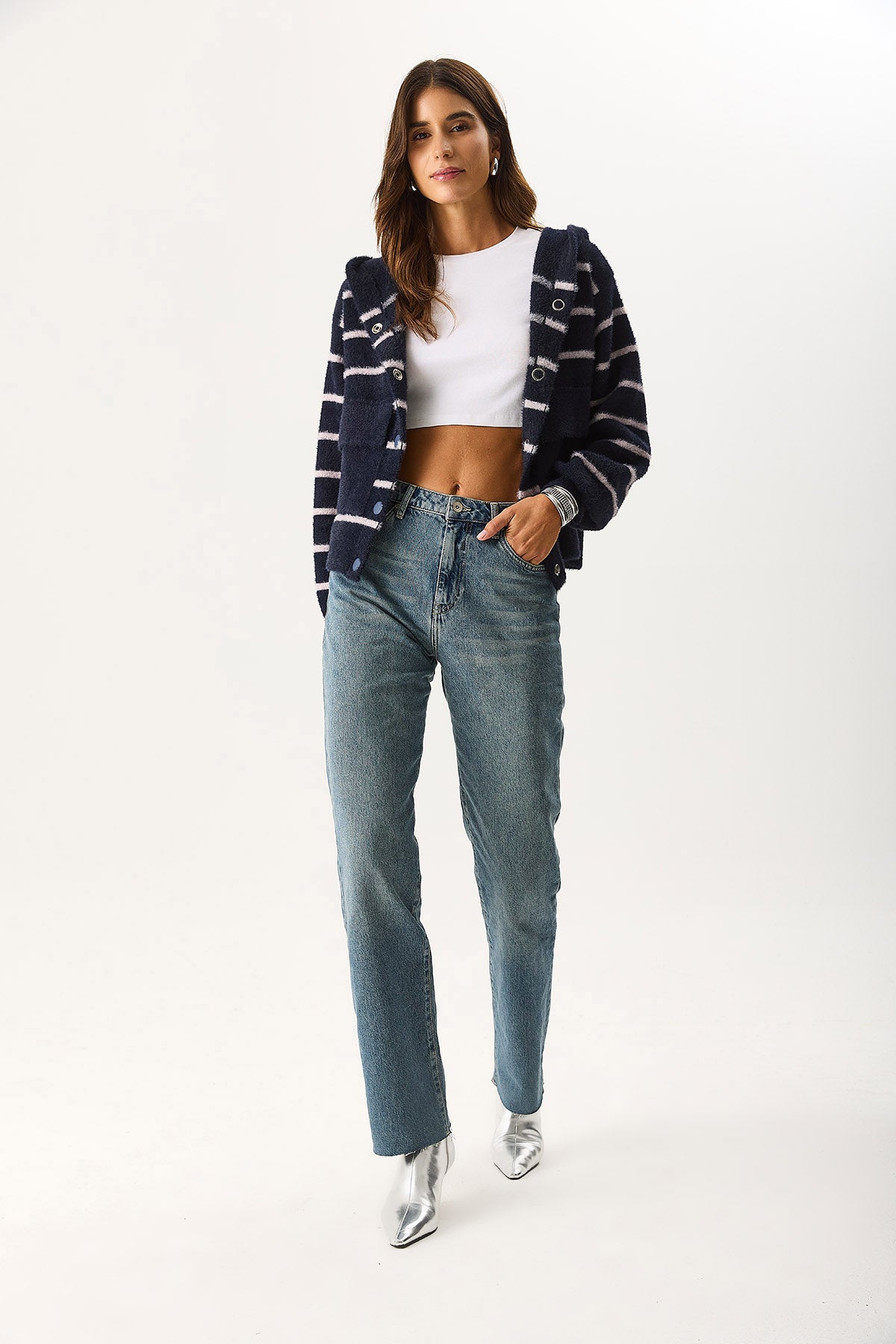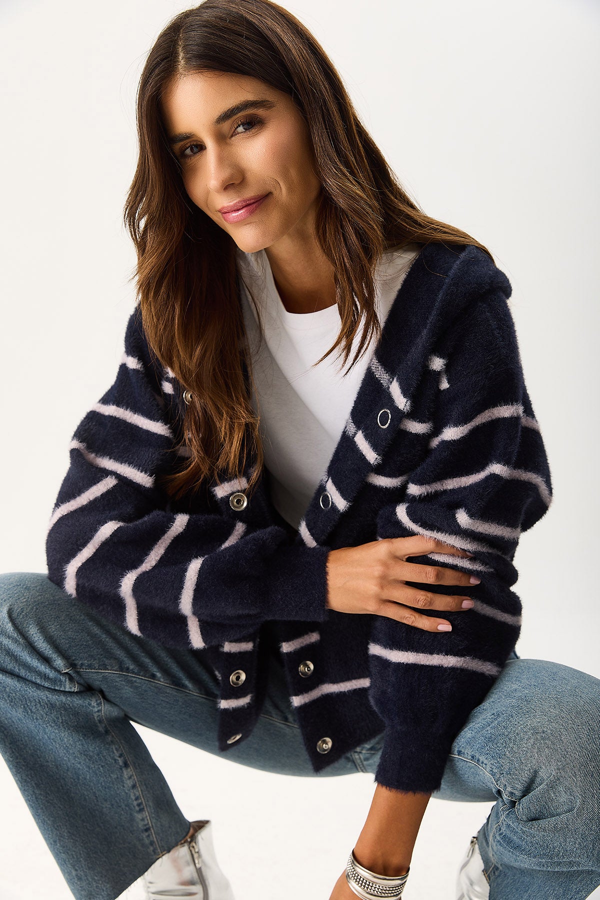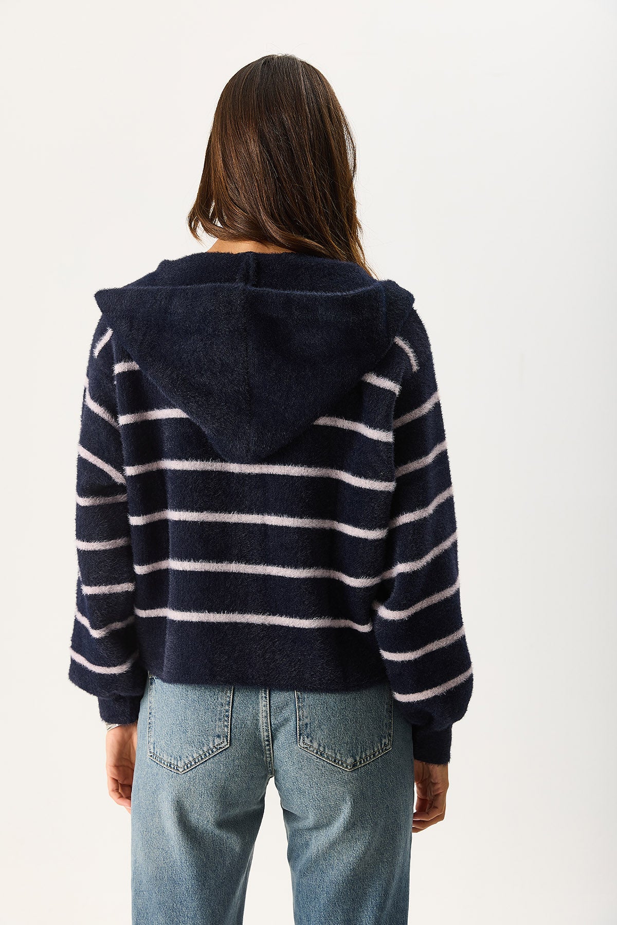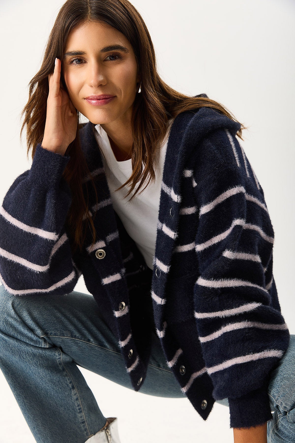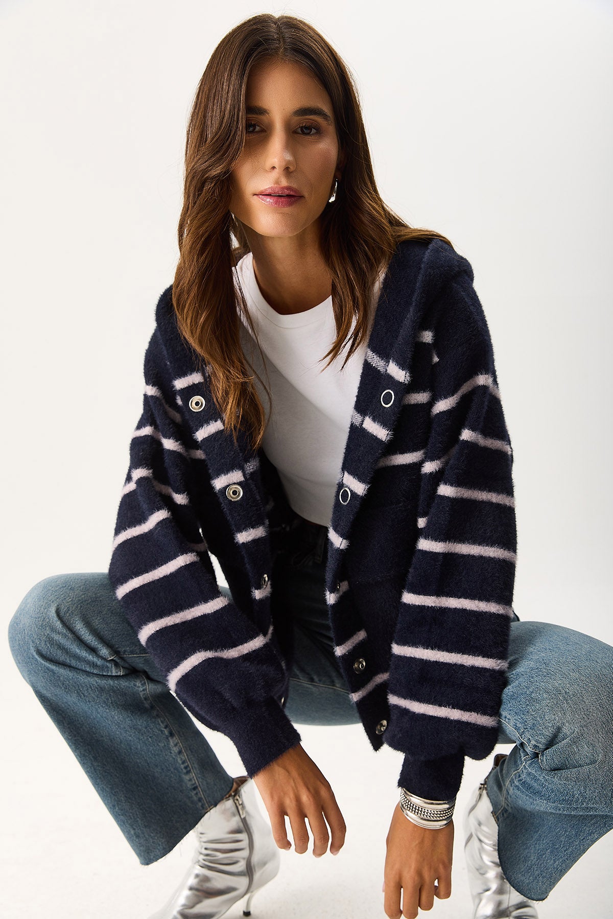 Kadın Kapüşonlu Önü Çıt Çıtlı Triko Ceket - Lacivert - Fildişi Çizgili