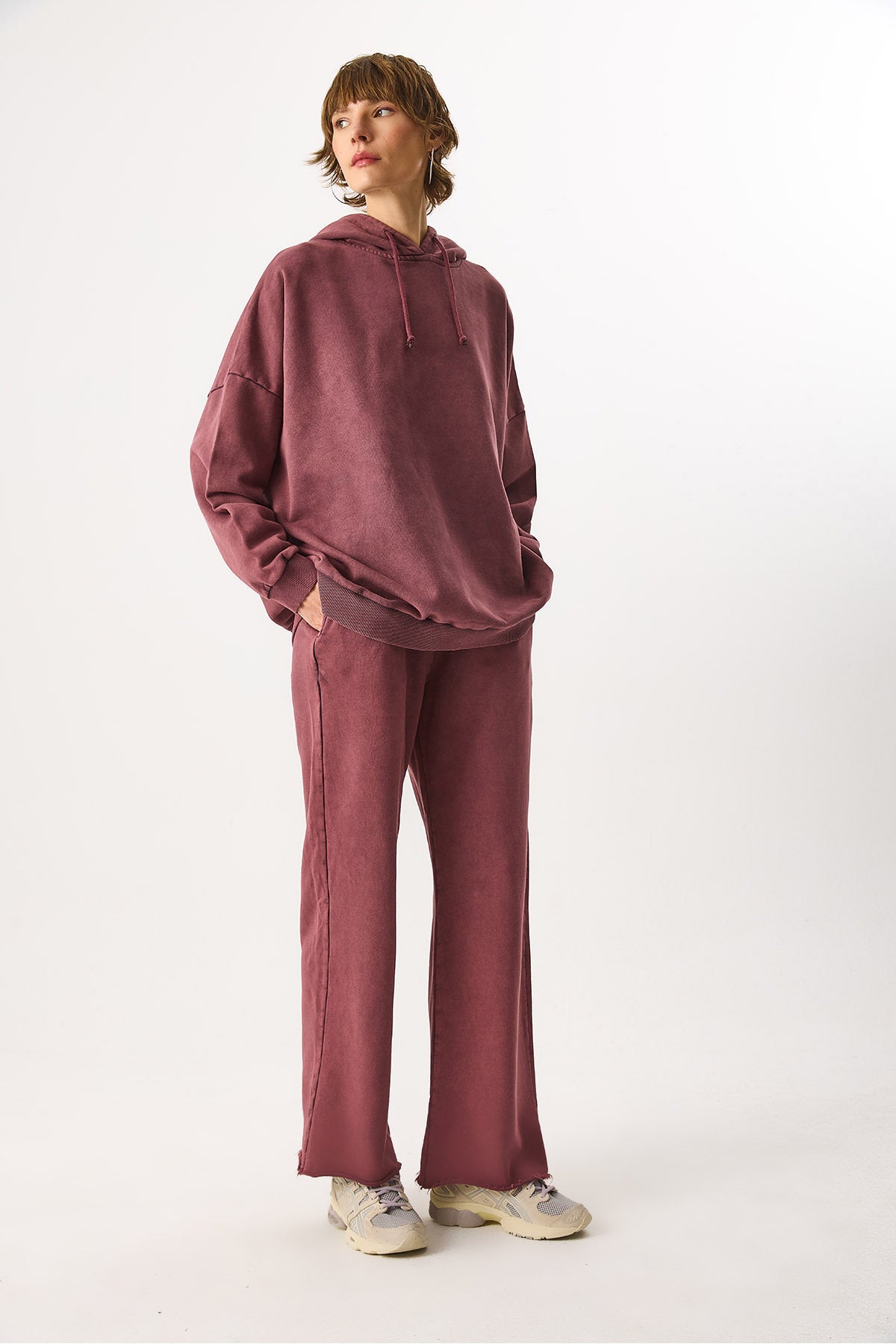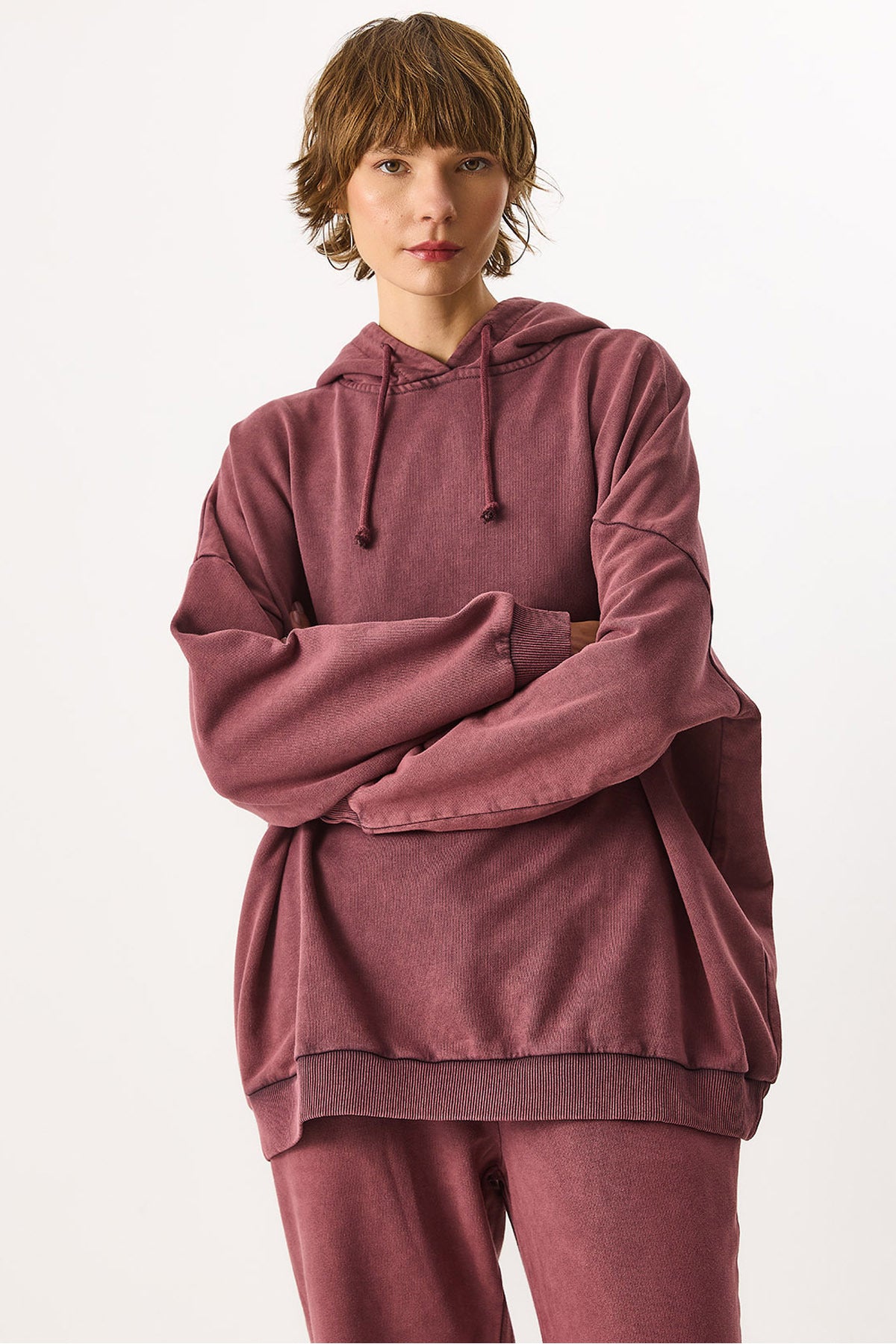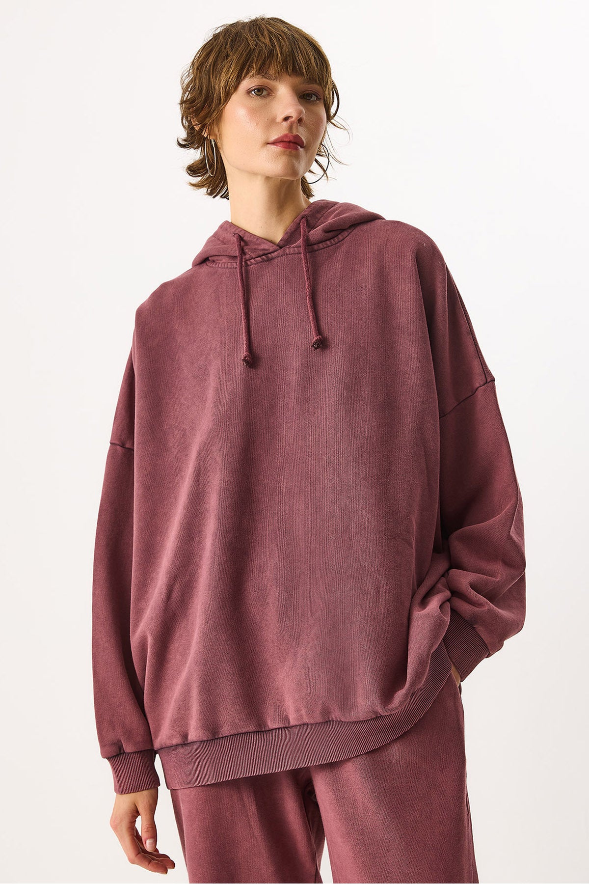 Kadın Kapüşonlu Regular Fit Yıkamalı Sweatshirt %100 Pamuk - Bordo