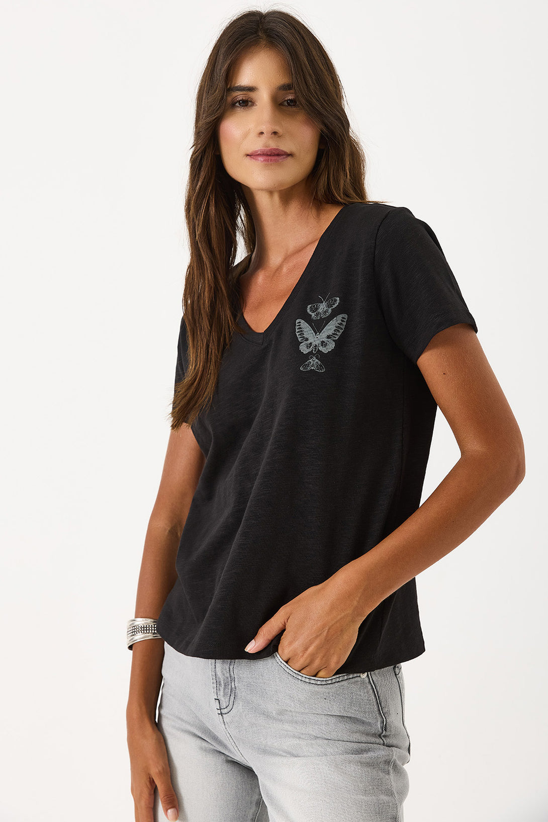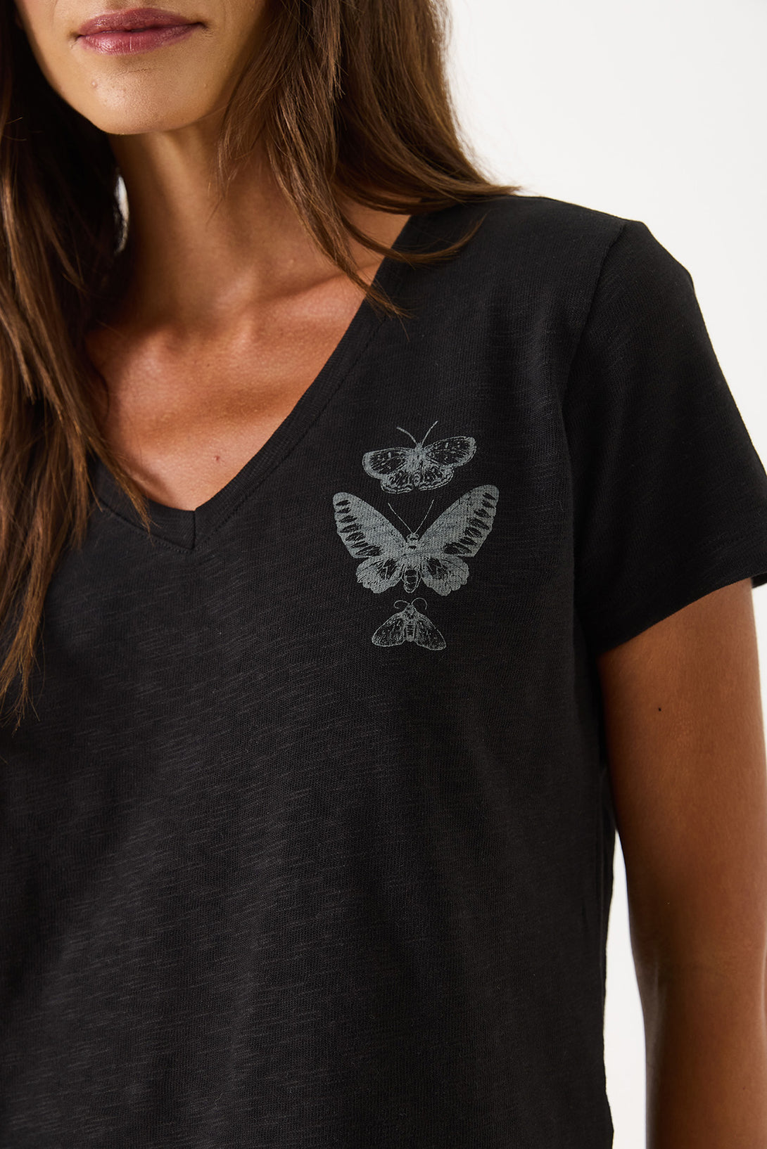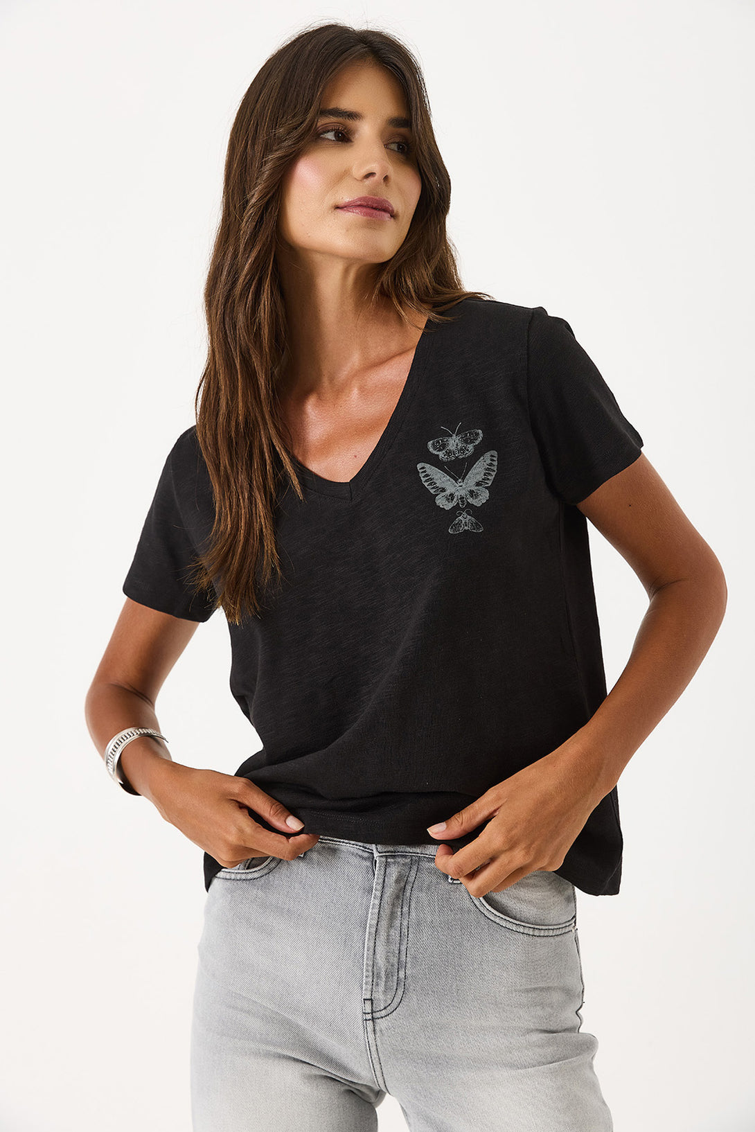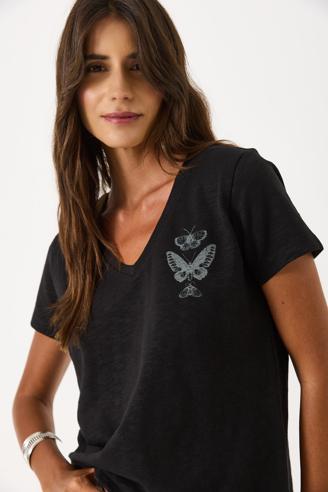 Kelebek Baskılı Flamlı Tişört - SİYAH
