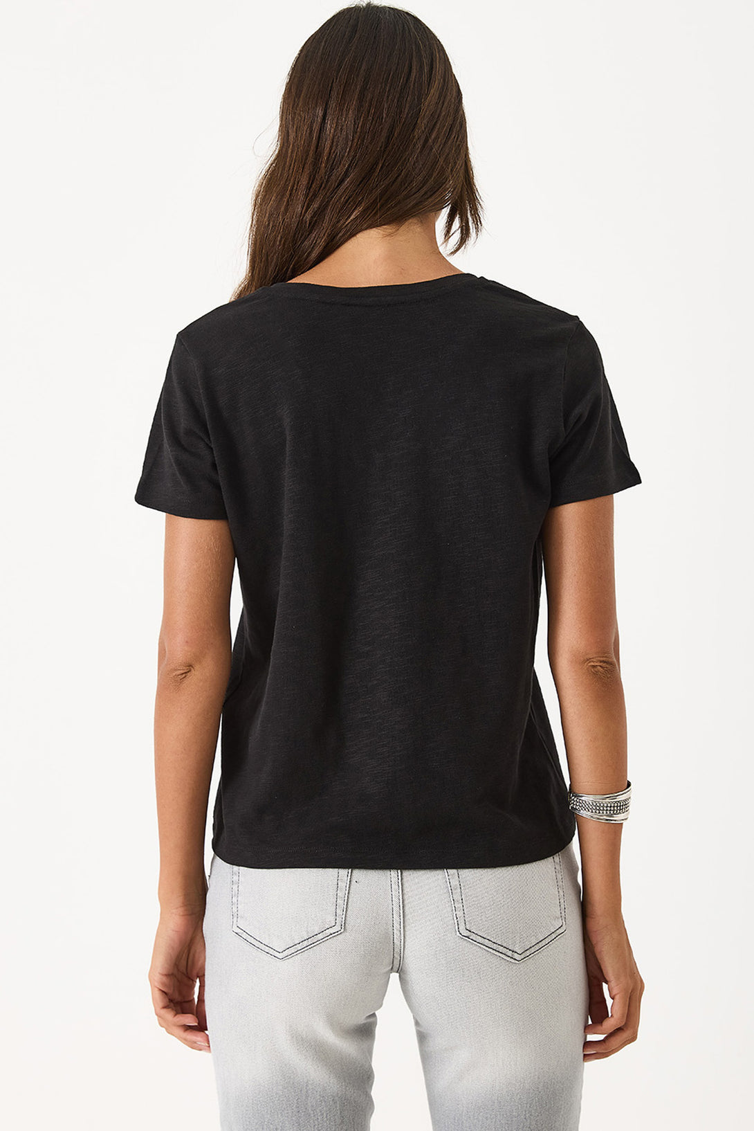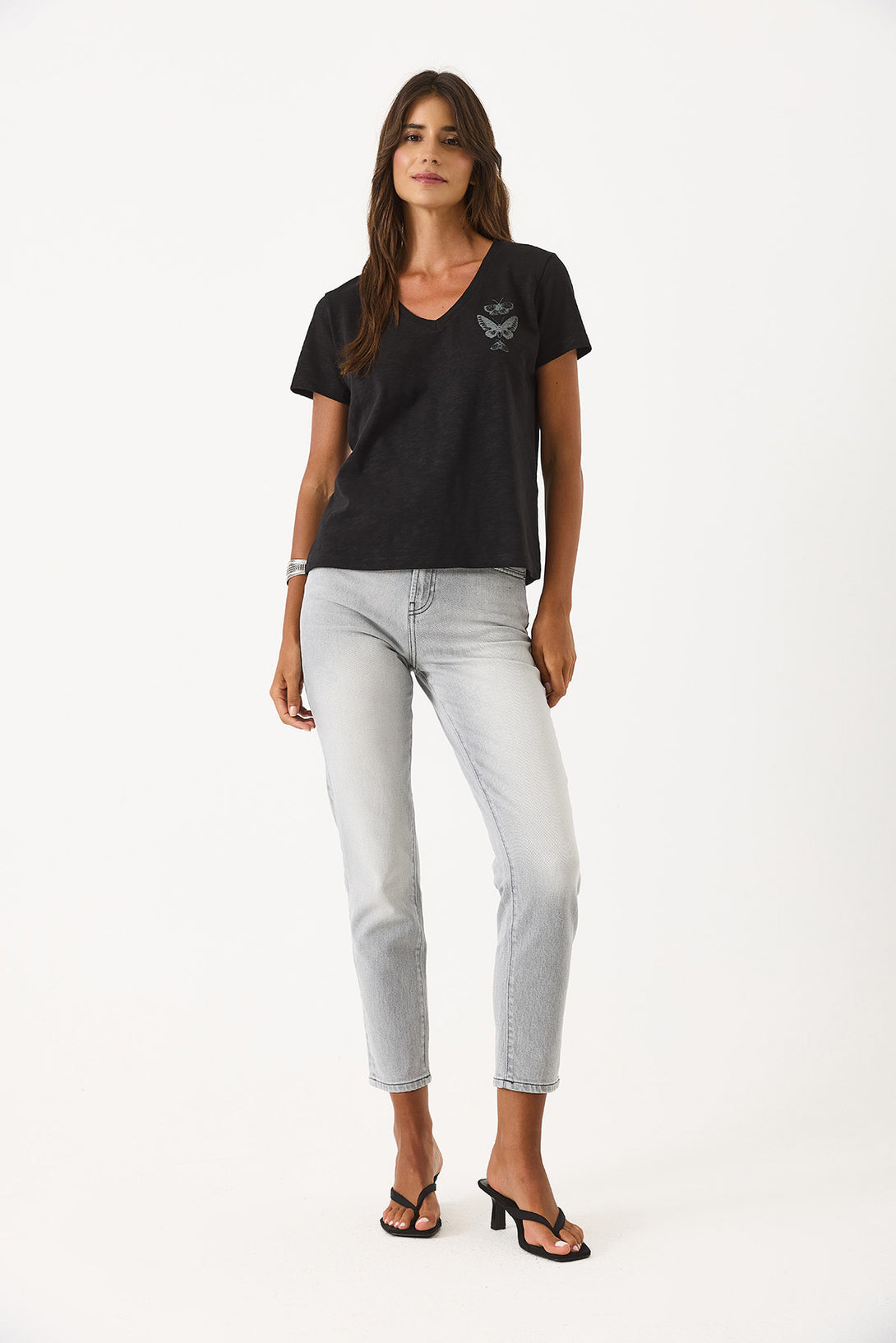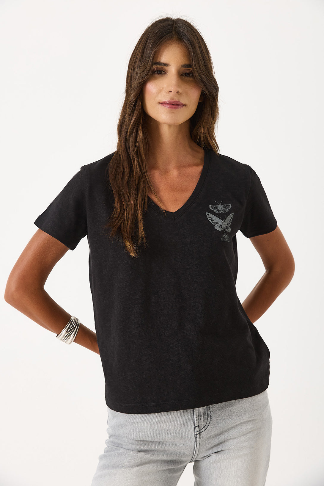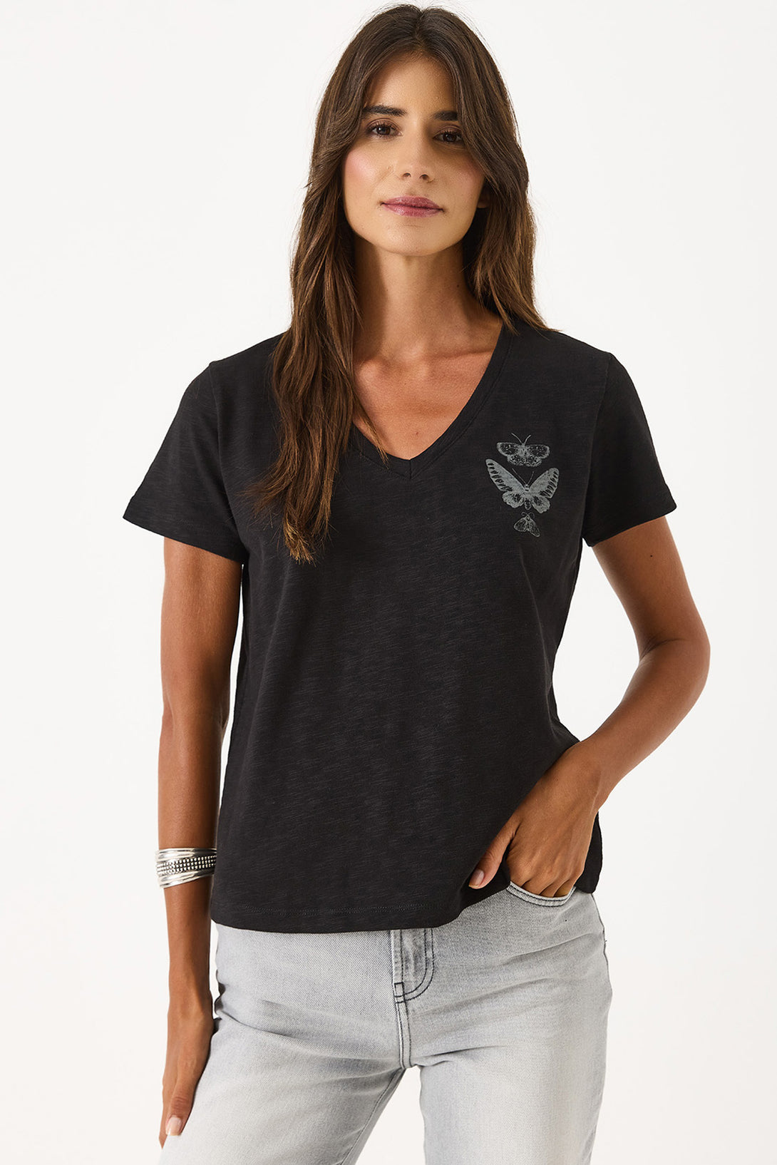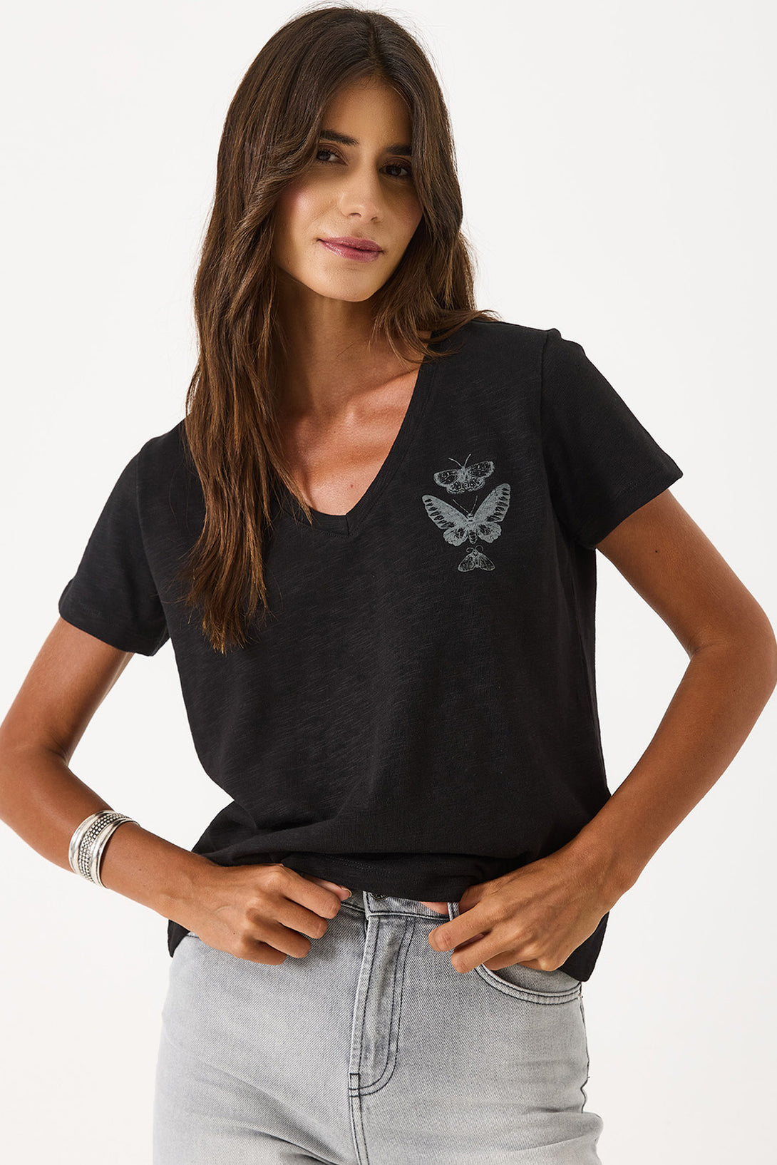 Kelebek Baskılı Flamlı Tişört - SİYAH
