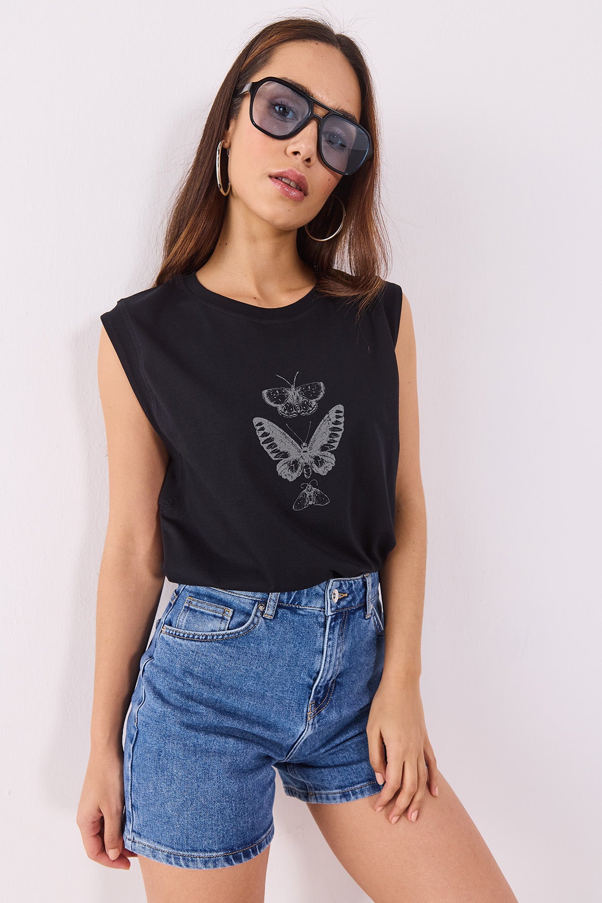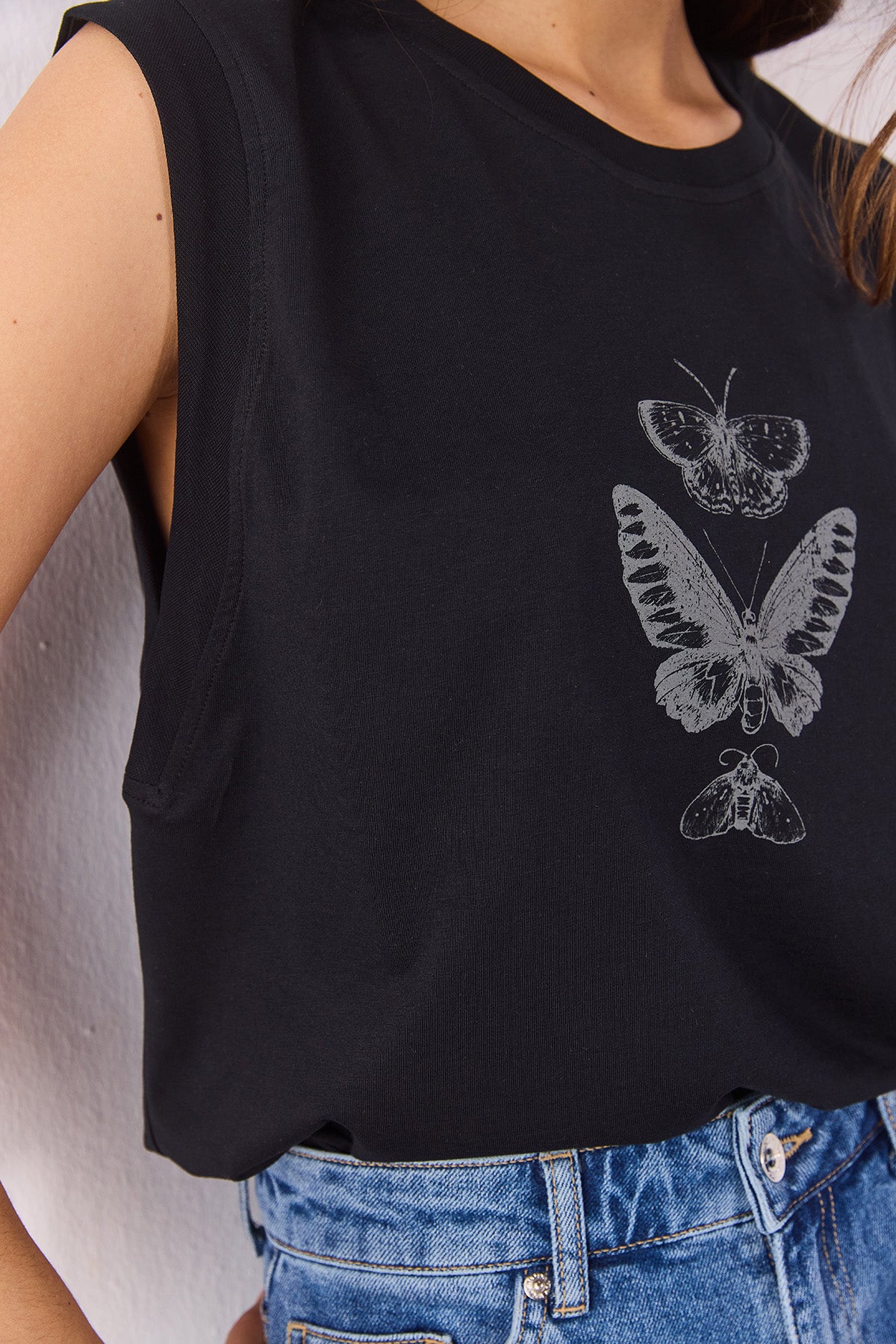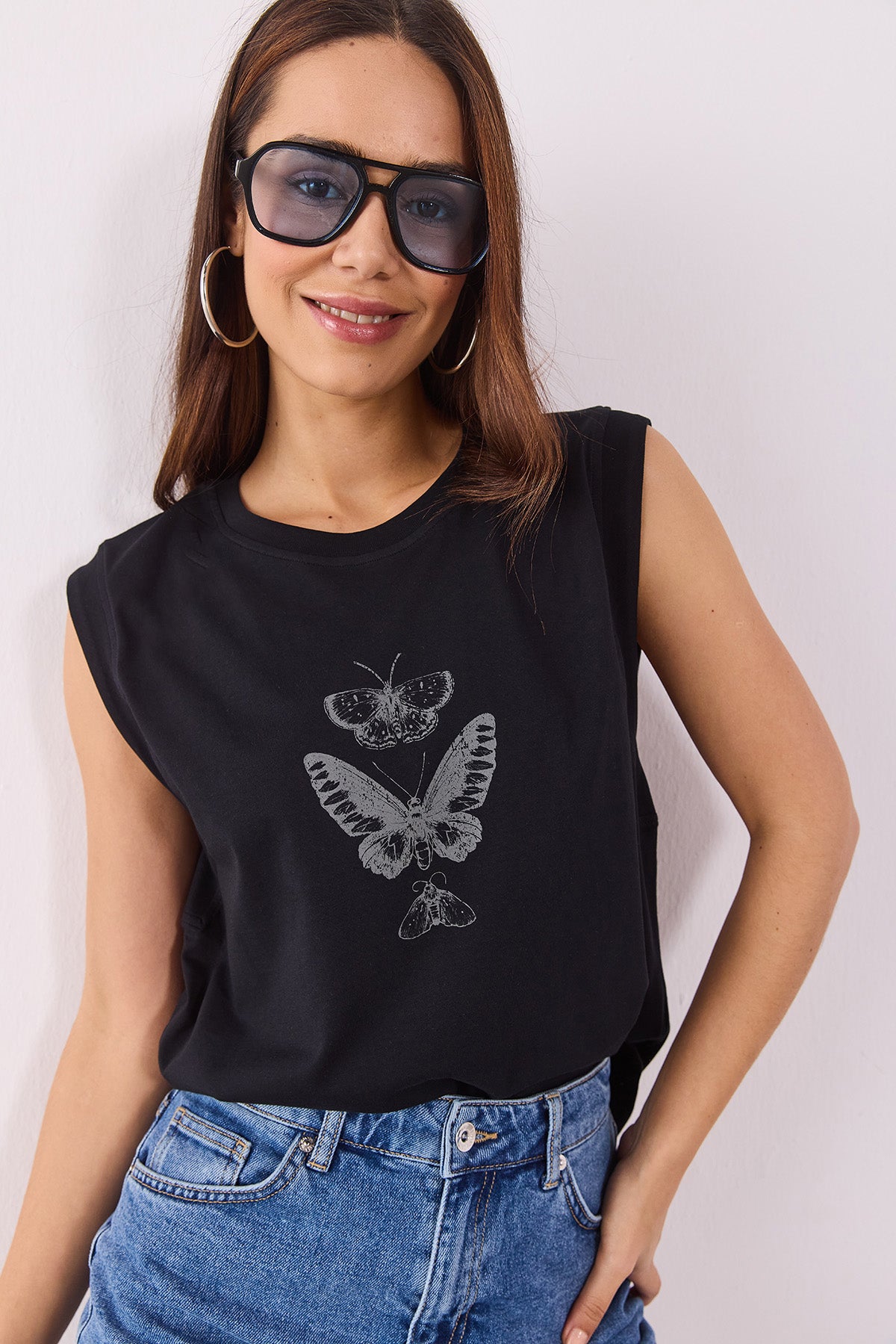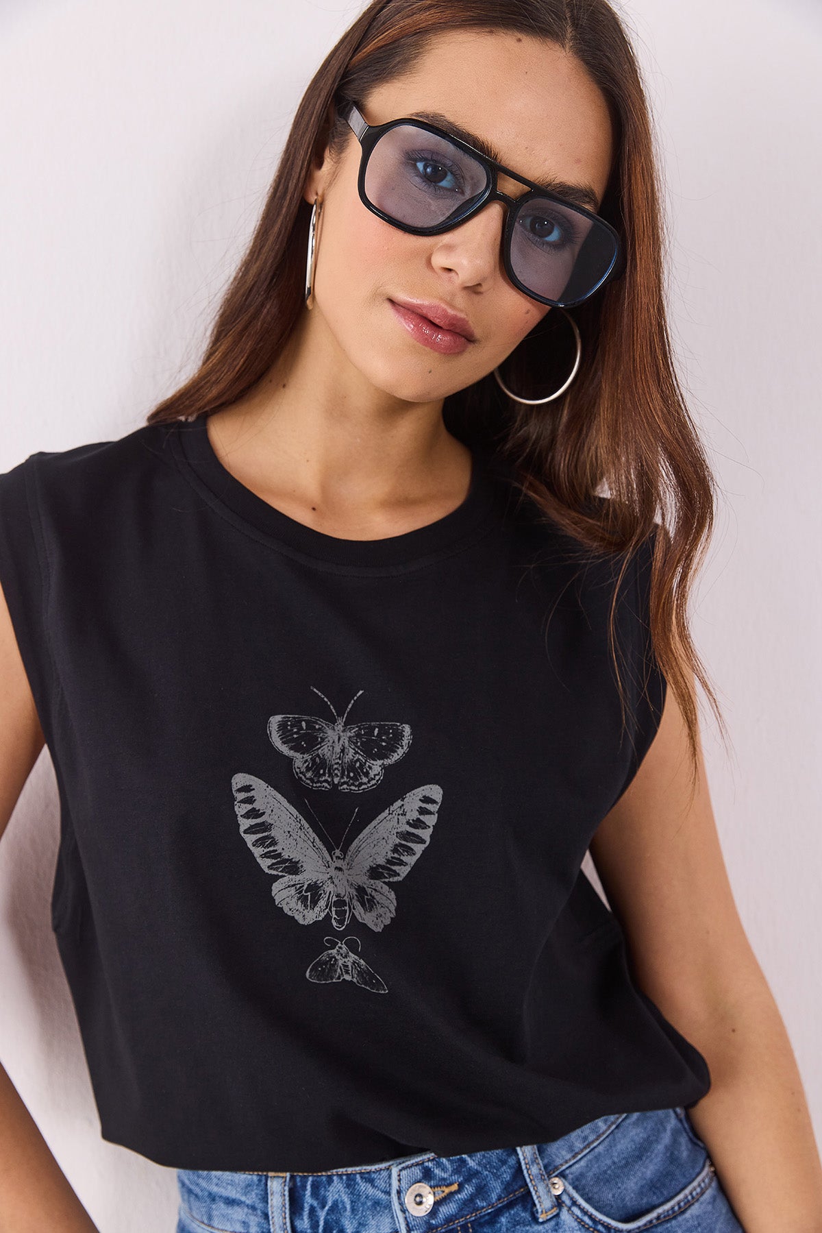 Kadın Kelebek Baskılı Tişört %100 Pamuk - Siyah