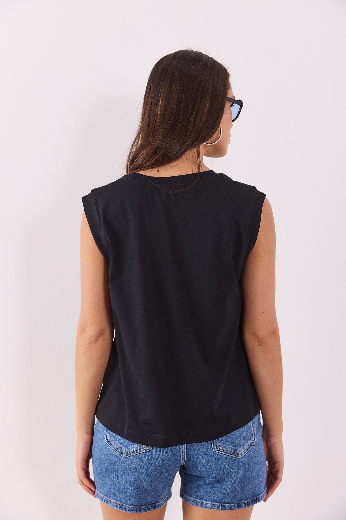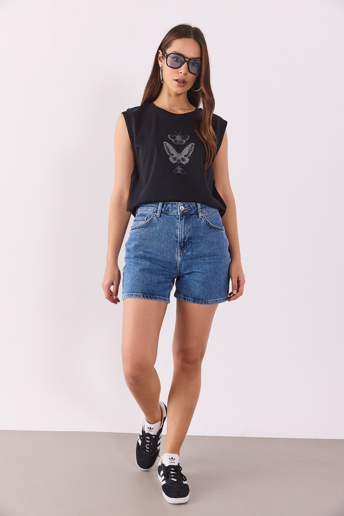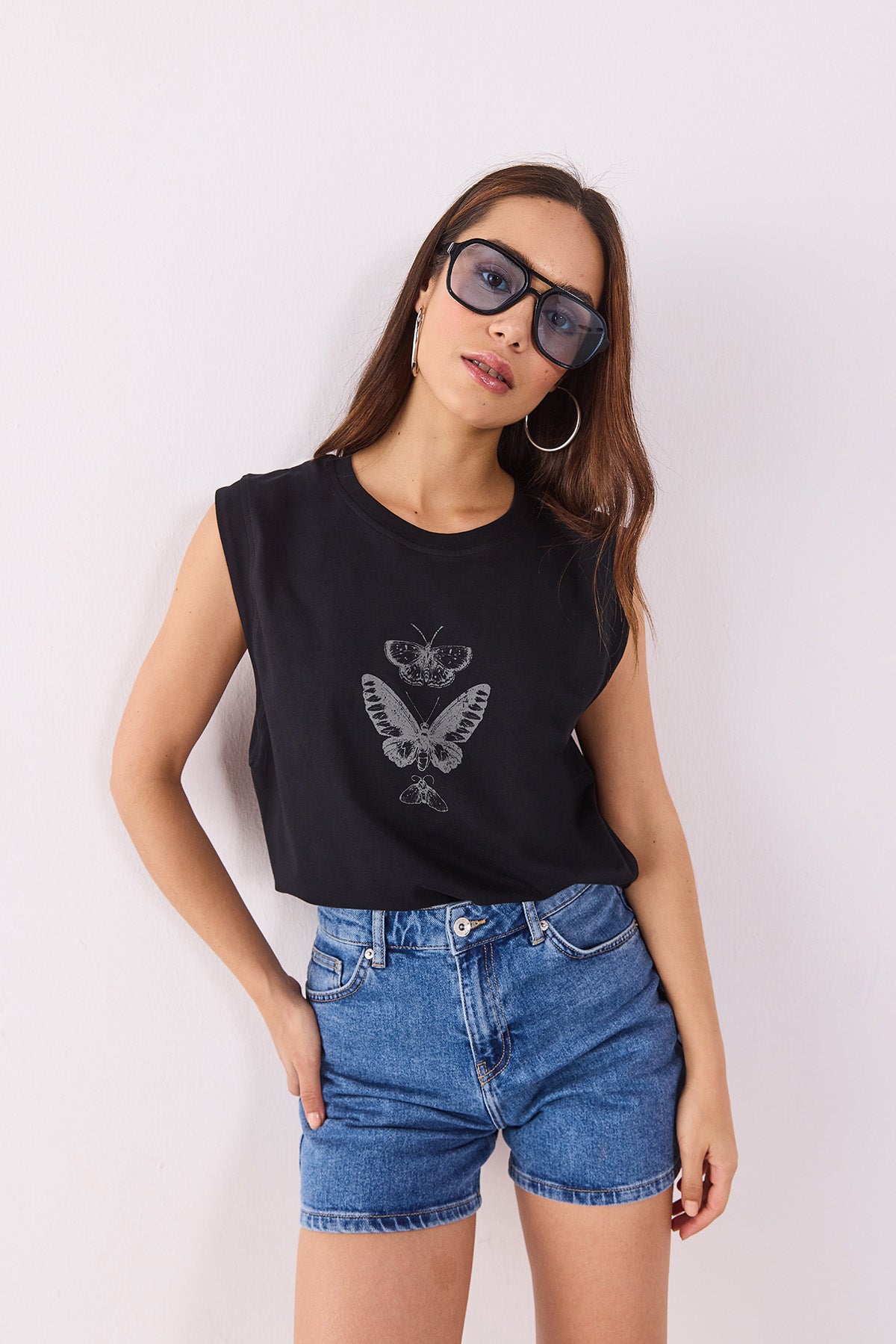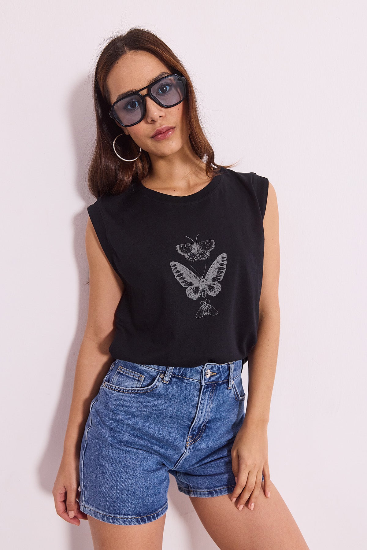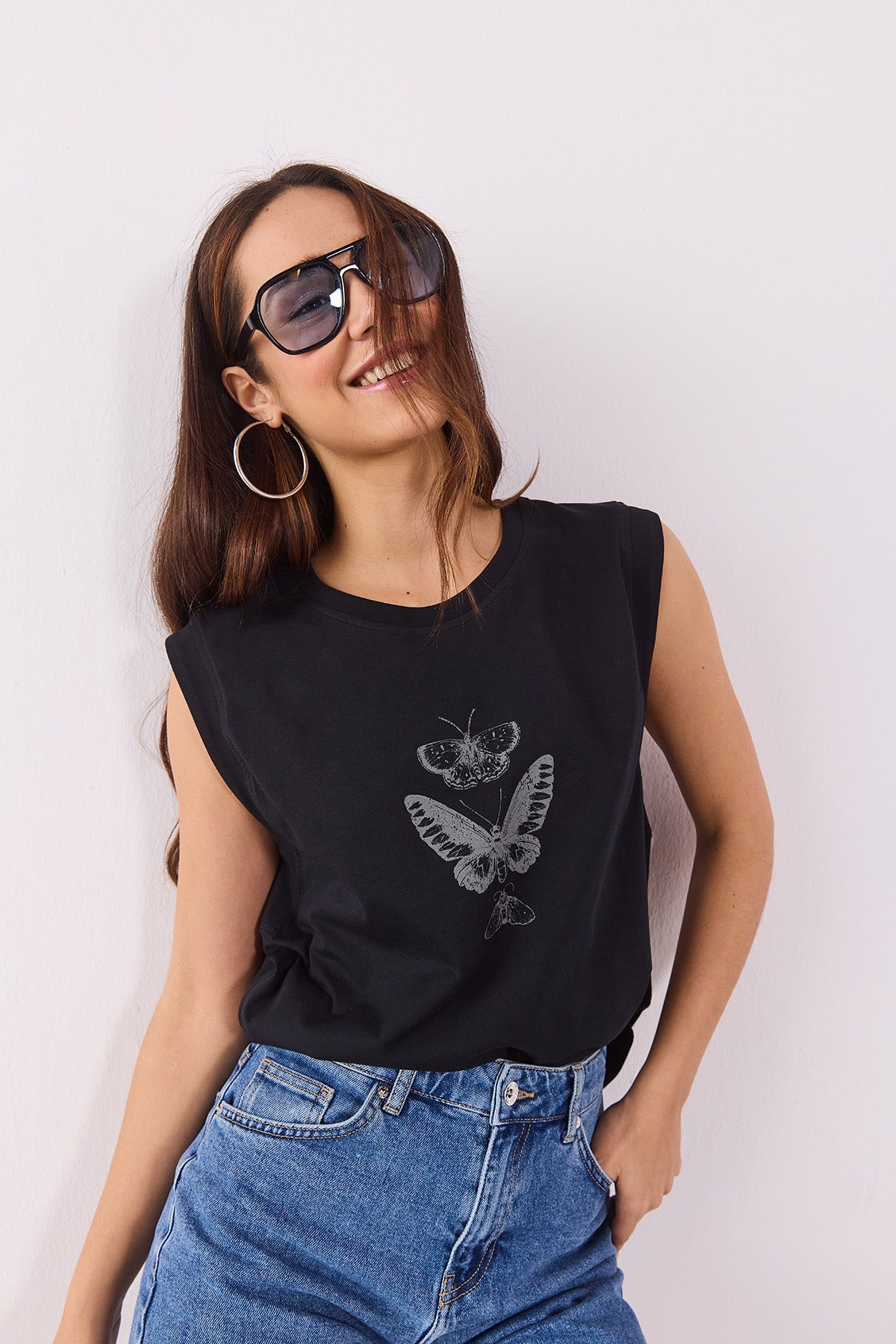 Kadın Kelebek Baskılı Tişört %100 Pamuk - Siyah