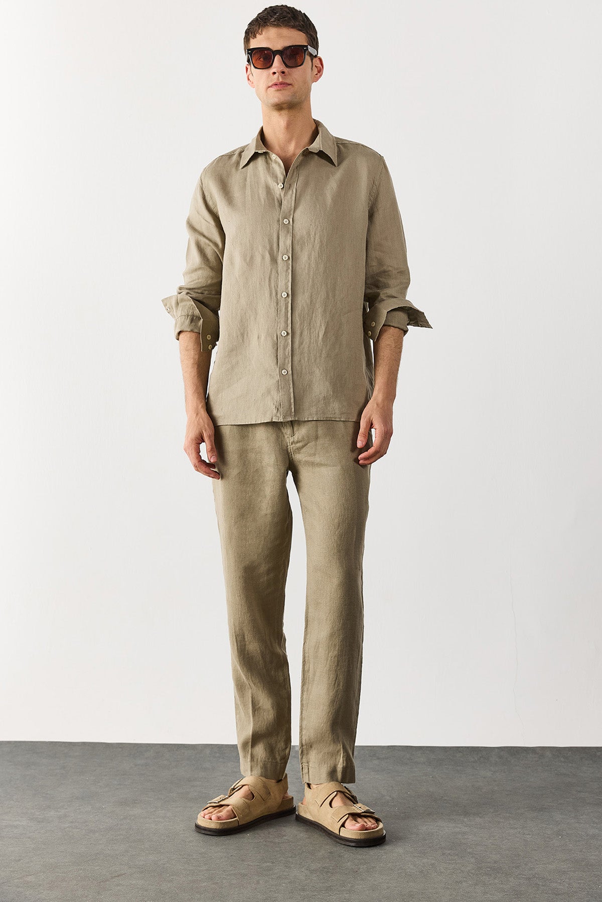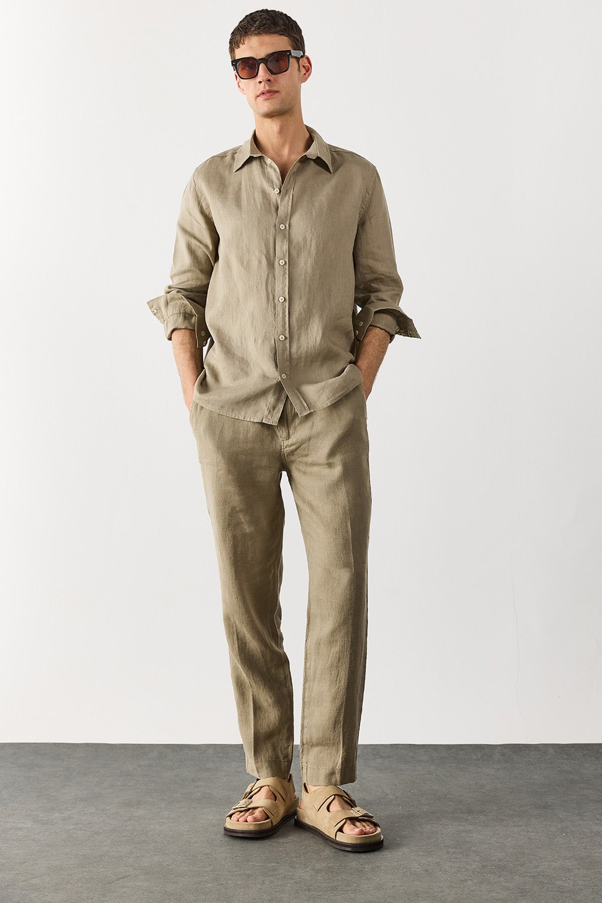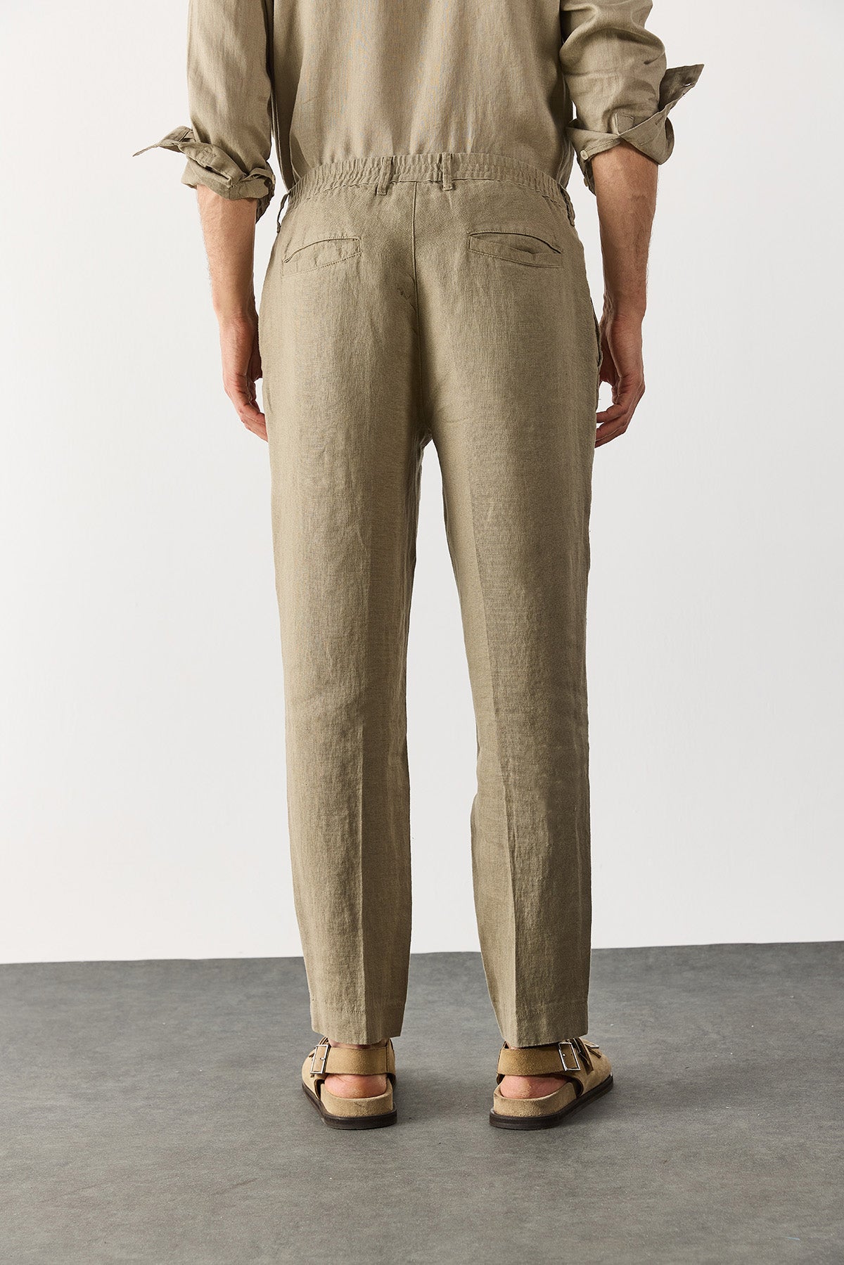 Erkek Ken Beli Lastikli Chino Pantolon %100 Keten - Haki