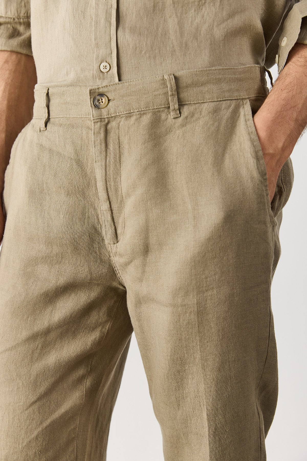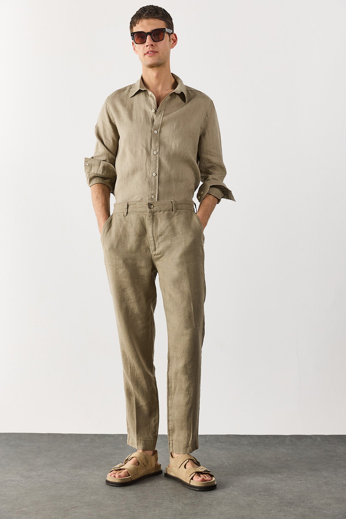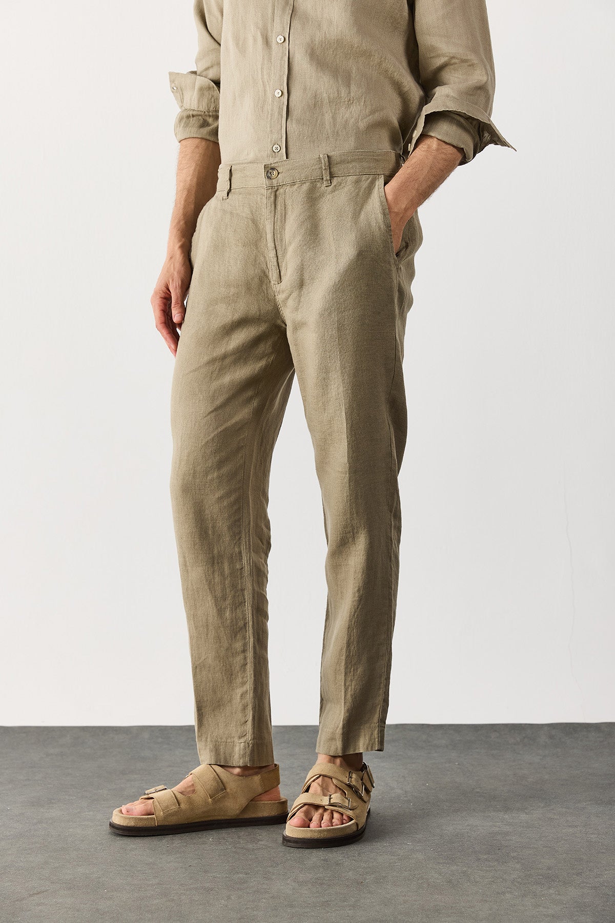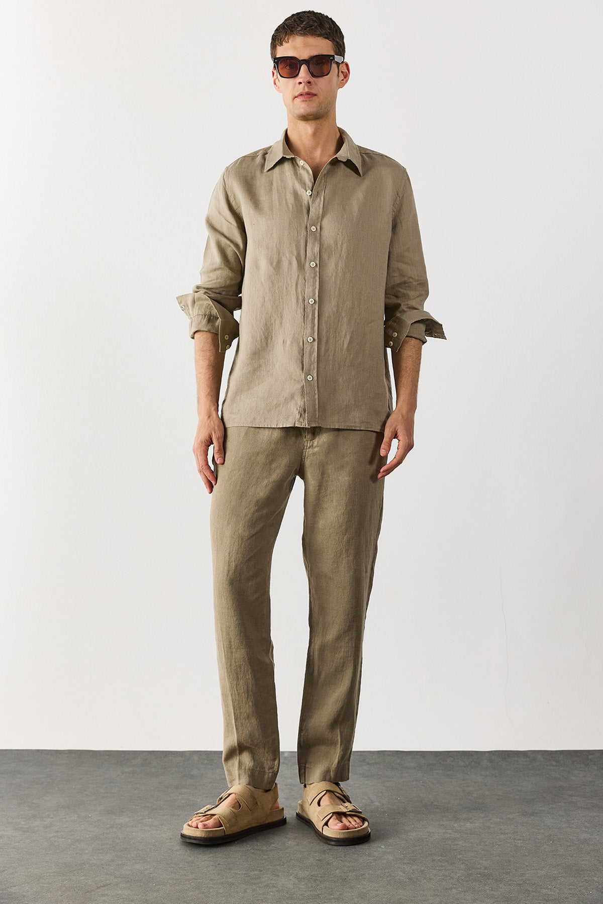 Erkek Ken Beli Lastikli Chino Pantolon %100 Keten - Haki