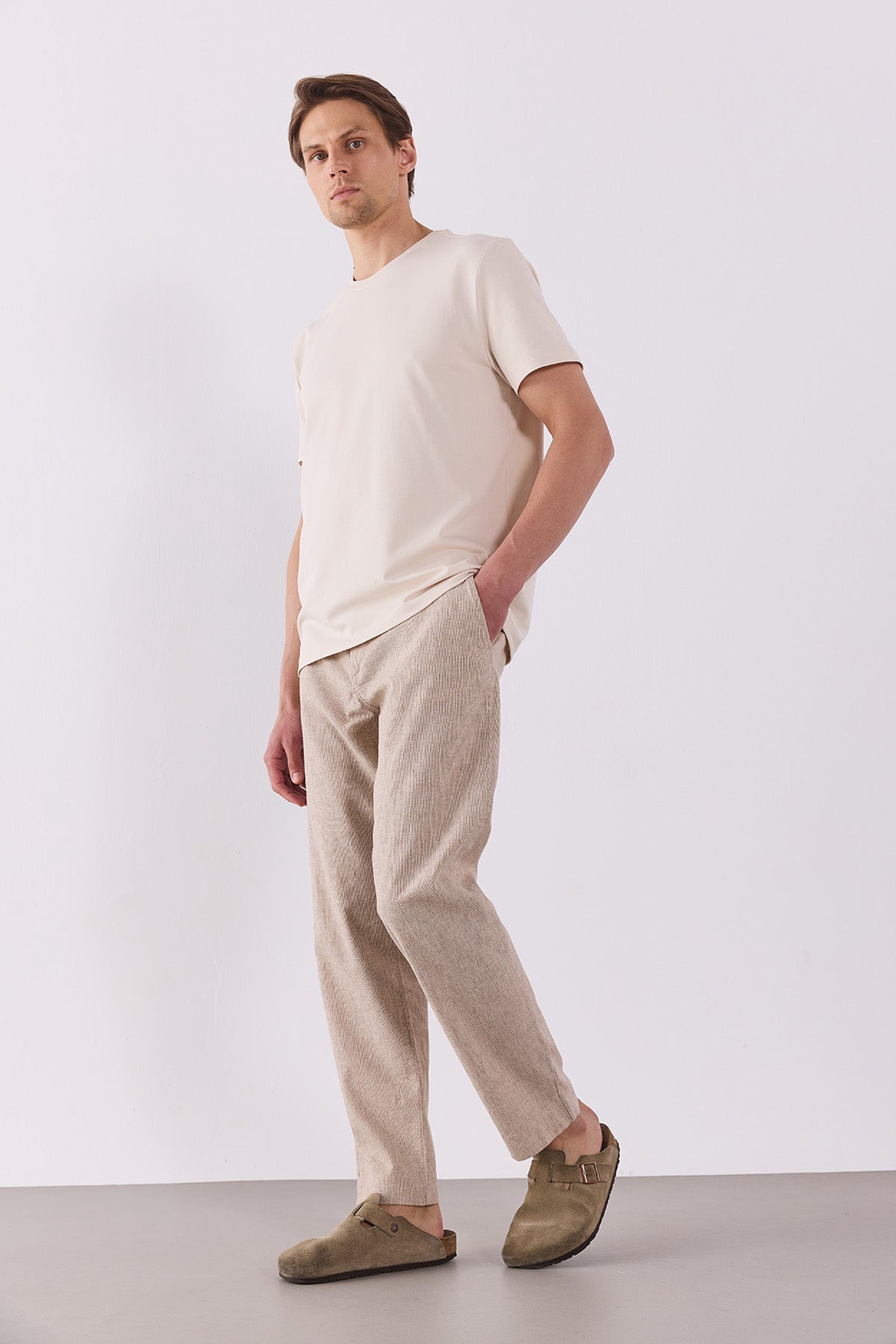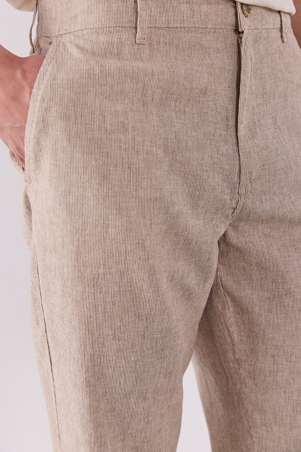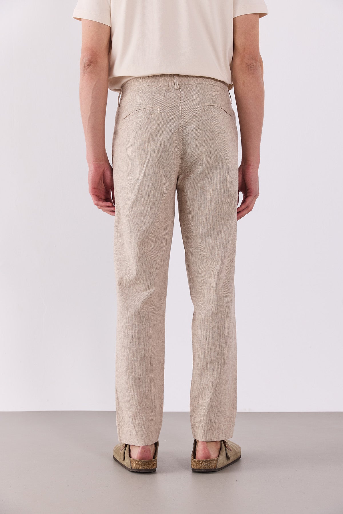 Erkek Ken Beli Lastikli Lycra Keten Chino Pantolon - Kahve Çizgili