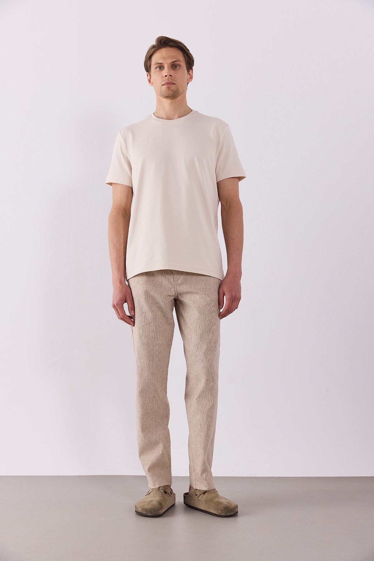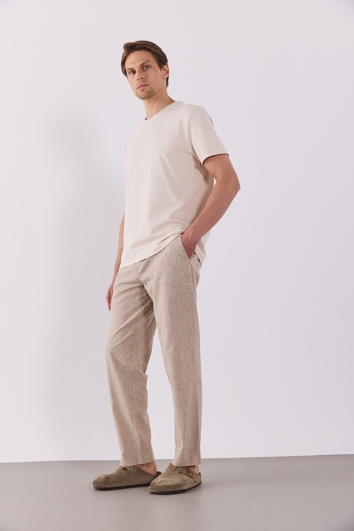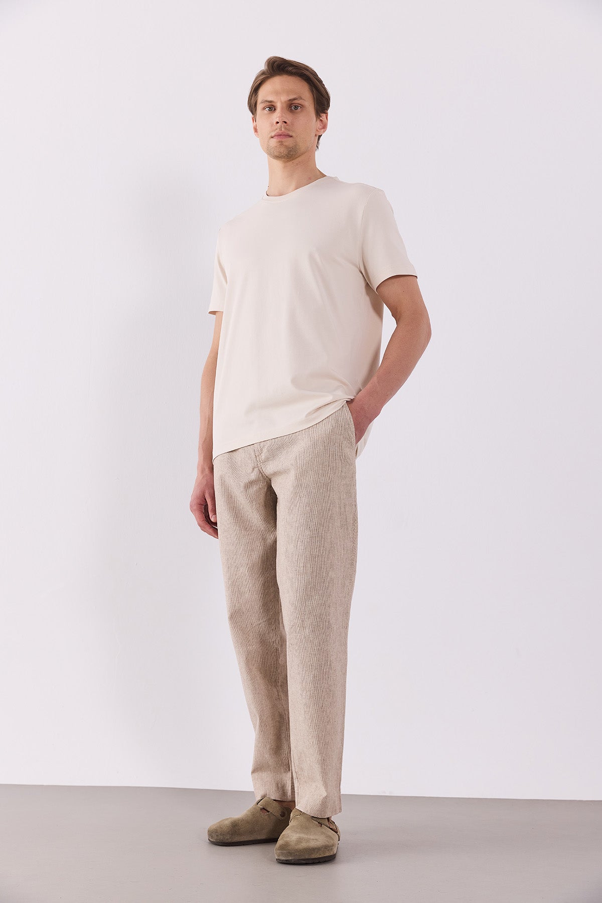 Erkek Ken Beli Lastikli Lycra Keten Chino Pantolon - Kahve Çizgili