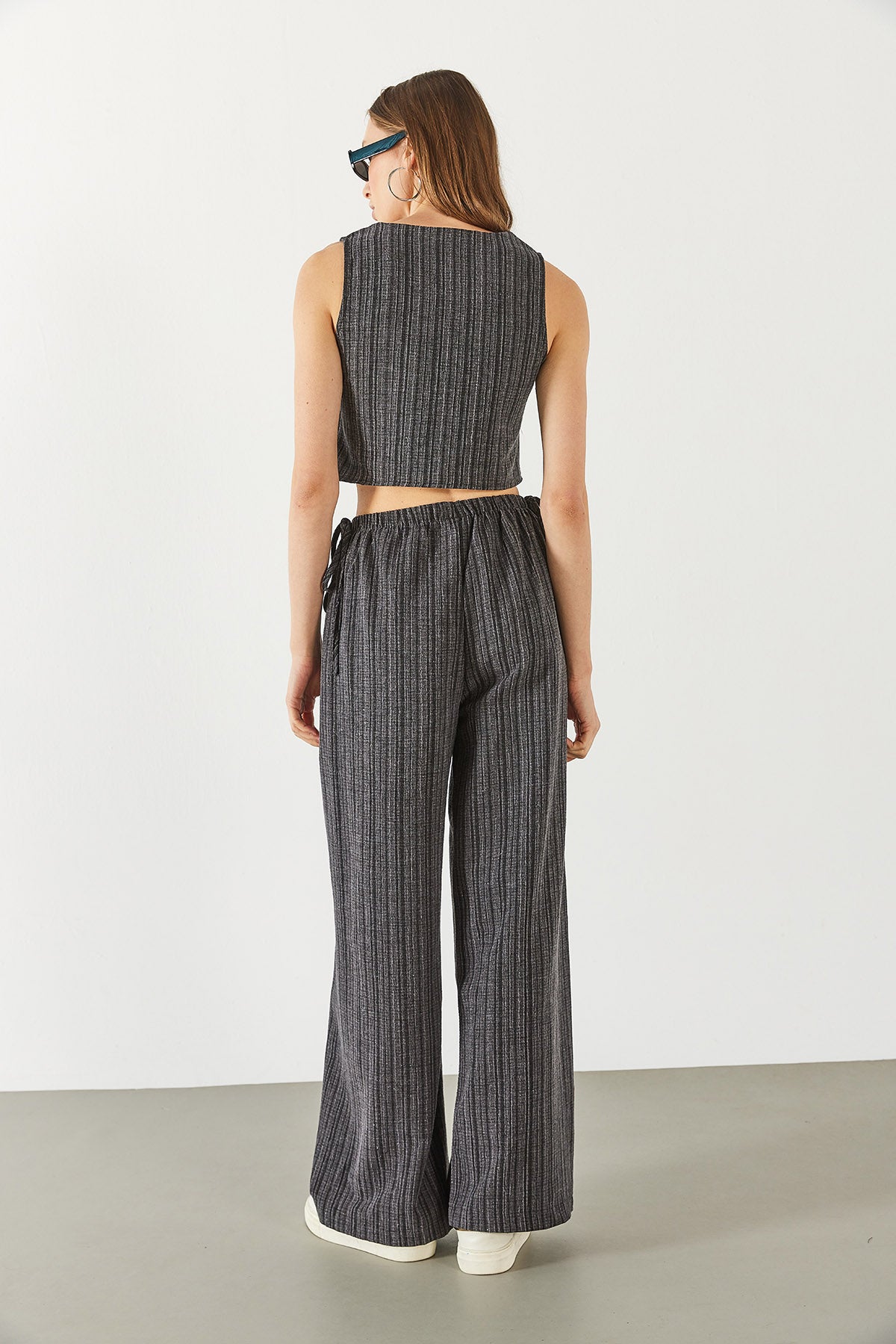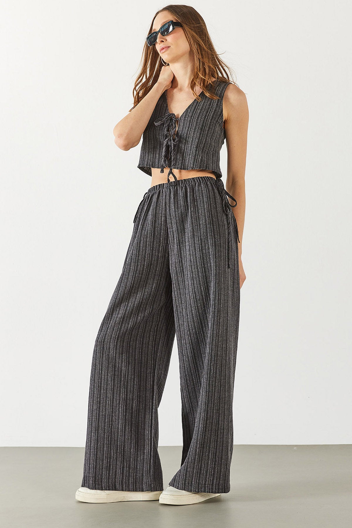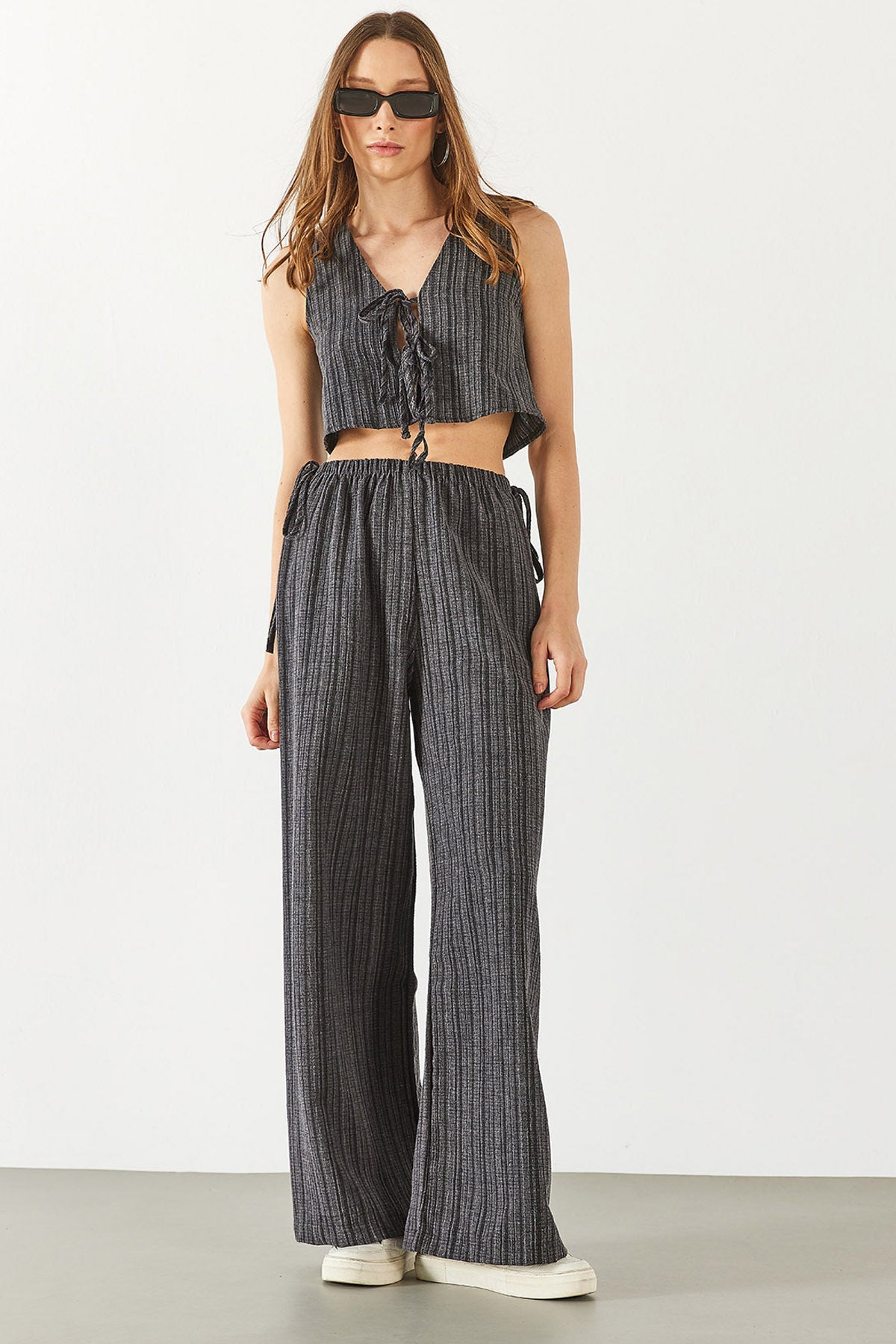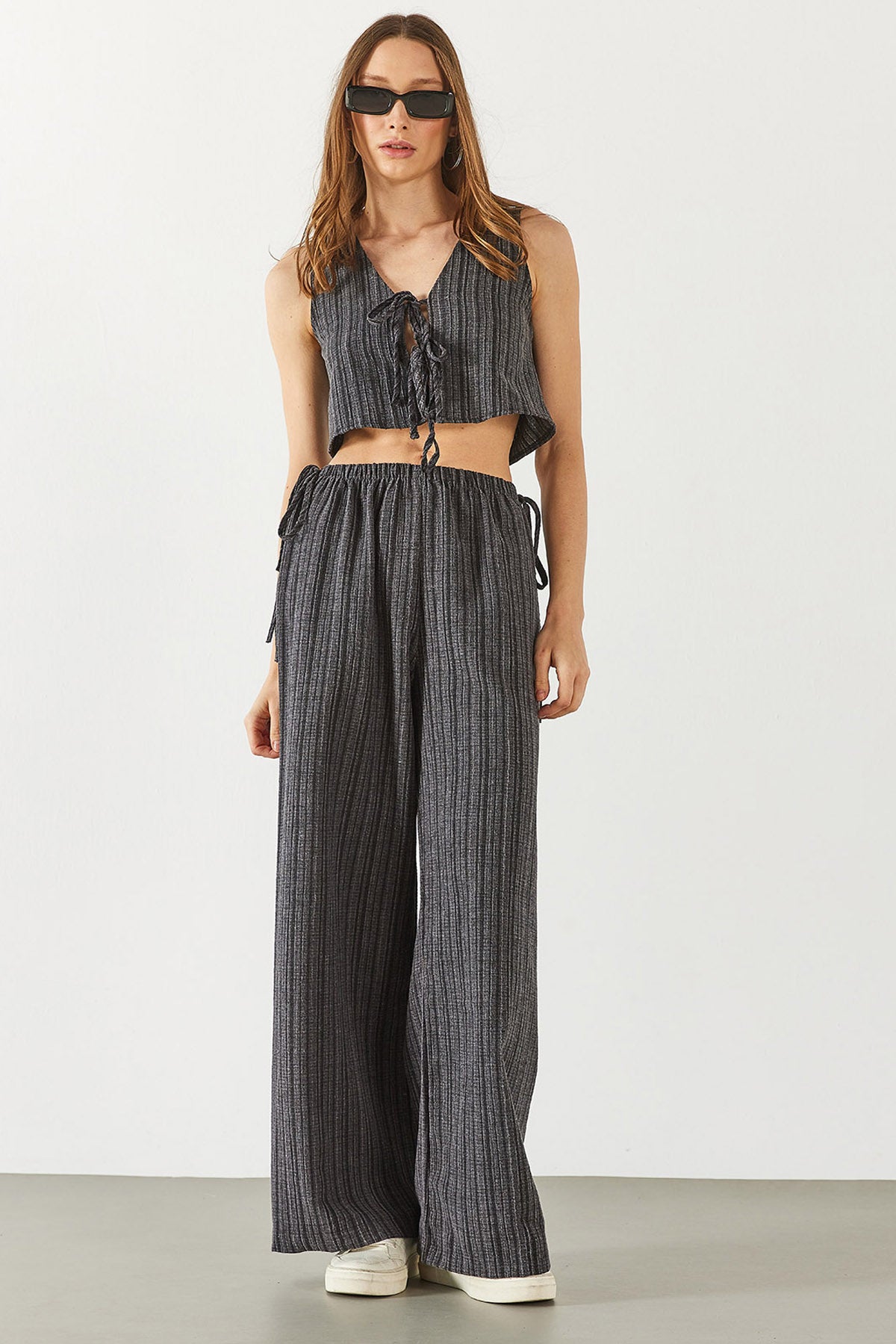 Kadın Keten Görünümlü Beli Lastikli Pantolon - Siyah