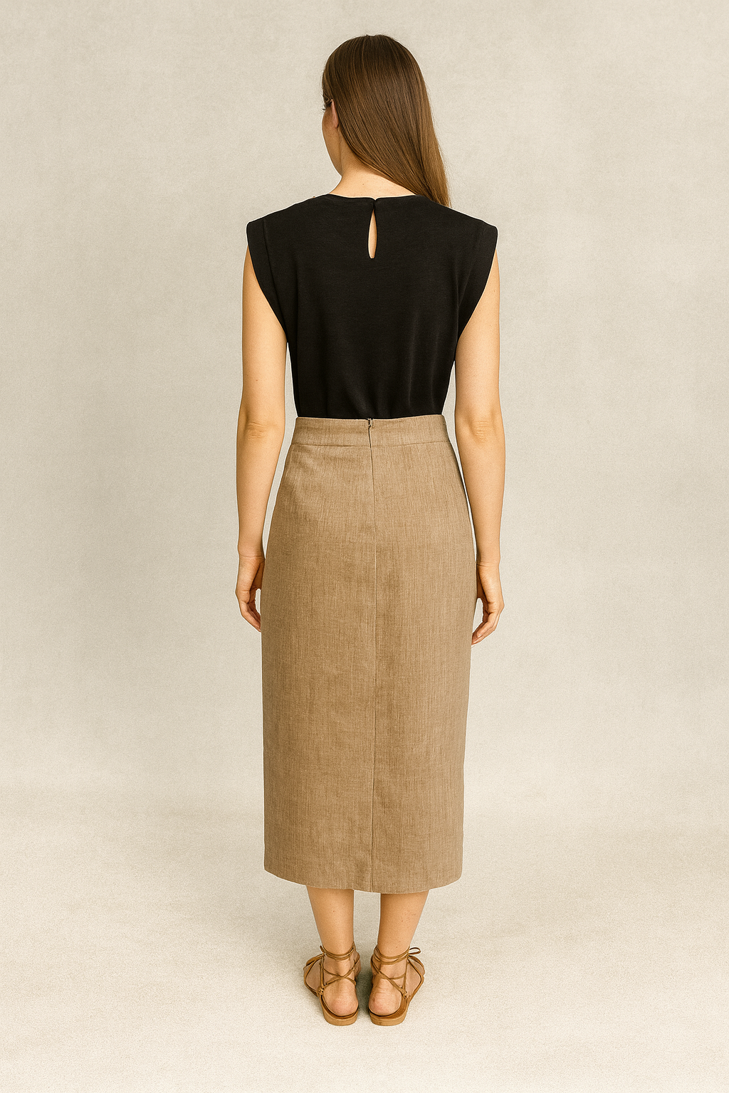 Keten Karışımlı Yandan Büzgülü Midi Etek - SÜTLÜ KAHVE
