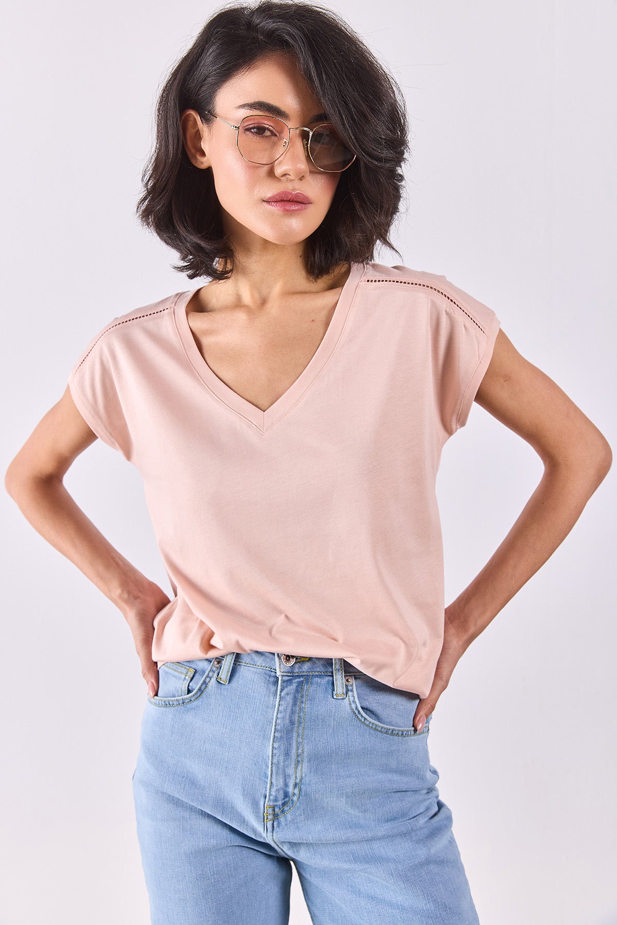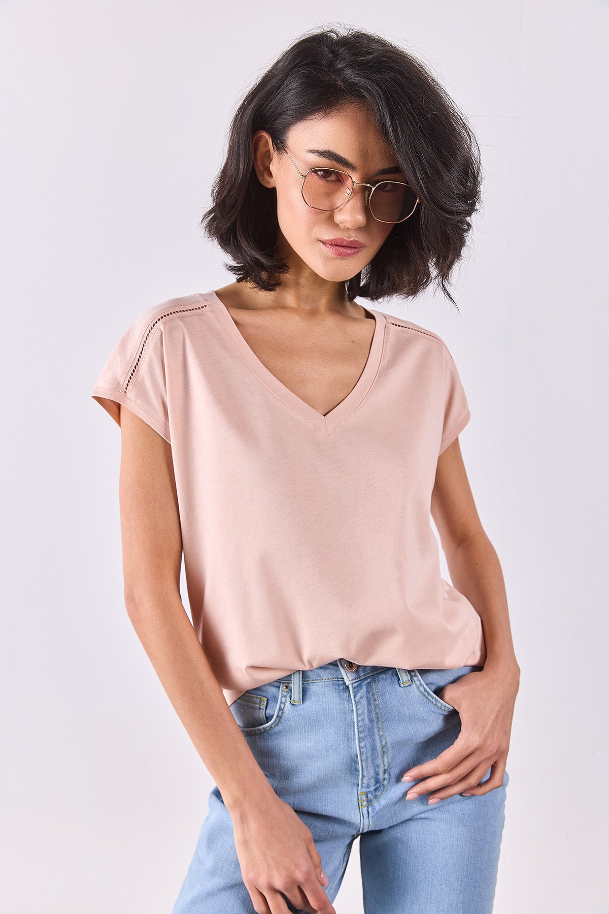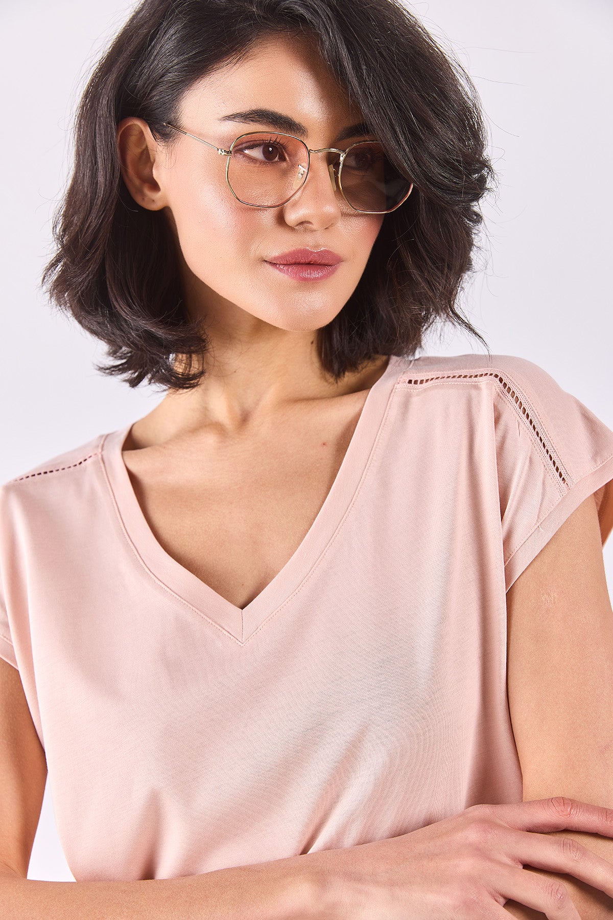 Kadın Khloe V Yaka Regular Fit Dantel Detaylı Modal Tişört (TENCEL)™ - Pudra