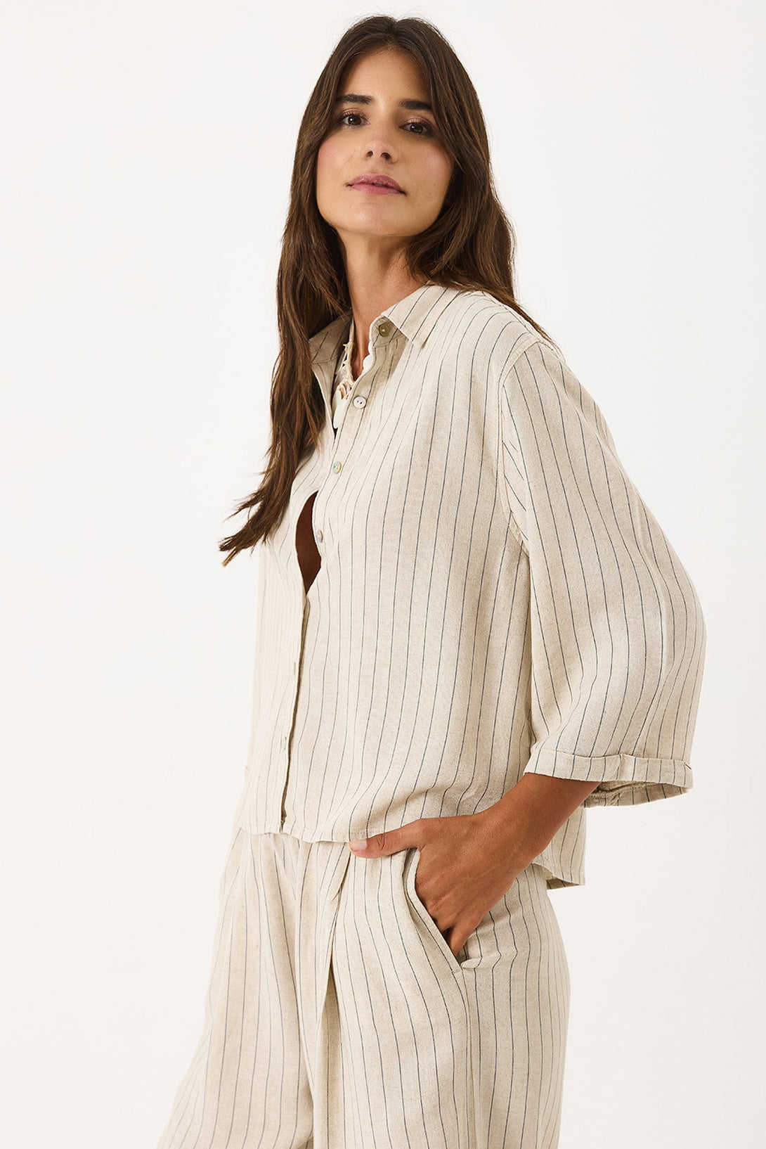 Modal ve polyester karışımı, yumuşacık dokusuyla oversize kesim gömlek. Konforlu ve şık, sıcak günlerde rahat kullanım için ideal.