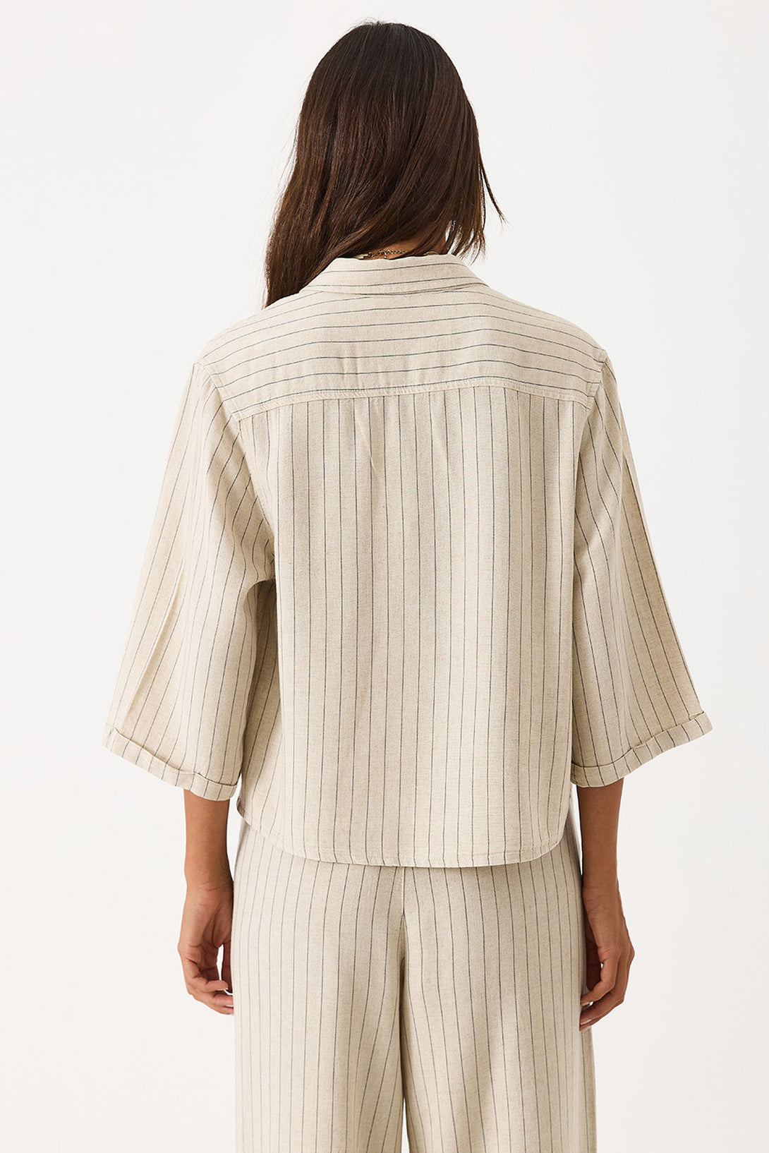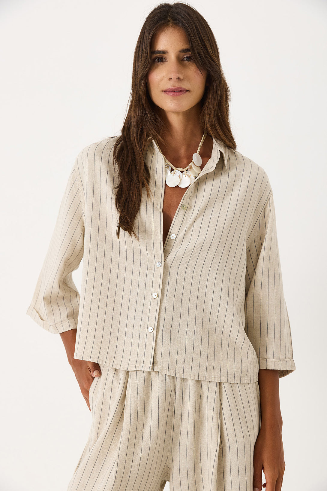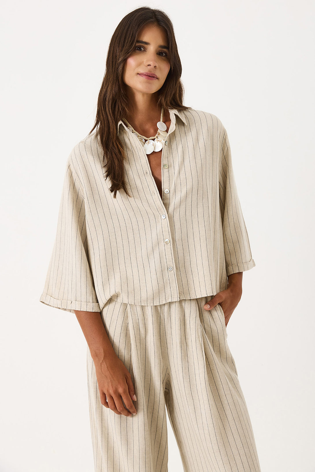 Kadın Kısa Kollu Çizgili Oversize Gömlek - Bej Çizgili