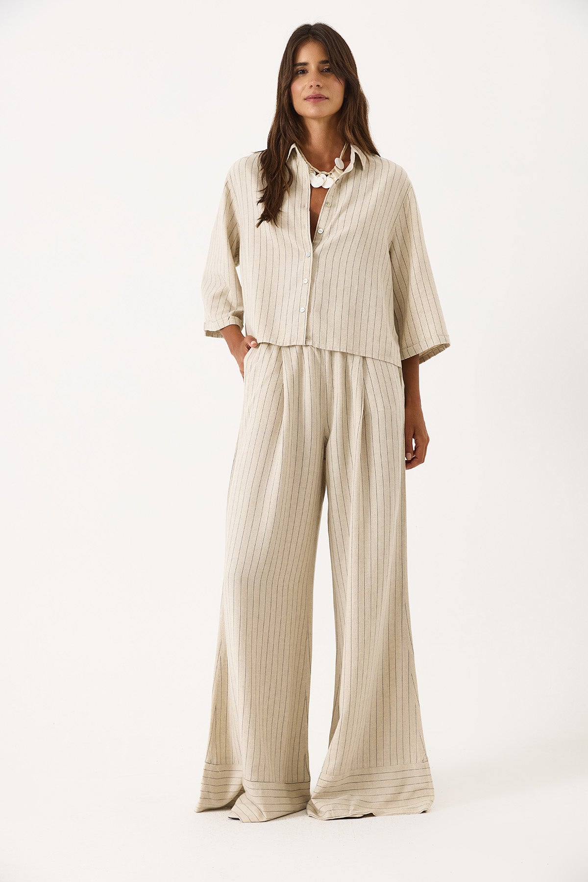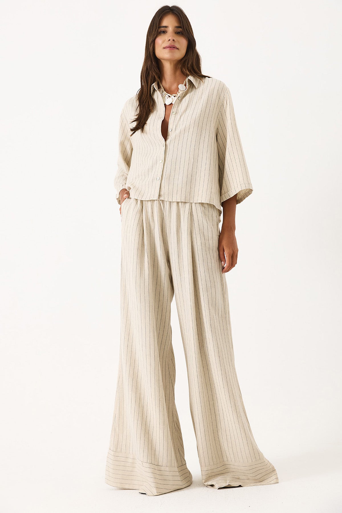 Kadın Kısa Kollu Çizgili Oversize Gömlek - Bej Çizgili