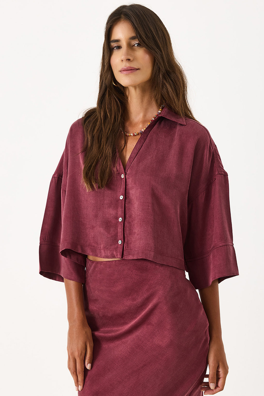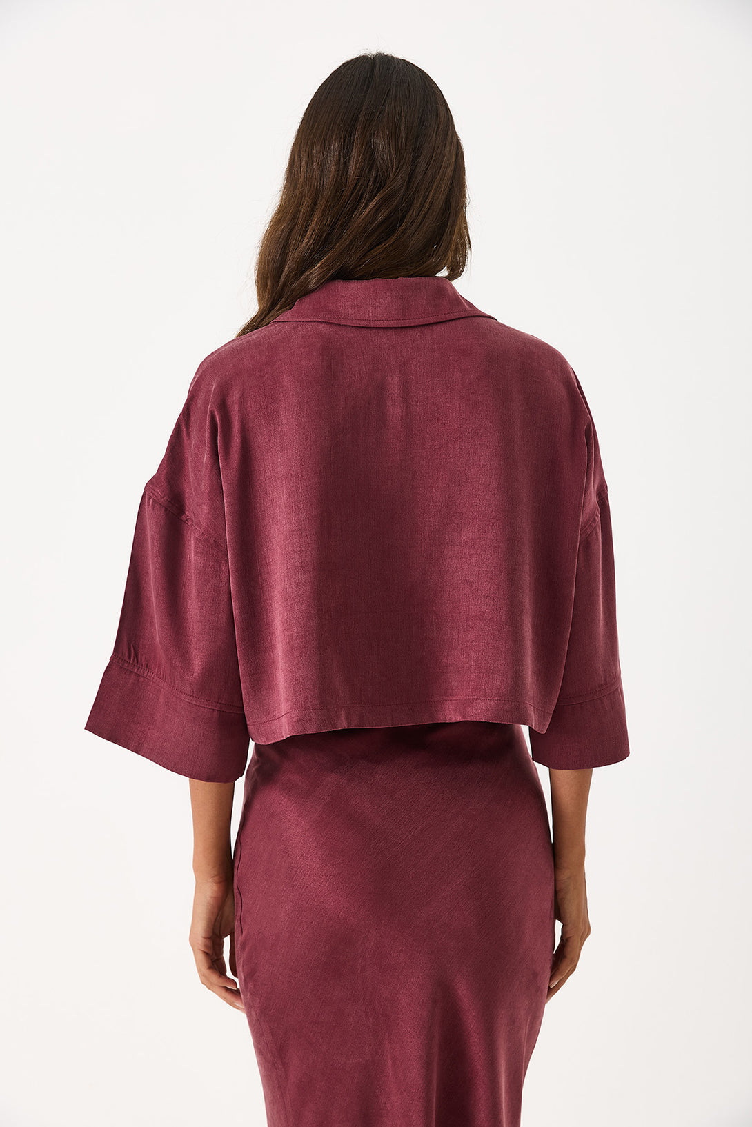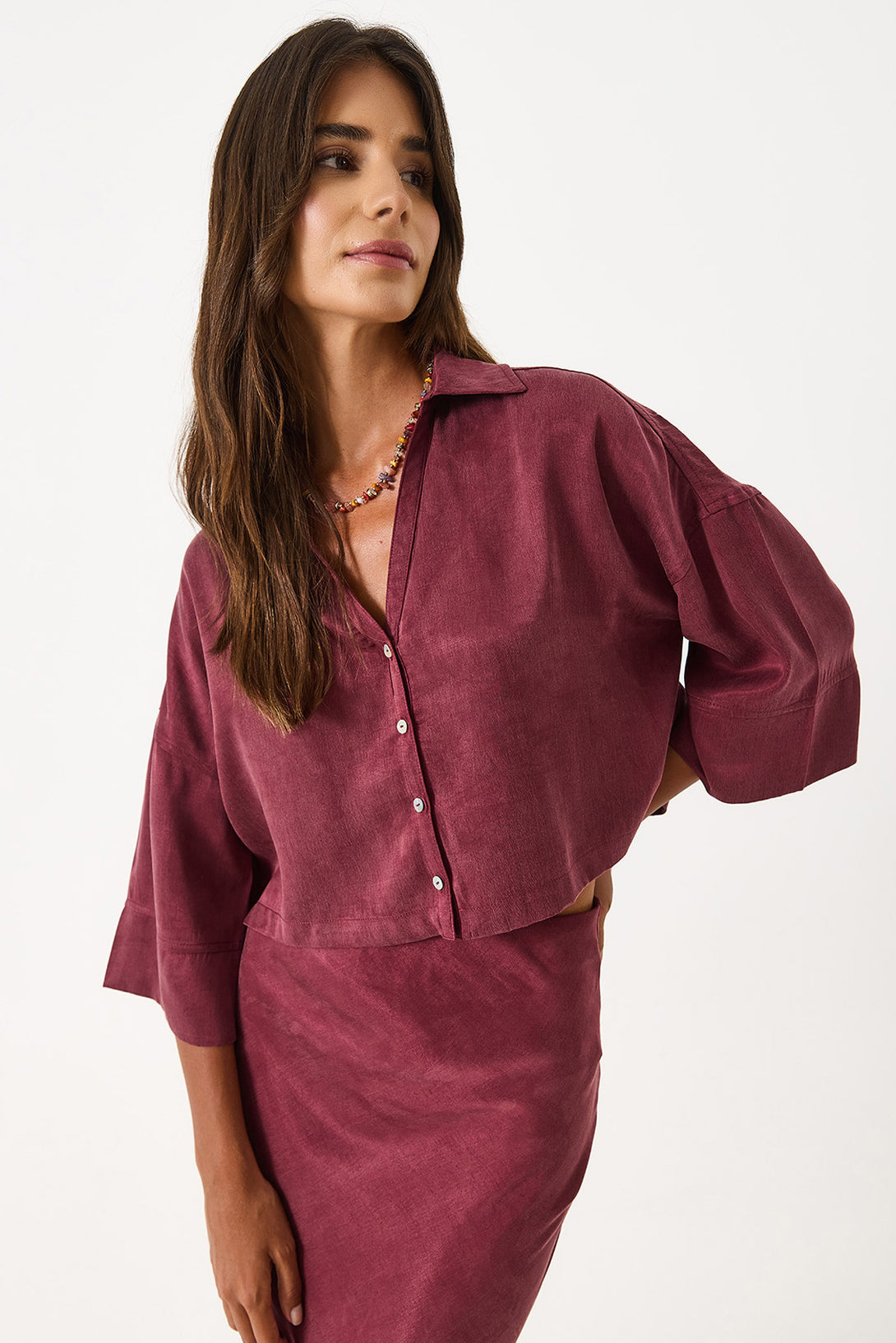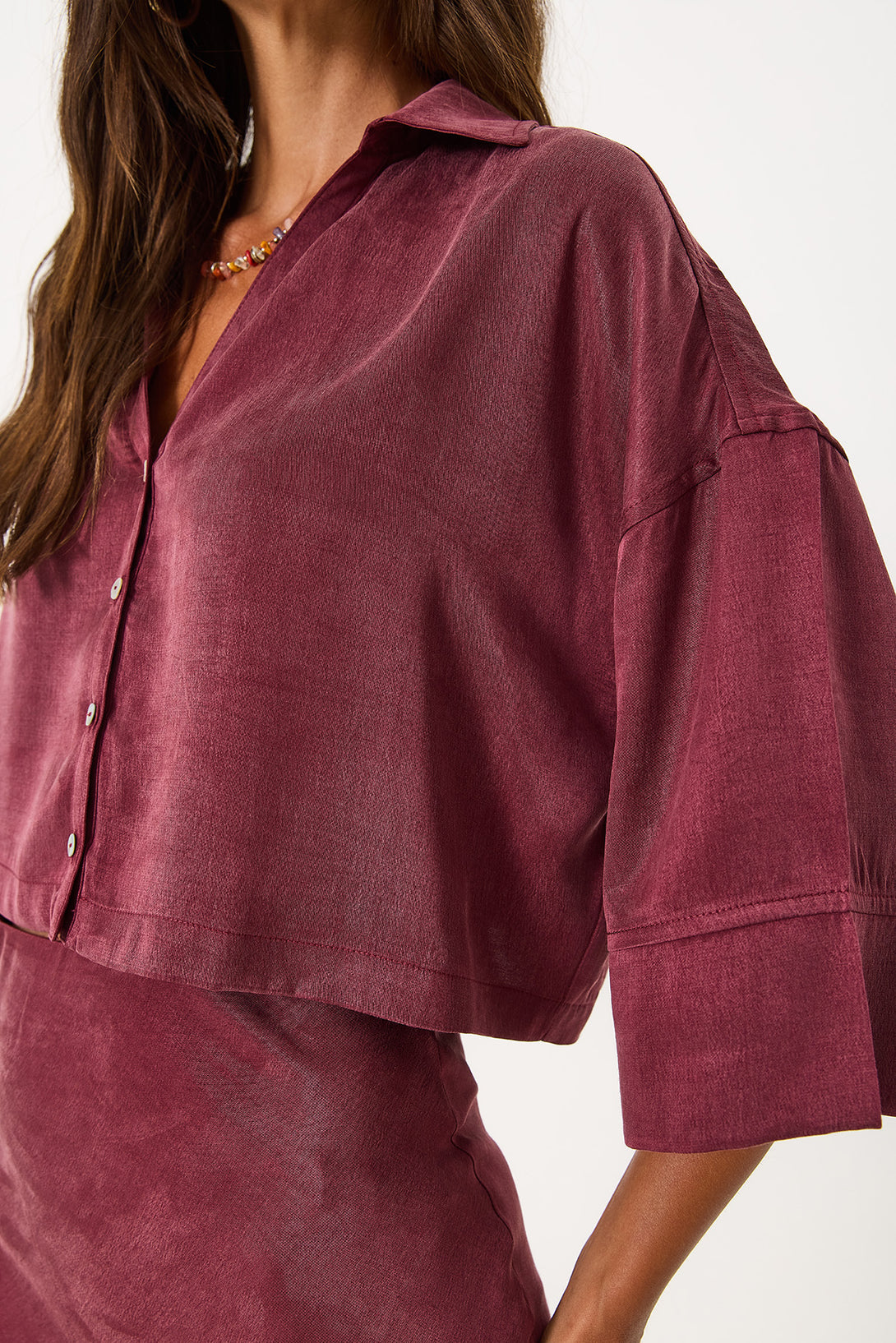 Kadın Kısa Kollu Lyocell Saten Gömlek - Bordo