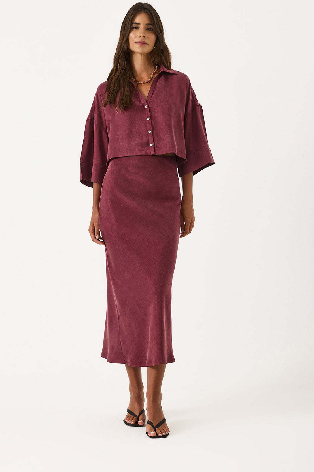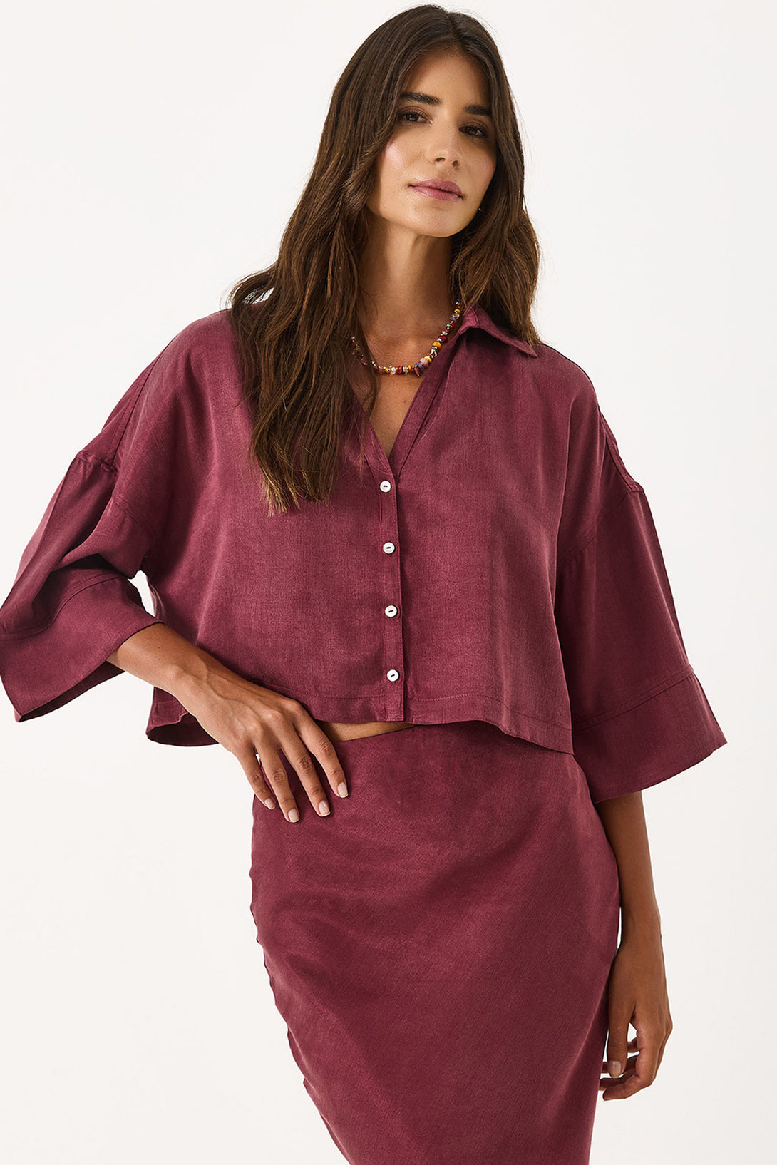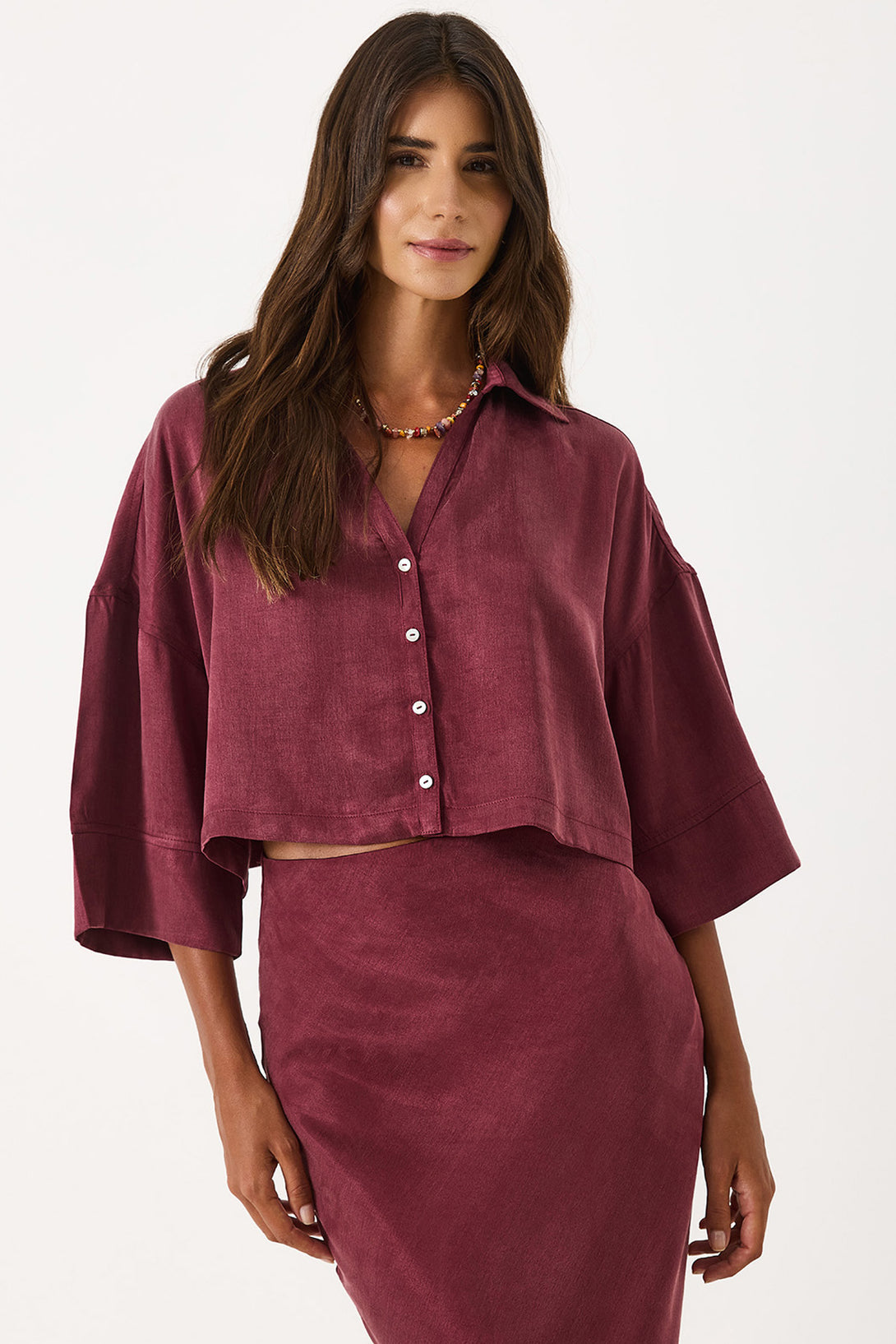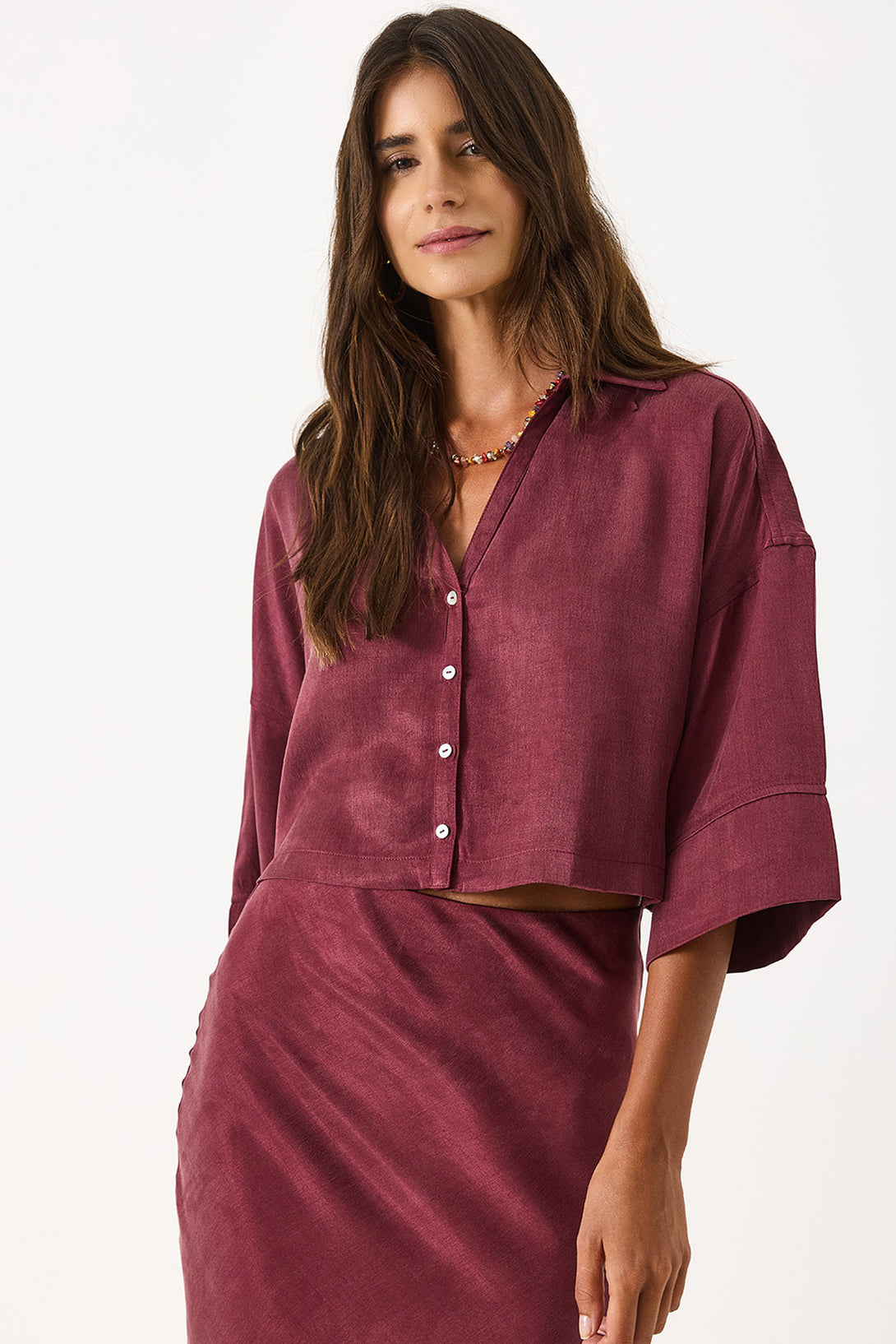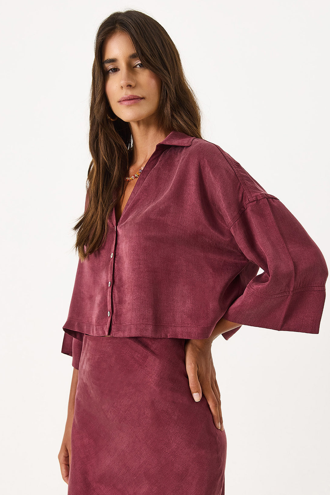 Kadın Kısa Kollu Lyocell Saten Gömlek - Bordo