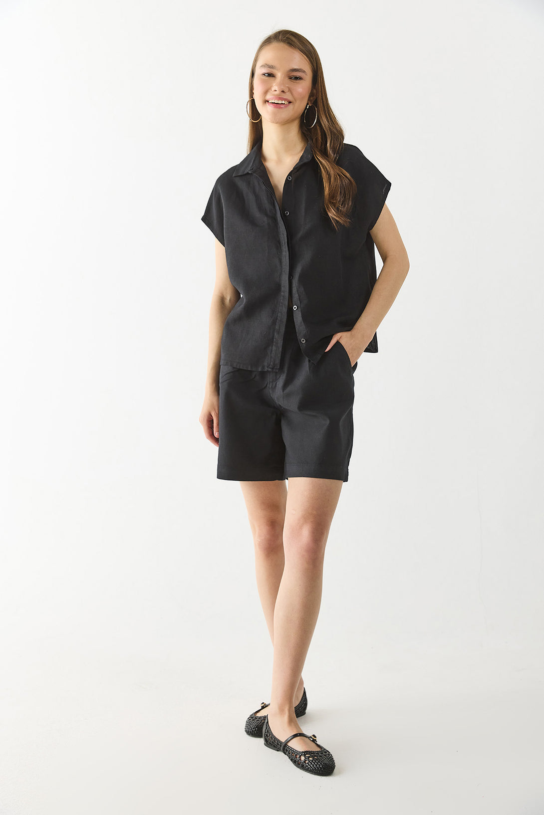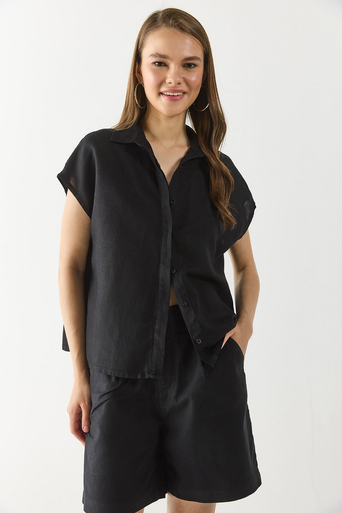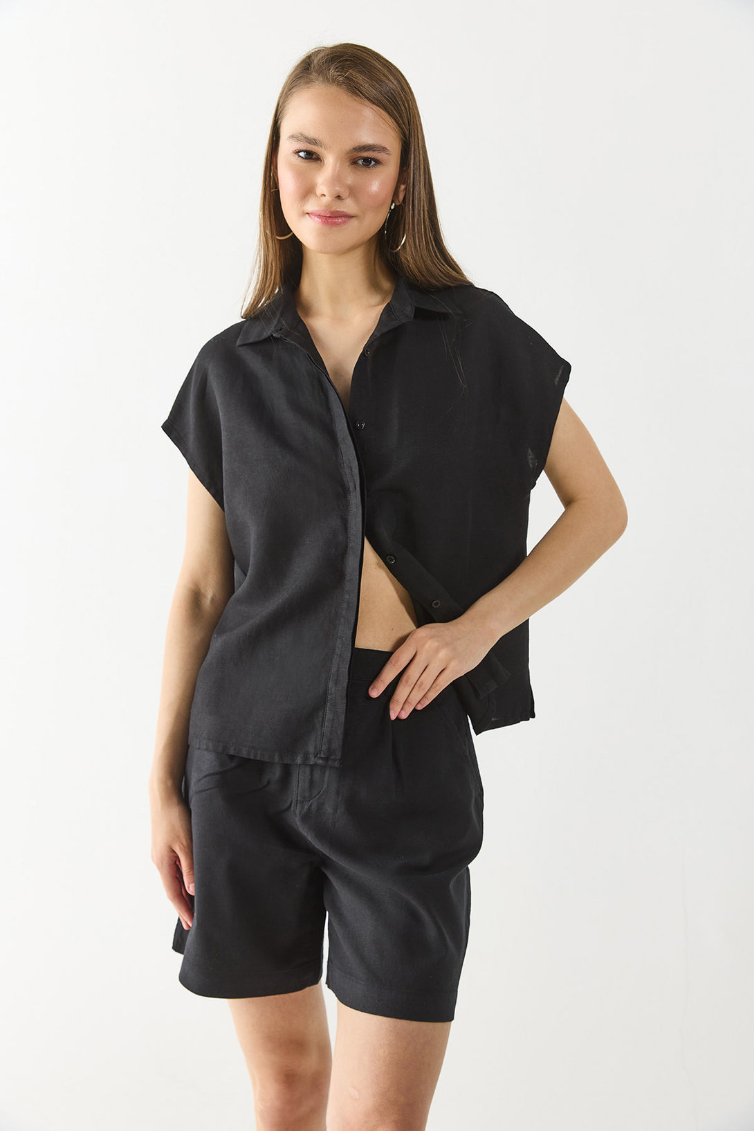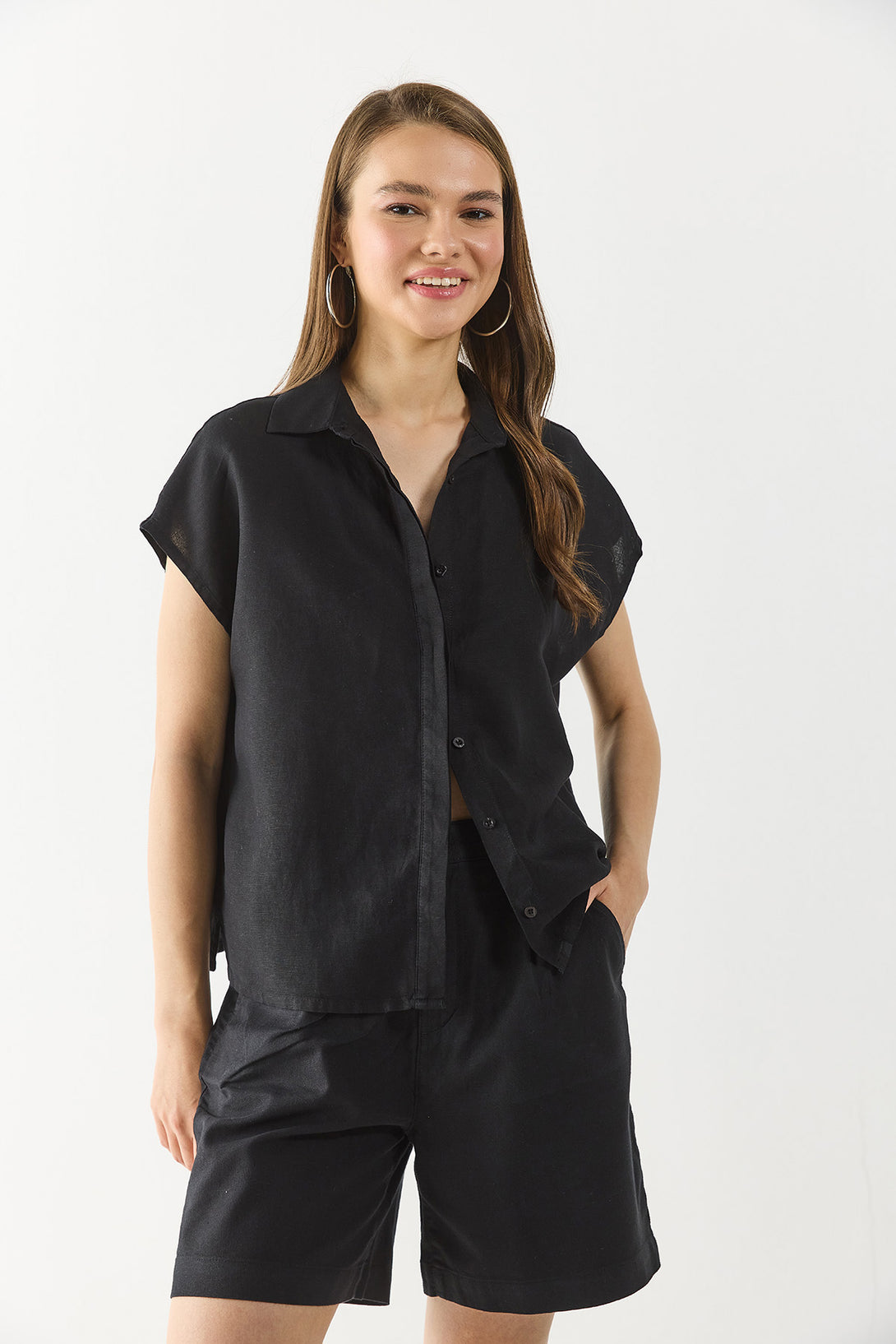 Kadın Kısa Kollu Regular Fit Keten Gömlek - Siyah