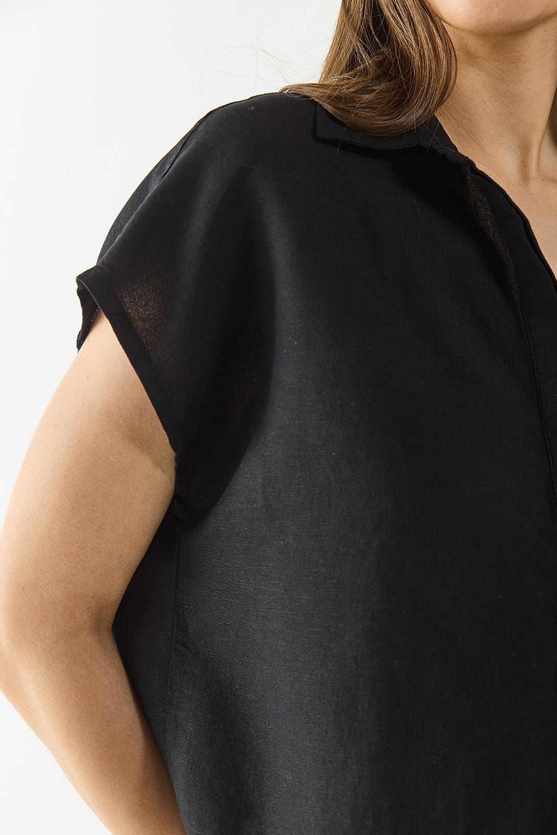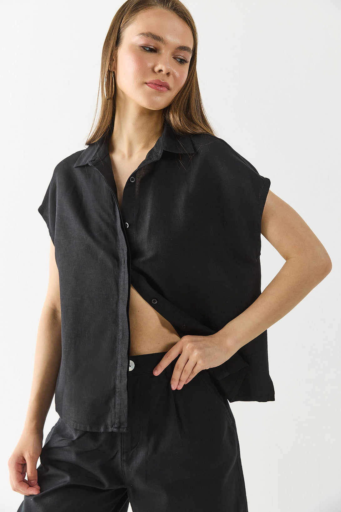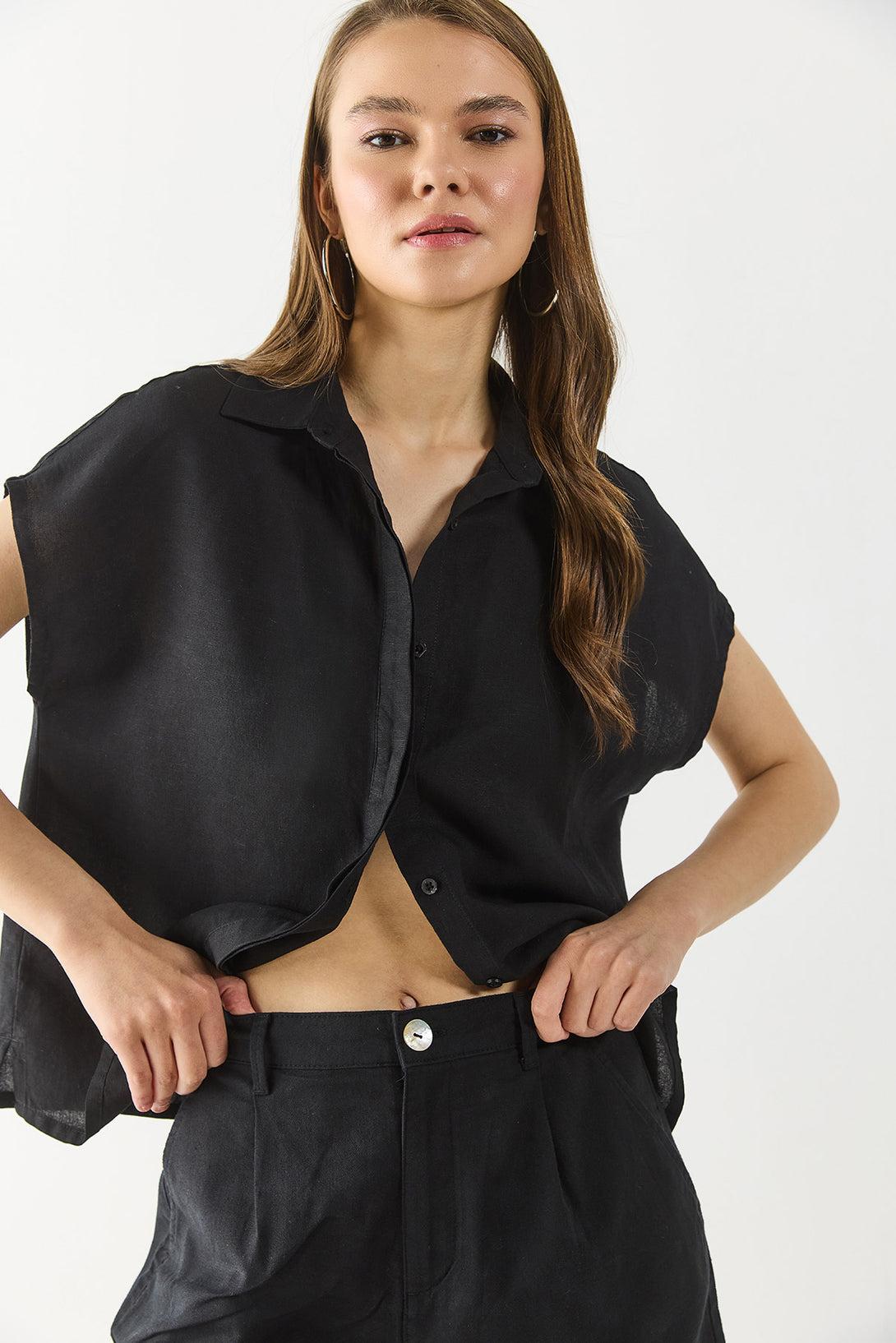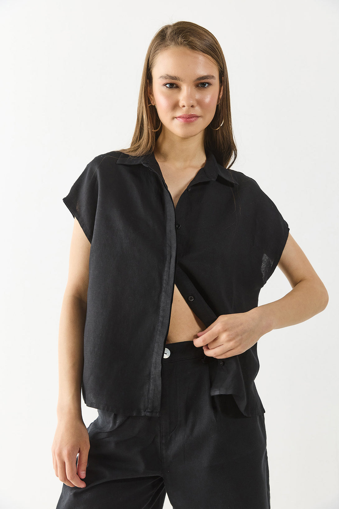 Kadın Kısa Kollu Regular Fit Keten Gömlek - Siyah