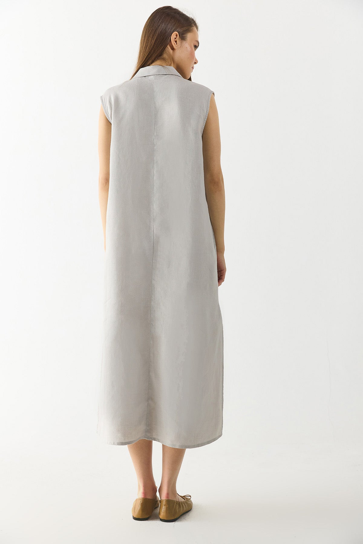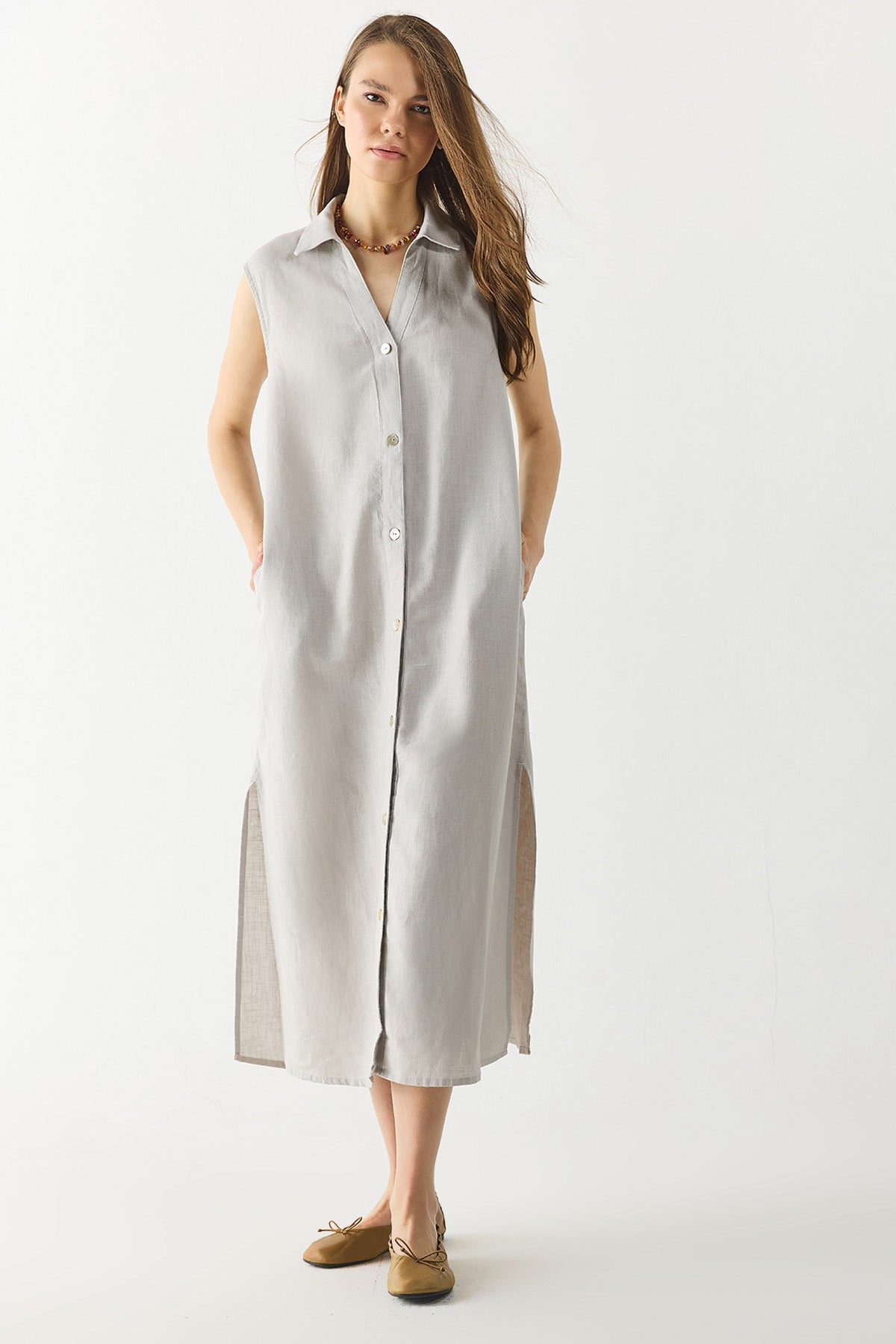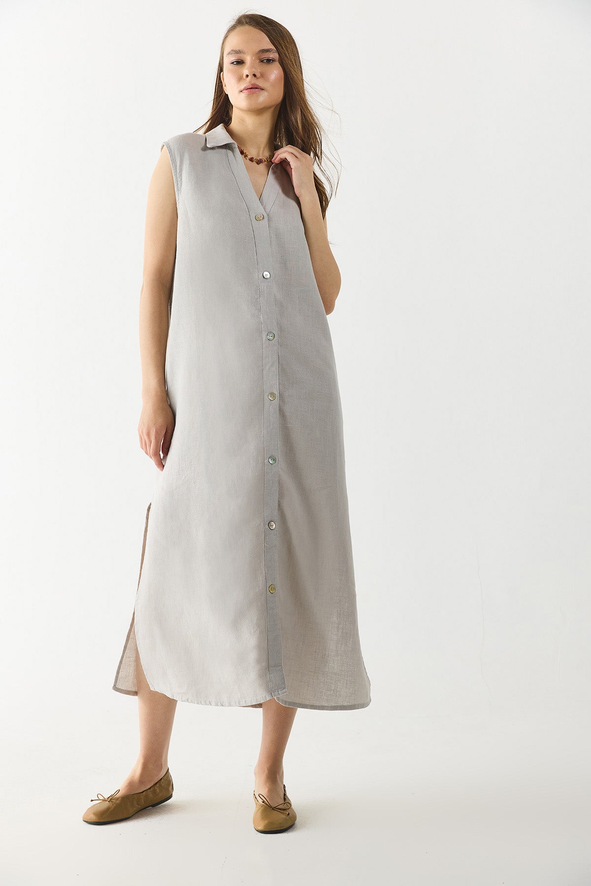Kadın Kolsuz Maxi Boy Elbise %100 Keten - Taş