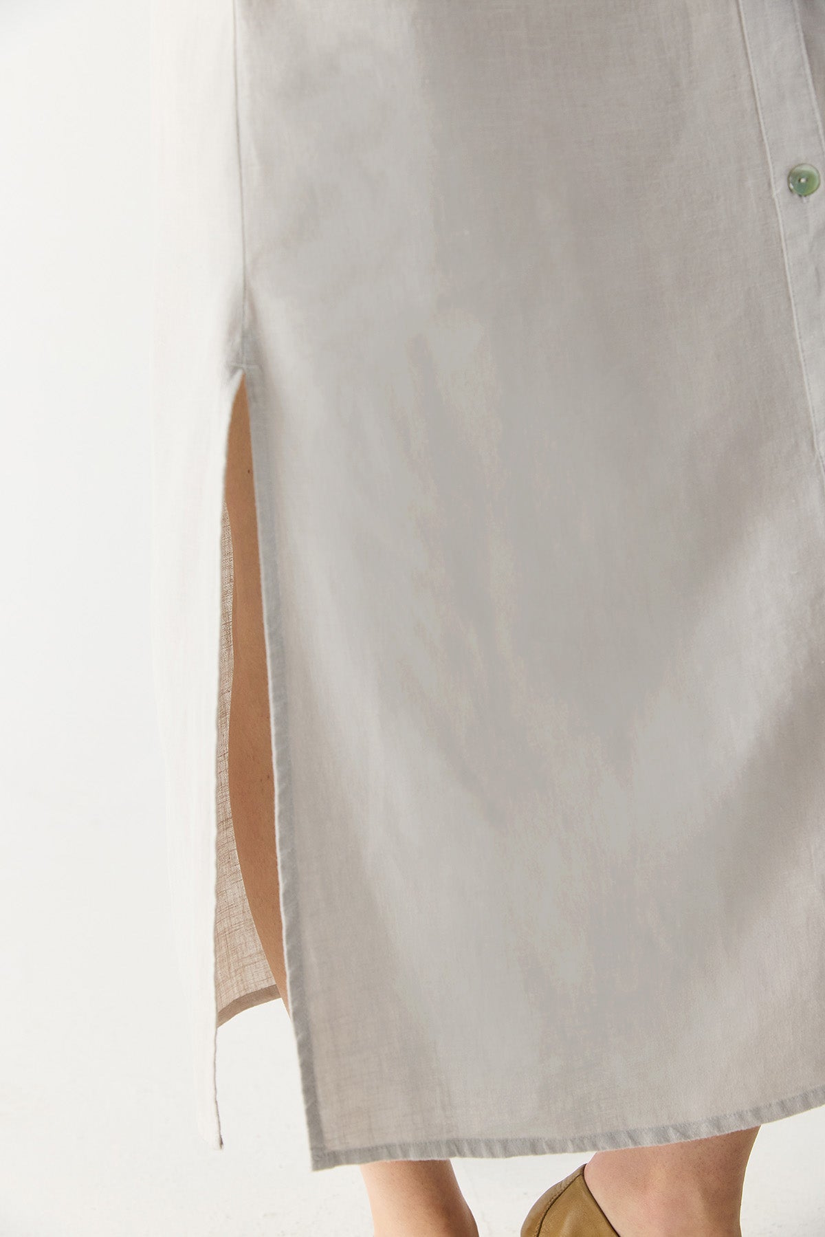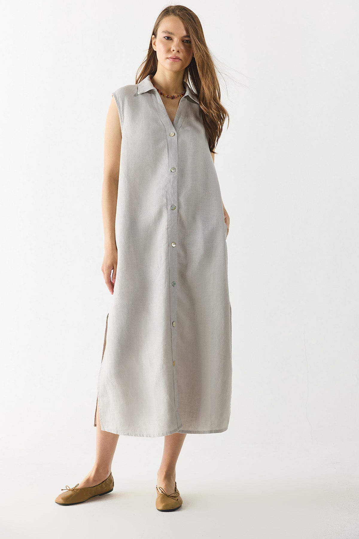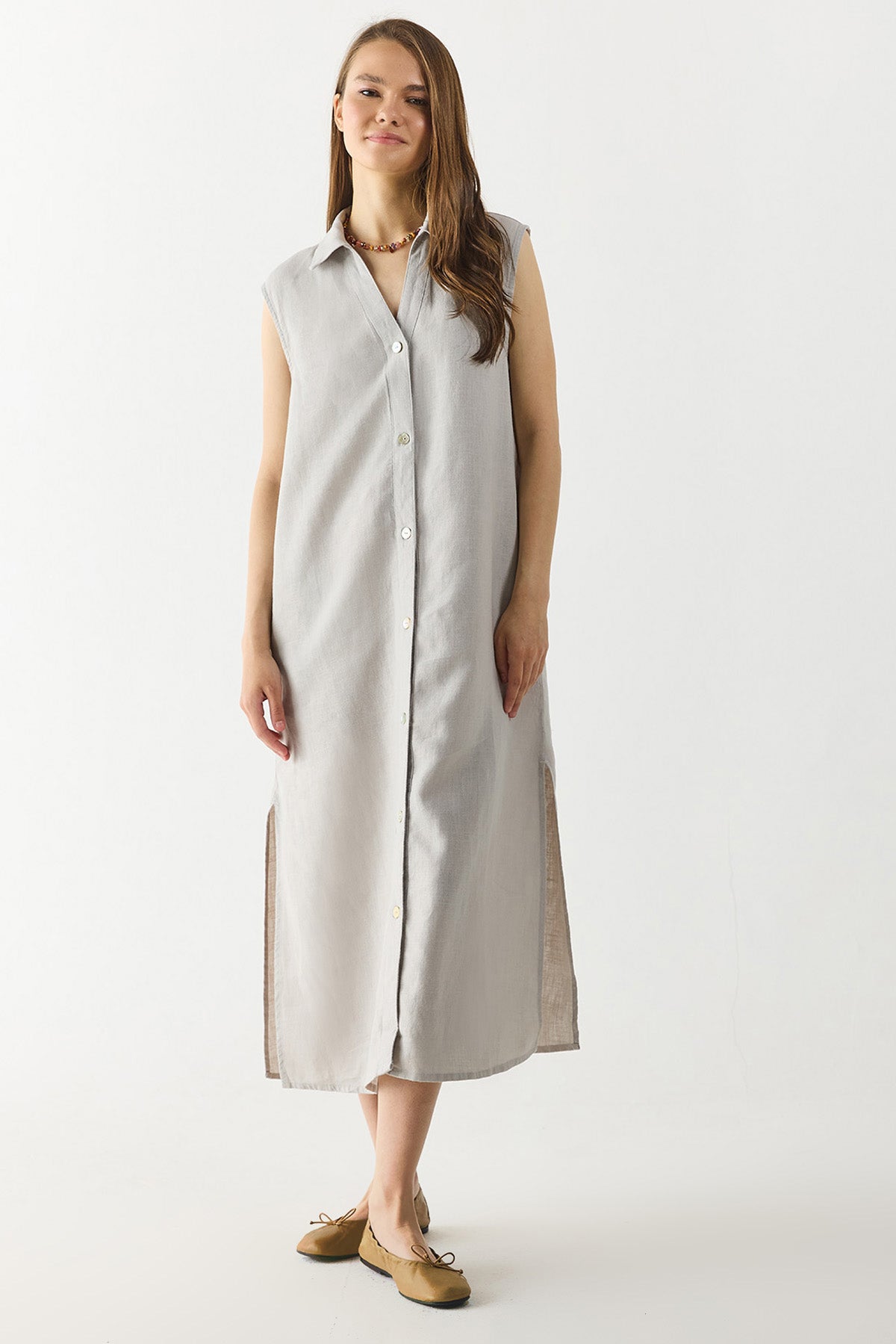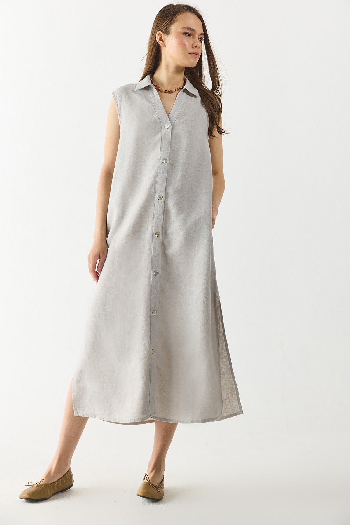 Kadın Kolsuz Maxi Boy Elbise %100 Keten - Taş