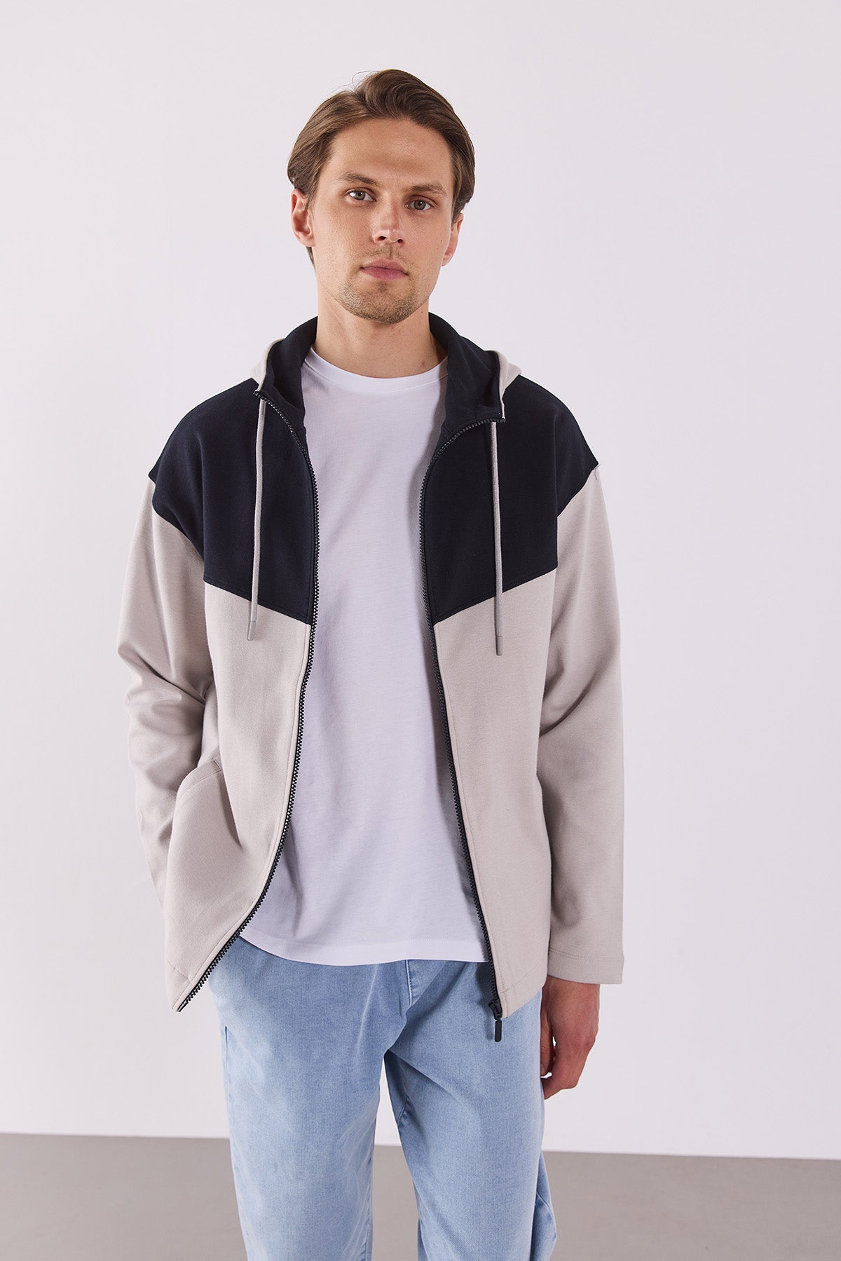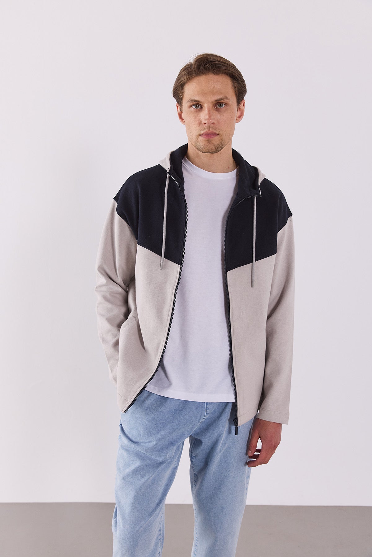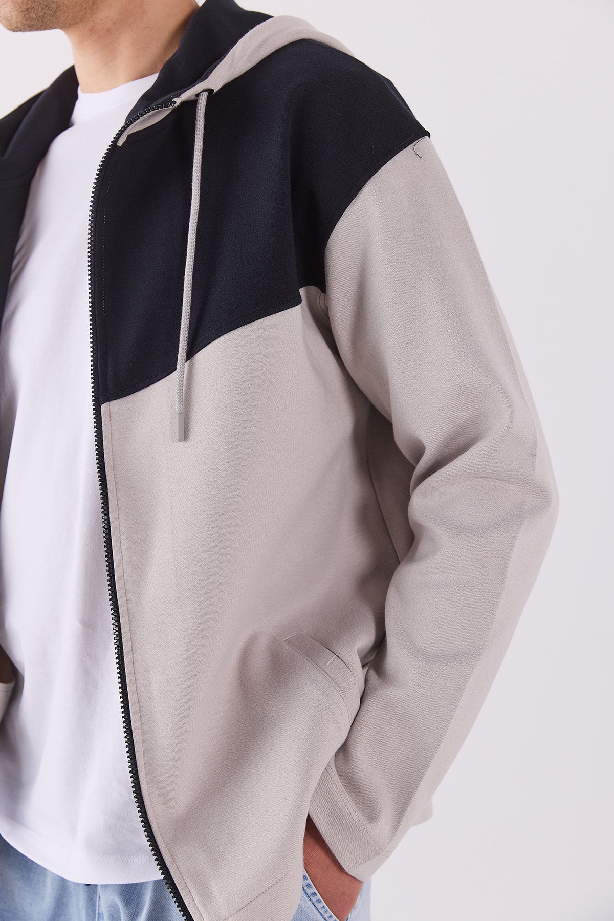 Erkek Kontrast Parçalı Kapüşonlu Teknik Ceket - Buz Gri